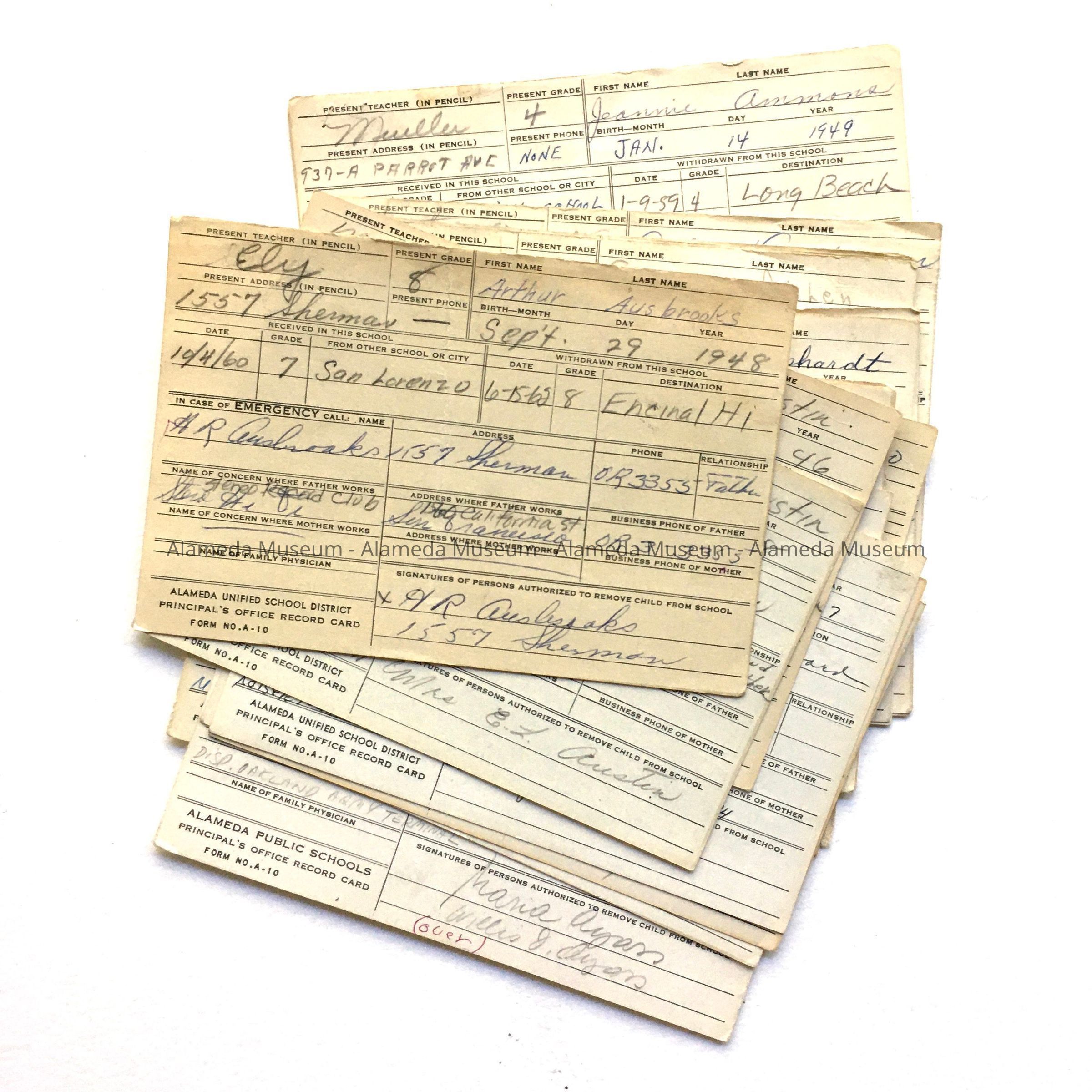 Description: Cards with one-side pre-printed with lines and headings, filled out by hand. Left bottom corner states: Alameda Unified School District / Principal's Office Record Card / Form No. A-10. Headings include Present Teacher, First Name, Last name, Received in this School, Withdrawn from this School. Stack is sorted alphabetically by last name, from Ausbrooks (Arthur, born 1948, to Alcorn (Marilyn, born 1954).