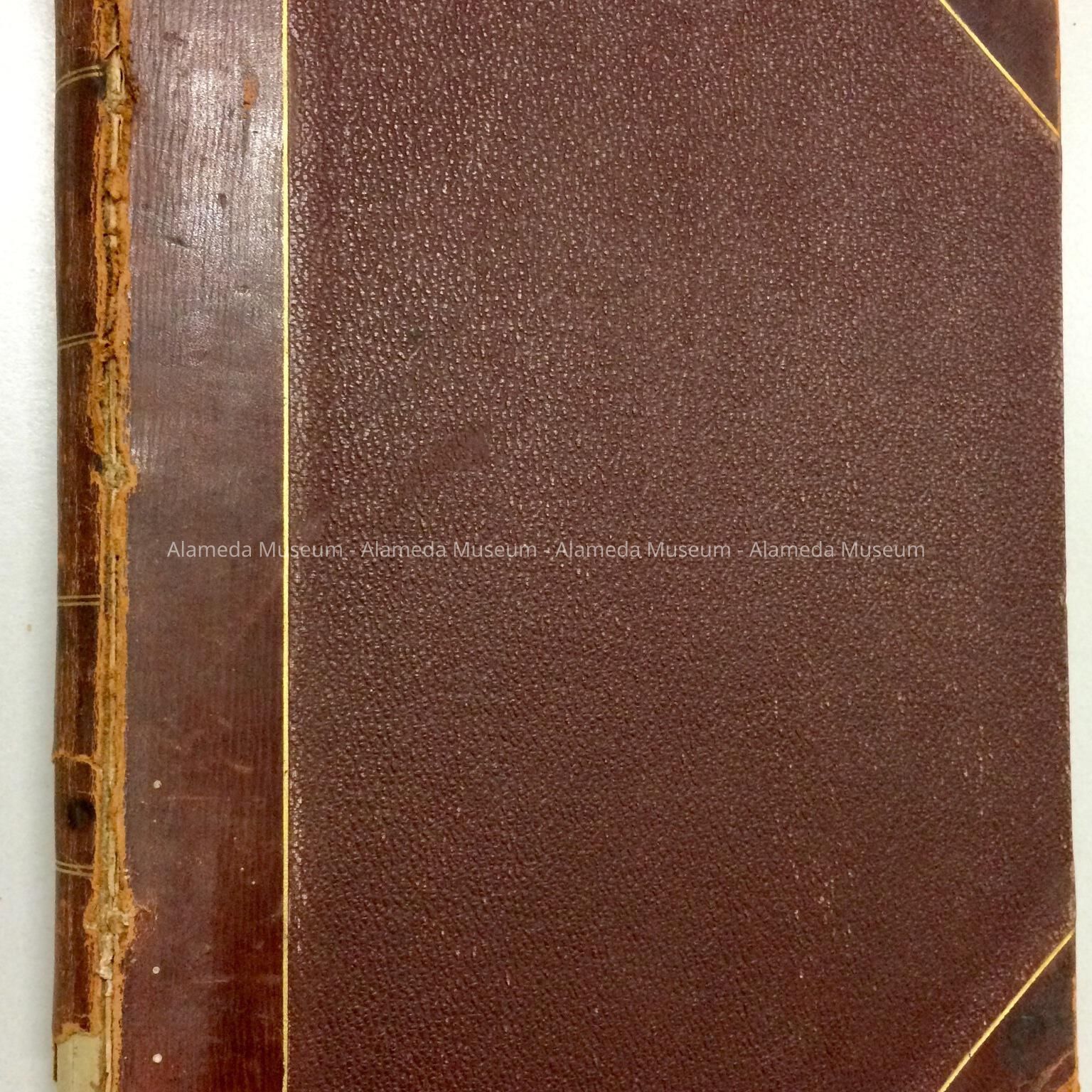 TYPEWRITTEN JOURNAL, WITH SEPIA-TINTED PHOTOGRAPHIC ILLUSTRATIONS WHICH HAVE BEEN HAND-BOUND. COVER OF BROWN-COLORED BUCKRAM, TRIMMED IN BROWN-COLORED LEATHER ACCENTUATED IN GOLD. TITLE PAGE IS HAND-ILLUSTRATED IN 'BLACK-, BLUE-, AND RED COLORED INK (CAPTIONS). TITLE READS, "VACATION TRIP, CALIFORNIA, SUMMER 1897, HERBERT CLARK, JULY 1897."