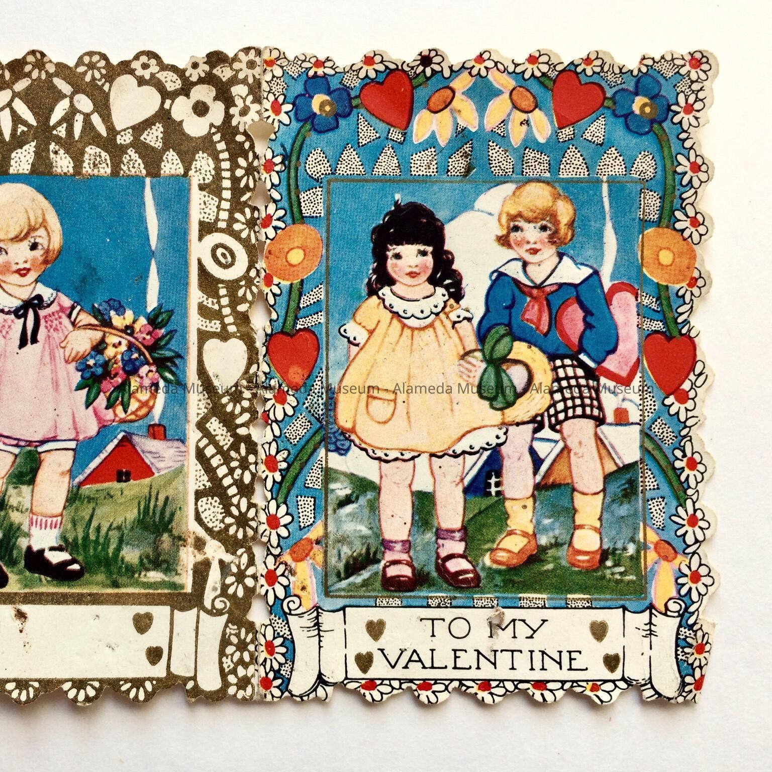 A VALENTINE (2-PAGE), WITH ILLUSTRATED FRONT AND BACK COVERS. ILLUSTRATIONS INCLUDE CHILDREN IN PERIOD-STYLE ATTIRE,