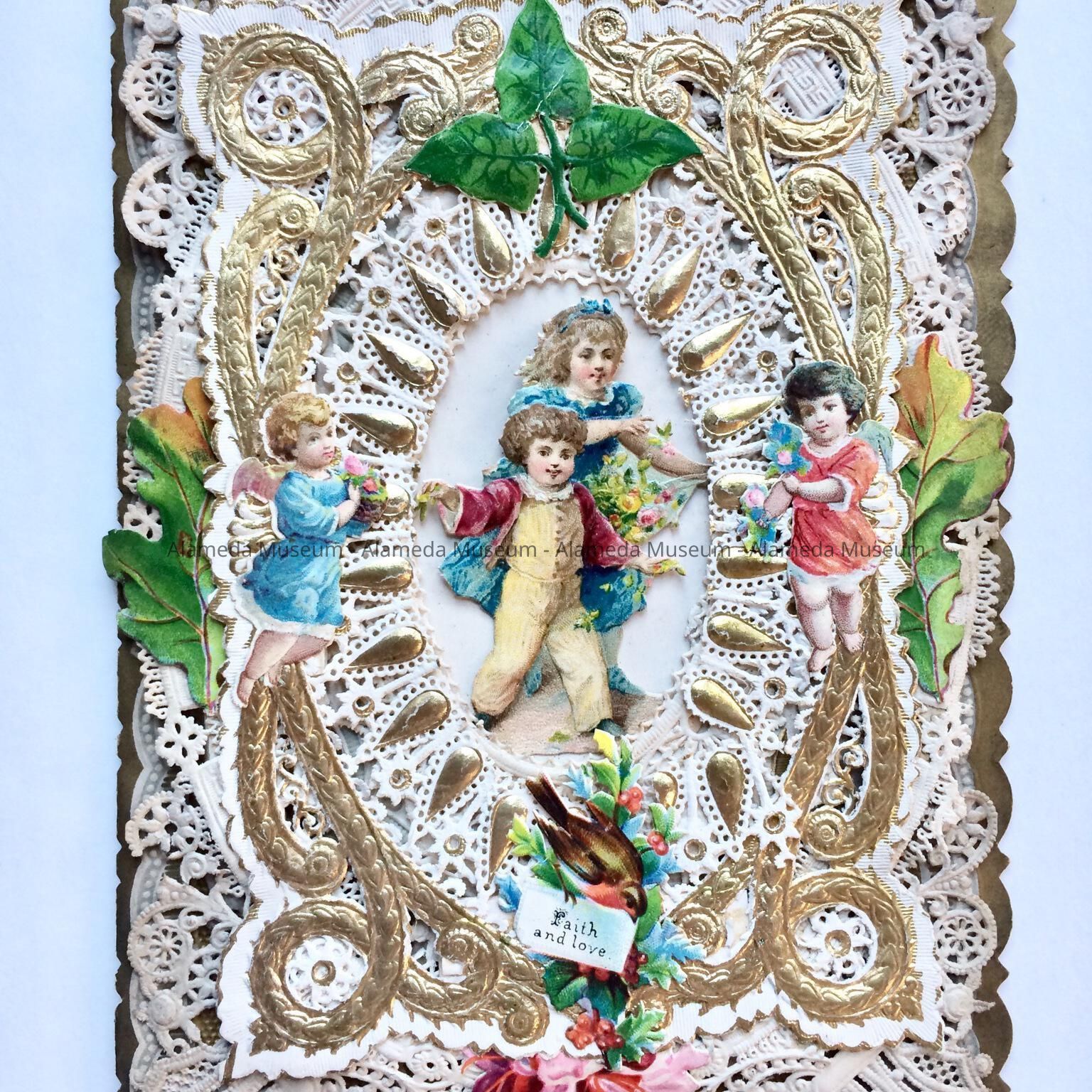 A-Elaborate Victorian style valentine, booklet type, with cover composed of paper lace and colorful embossed paper cutouts, central motif of children scattering flowers. Interior of card contains message printed in ornate type with decorative border in the Eastlake style.