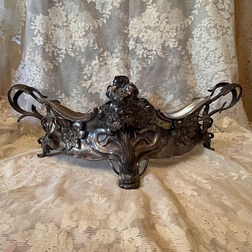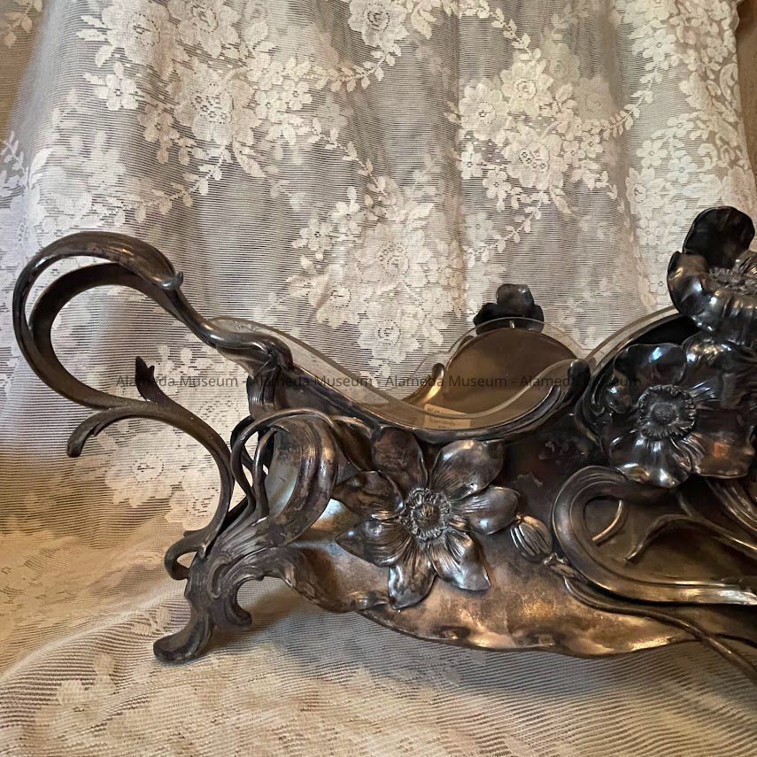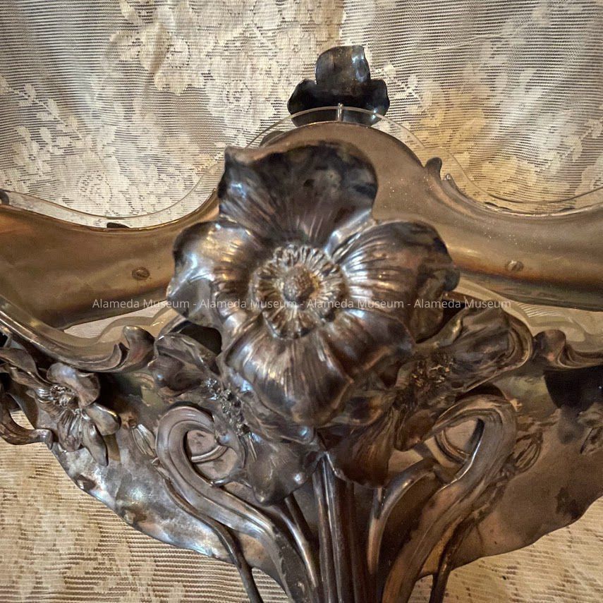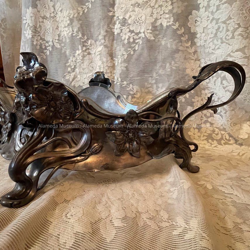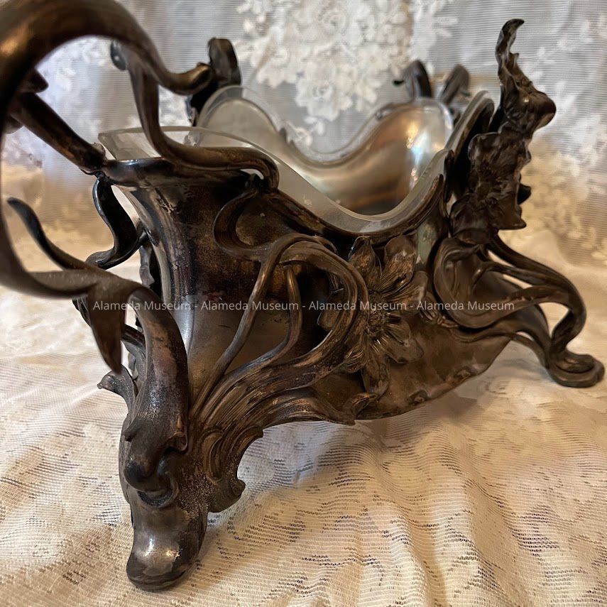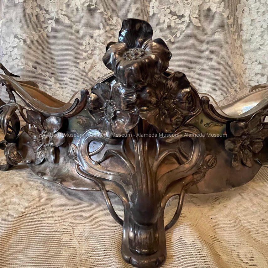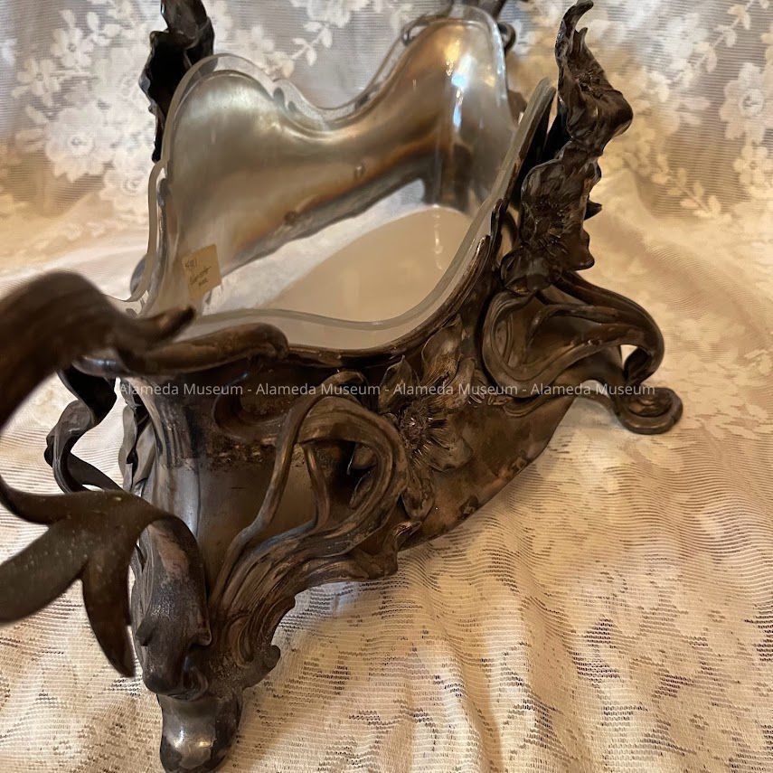 OBLONG-SHAPED VASE, WITH SILVER-PLATED FRAME. LINER OF CLEAR GLASS IS REMOVABLE. THE SILVER-PLATED SECTION RESTS ON FOUR FEET, AND HAS ATTACHED HANDLES AND APPLIED FLOWERS, ENTWINING STEMS, AND TENDRILS IN THE ART NOUVEAU STYLE. VASE CENTERPIECE WAS MANUFACTURED IN AUSTRIA.