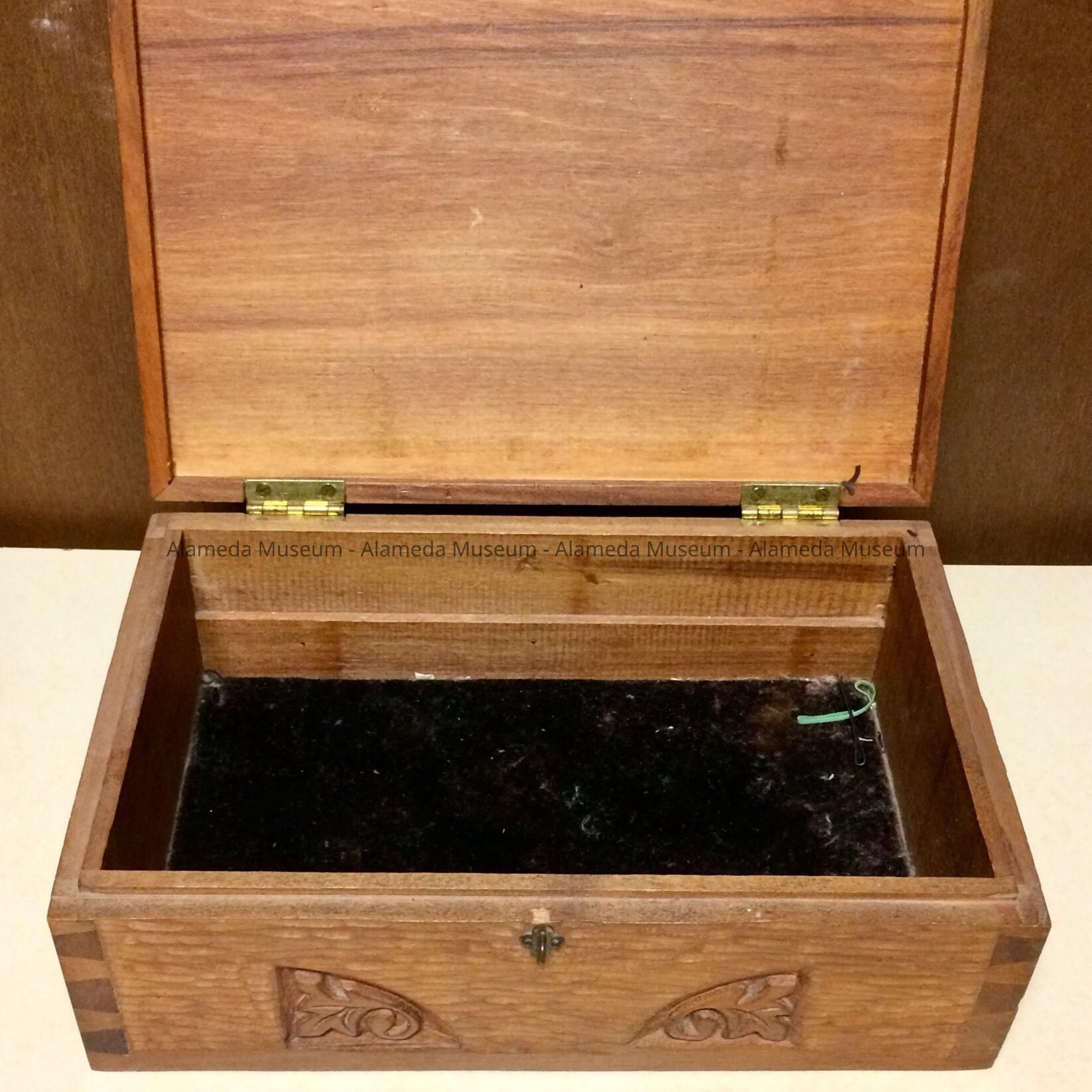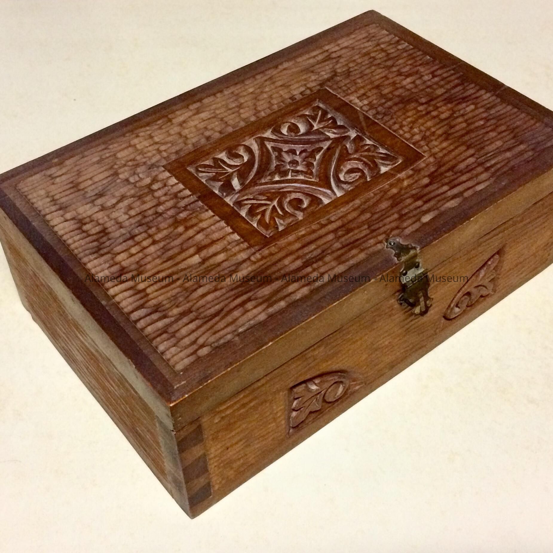Description: A wooden box with a hinged lid. The lid is secured with a brass hasp. The lid and three of the box's sides appear to be made of hand-carved wood from an unknown species.