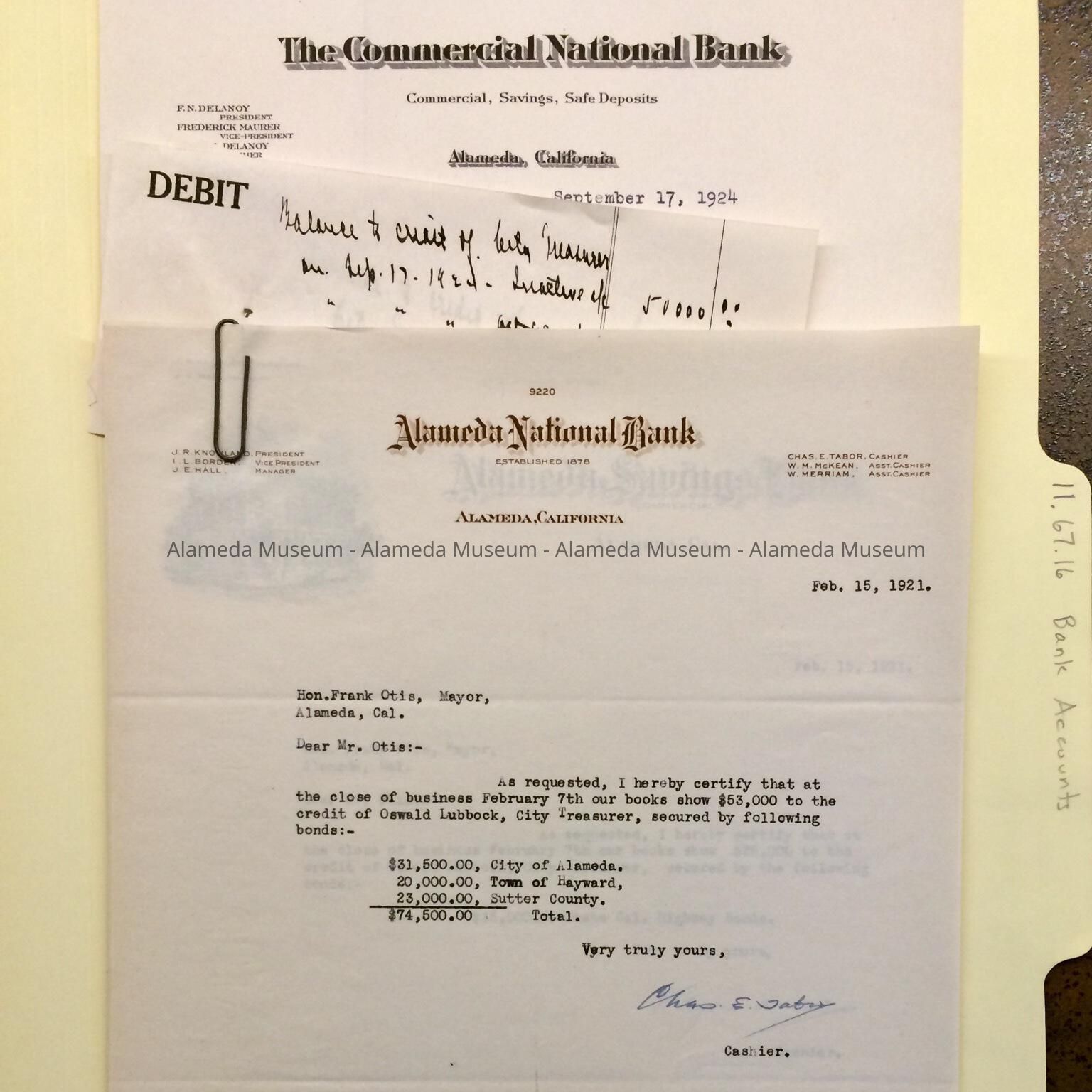 Documents found in the attic of City Hall. Documents in this folder reflect the response to a request from the Mayor, Frank Otis, from various banks indicating how much funds are available in bonds on name of the City Treasurer - Oswald Lubbock in 1921, Leon H. Ader in 24. Responses are on stationery from Alameda National Bank, Alameda Savings Bank, Citizens National Bank and Citizens Savings Bank (1921) and the commercial National Bank (1924).