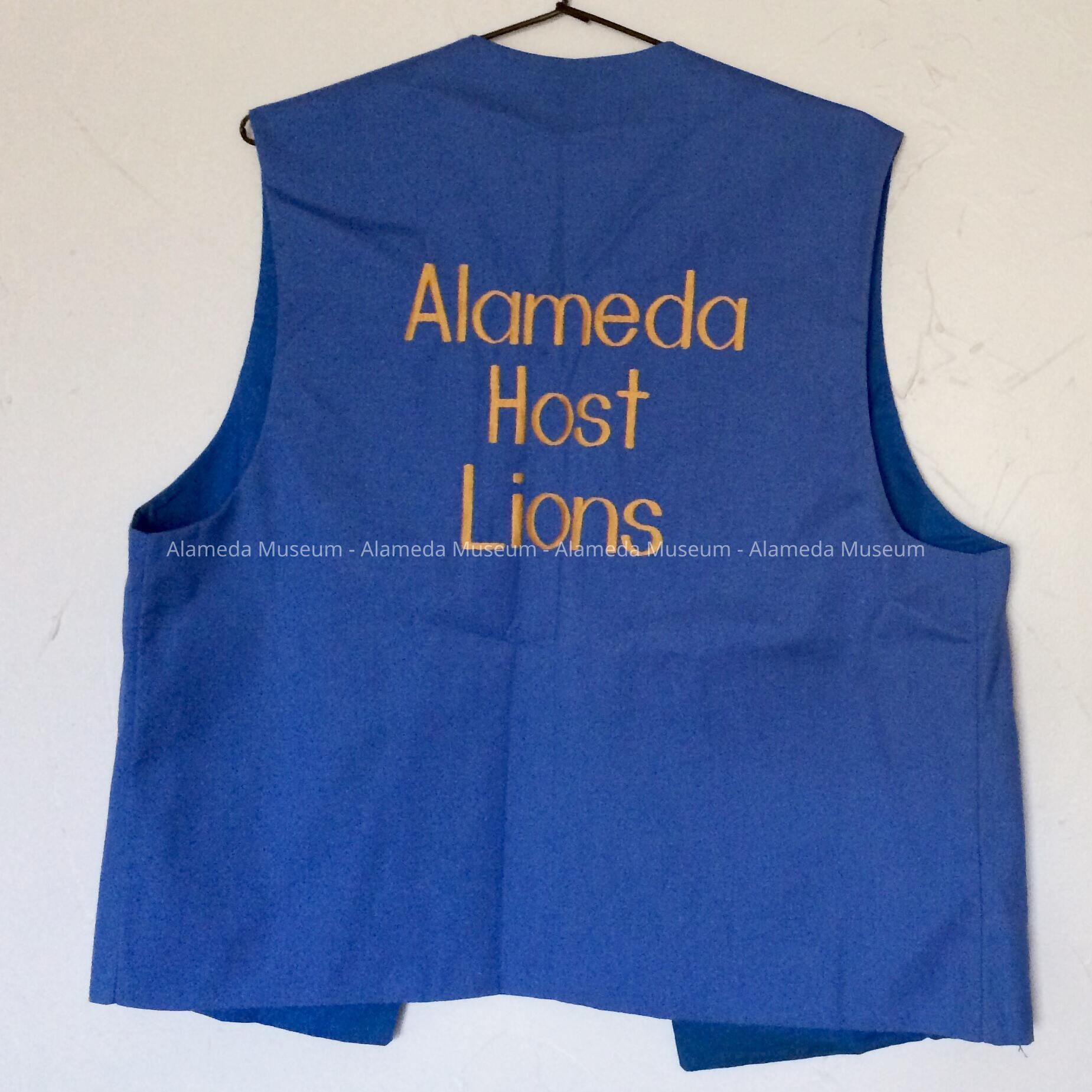 Description: Blue colored polyester vest with embroidered appliqué patch. The back of the vest has an embroidered caption in bold print 'Alameda Host Lions'.