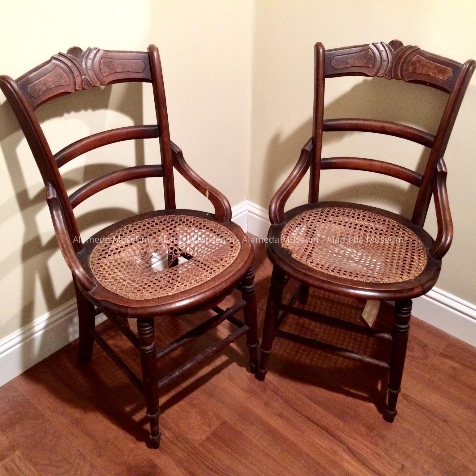 History of Object: Chairs originally owned by Mrs. Emma Crosby, great grandmother of the donor. The widow Crosby's later husband, Elisha, had served as Ambassador to Guatemala (1861-1864). The chairs became the property of their daughter, Leonie, who married Joseph Kahn, supervisor at the Alameda Electric Light Company at the foot of Park Street. They were subsequently given to their daughter, Ray, mother of the donor.