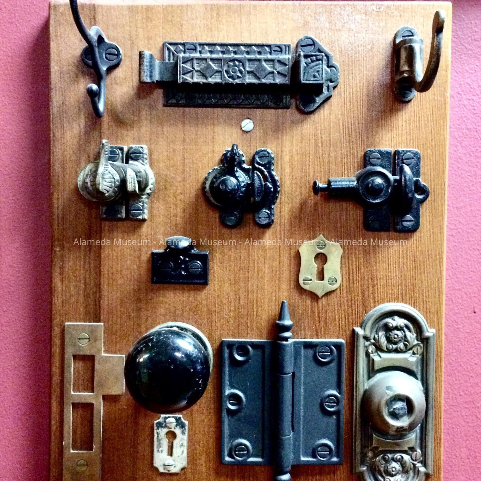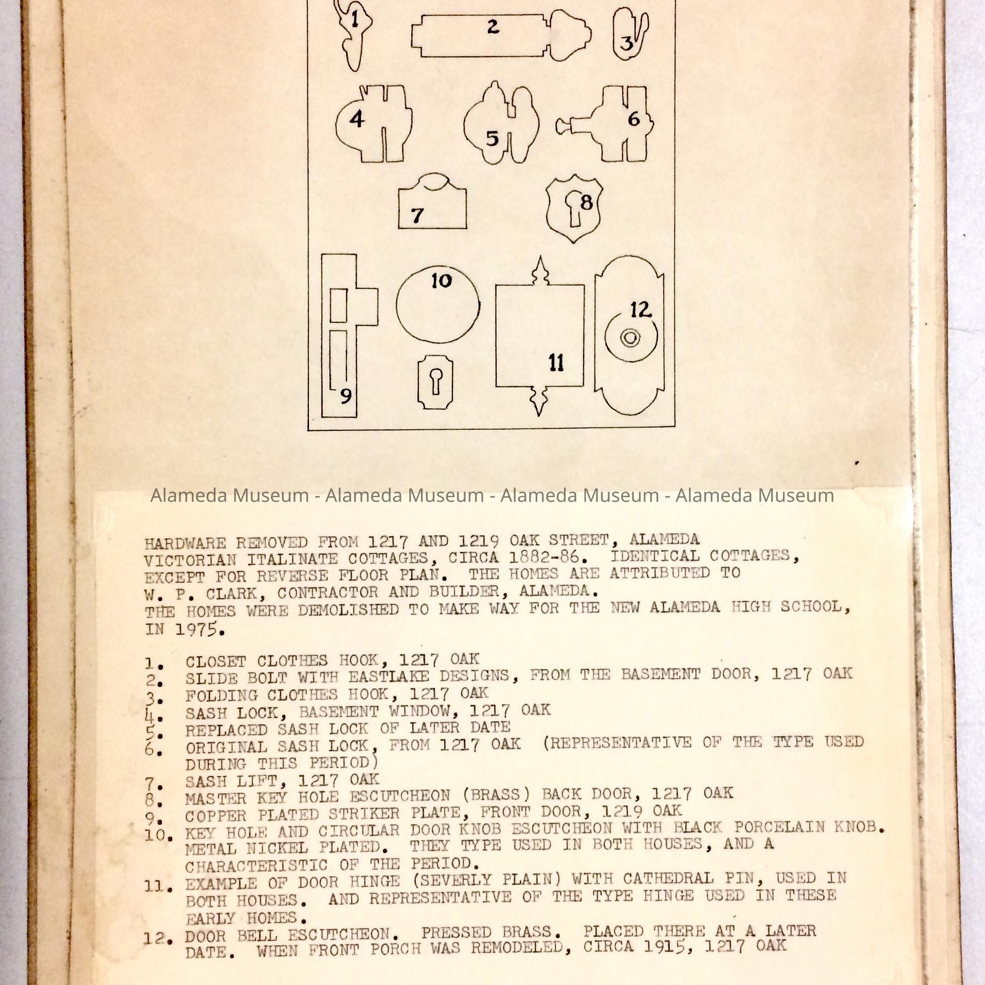 HARDWARE REMOVED FROM 1217 AND 1219 OAK STREET, ALAMEDA. VICTORIAN ITALIANATE COTTAGES, CIRCA 1882-86. IDENTICAL COTTAGES, EXCEPT FOR REVERSE FLOOR PLAN. THE HOMES ARE ATTRIBUTED TO W. P. CLARK, CONTRACTOR AND BUILDER, ALAMEDA. THE HOMES WERE DEMOLISHED TO MAKE WAY FOR THE NEW ALAMEDA HIGH SCHOOL, IN 1975.