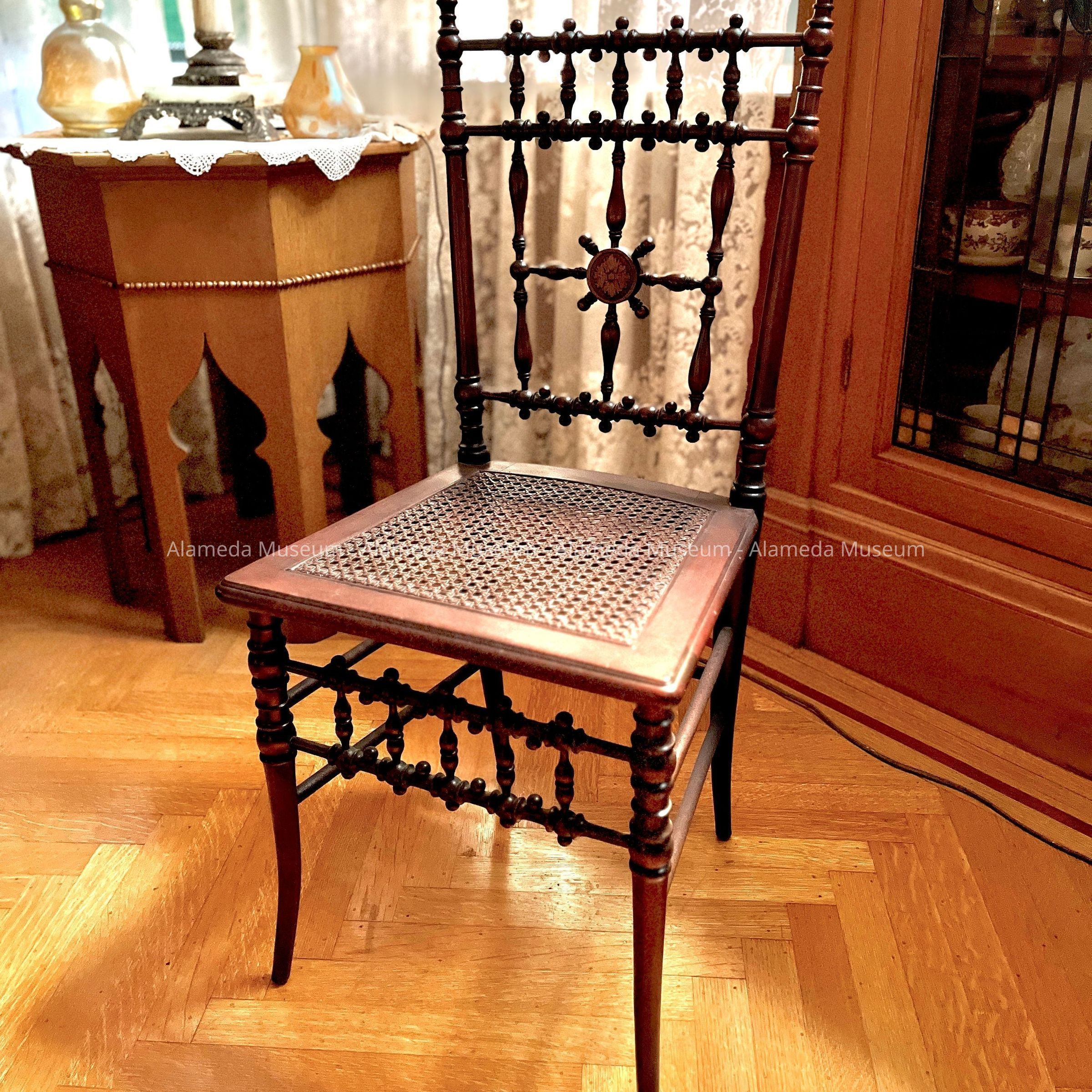 A VICTORIAN RECEPTION CHAIR THAT BELONGED TO MARY C GANDYRA (BORN 1901; DIED 1989) OF 2233 SAN JOSE AVE, ALAMEDA. AS QUOTED BY HER DAUGHTER, "LONGTIME RESIDENT OF THE CITY, A COLORFUL WOMAN WHO OWNED AND RENTED 5 HOMES ON SAN JOSE AVENUE DURING WW-II AND WHO DROVE A MODEL 'A' FORD."