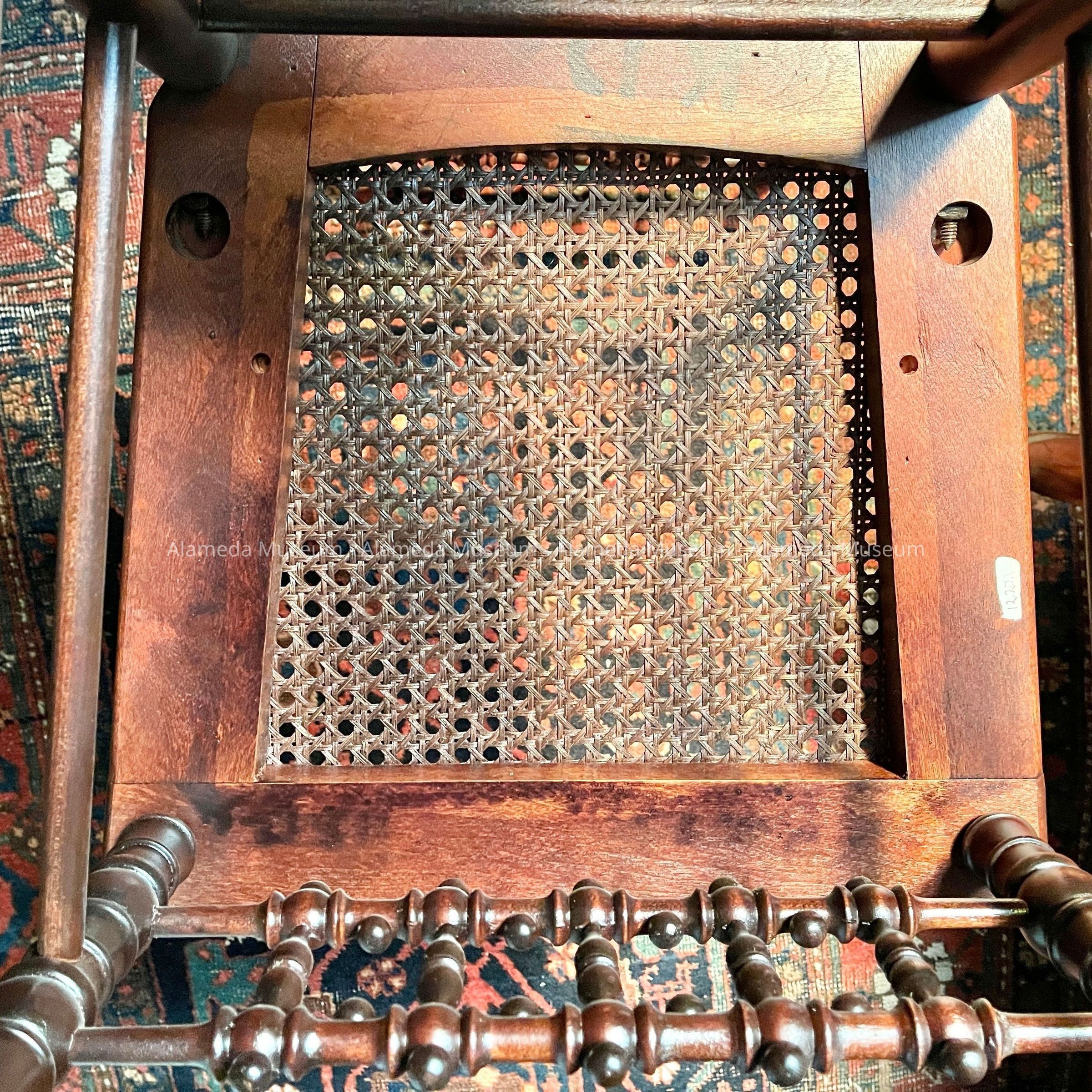 RECEPTION CHAIR, WITH SQUARED SEAT MACHINE CANING. STILE AND FRONT CHAIR LEGS ARE LATHE-TURNED. BACK OF CHAIR HAS ORNATE BOBBIN TURNINGS, WITH A CENTRAL MOTIF OF A STYLIZED FLOWER. CHAIR HAS DARK CHERRY STAIN WHICH APPEARS TO BE OF BIRCH WOOD.