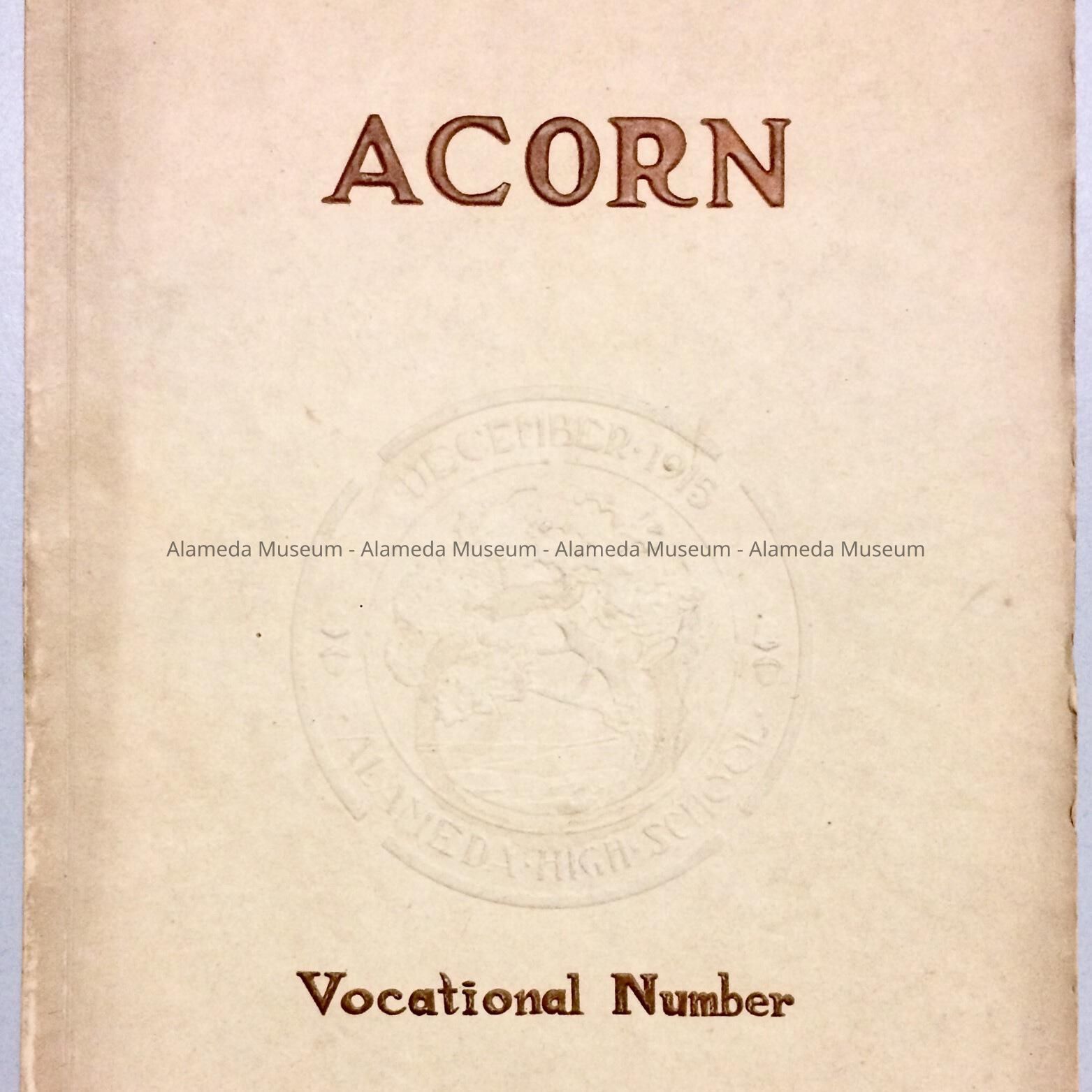 HISTORY OF OBJECT: A SPECIAL VOCATIONAL EDITION OF THE ALAMEDA HIGH SCHOOL "ACORN" FOR 1915. CONTENTS INCLUDE REPORTS OF STUDENT INVOLVEMENT IN VARIOUS VOCATIONAL CLASSES AND PORTRAITS OF THE GRADUATES.