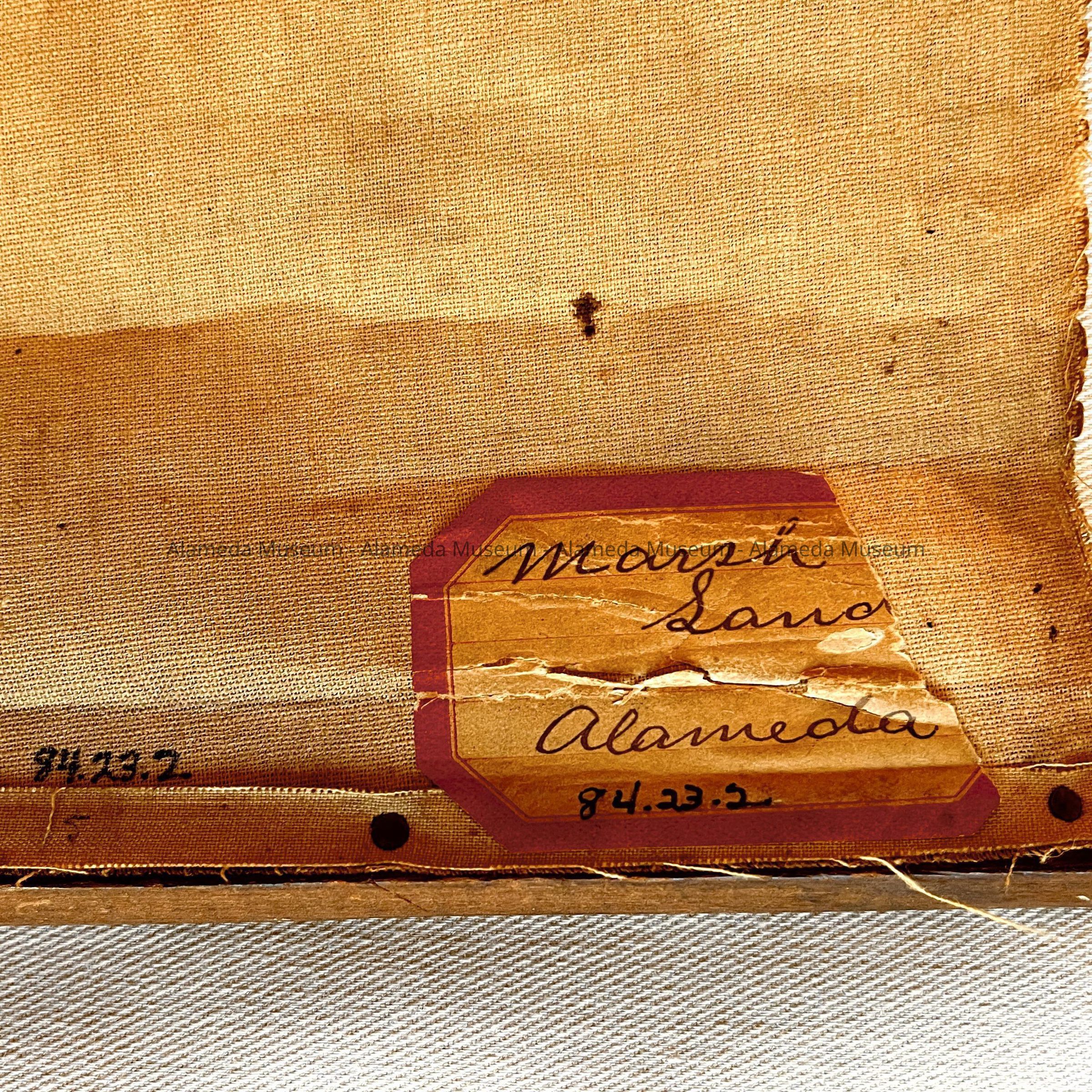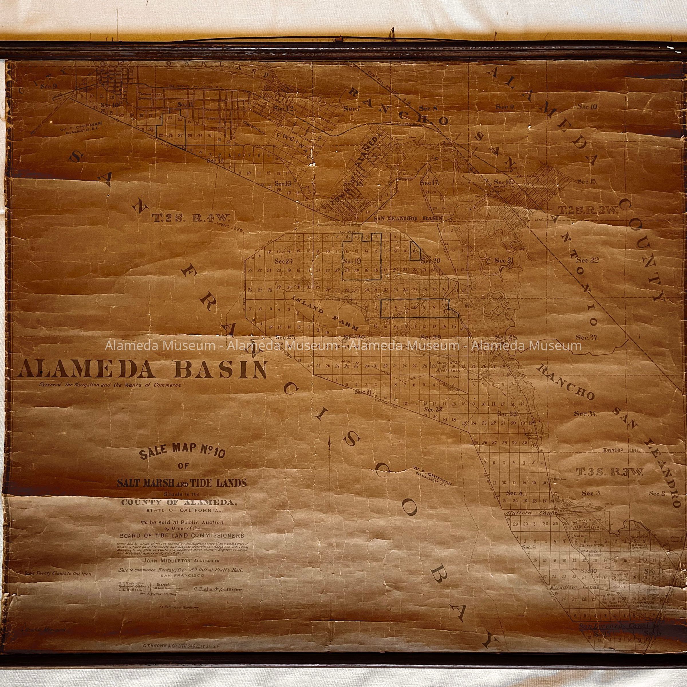 Printed map mounted on a linen backing and attached to wooden rods for hanging. Map was printed by G. T. Brown and Company, lithographers, 540 Clay Street, San Francisco. Map is No. 10 of Salt marsh and tidelands situated in the County of Alameda, State of California, and depicts tide and marshlands of Alameda Bay Farm Island. Map is rubber stamped stating "W. F. Chipman, 625 Market Street, San Francisco". W. F. Chipman was the son of W. W. Chipman, co-purchaser-co-founder of Alameda.