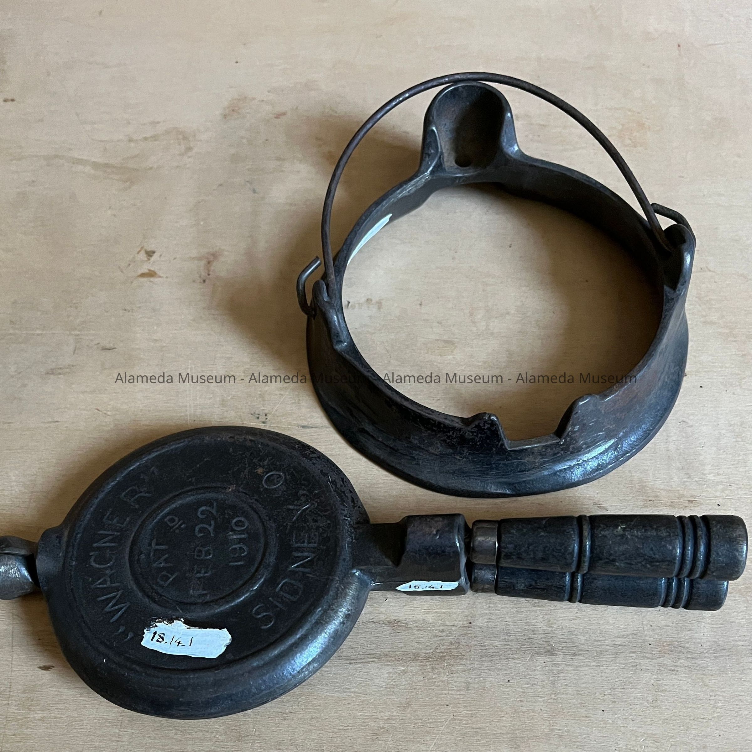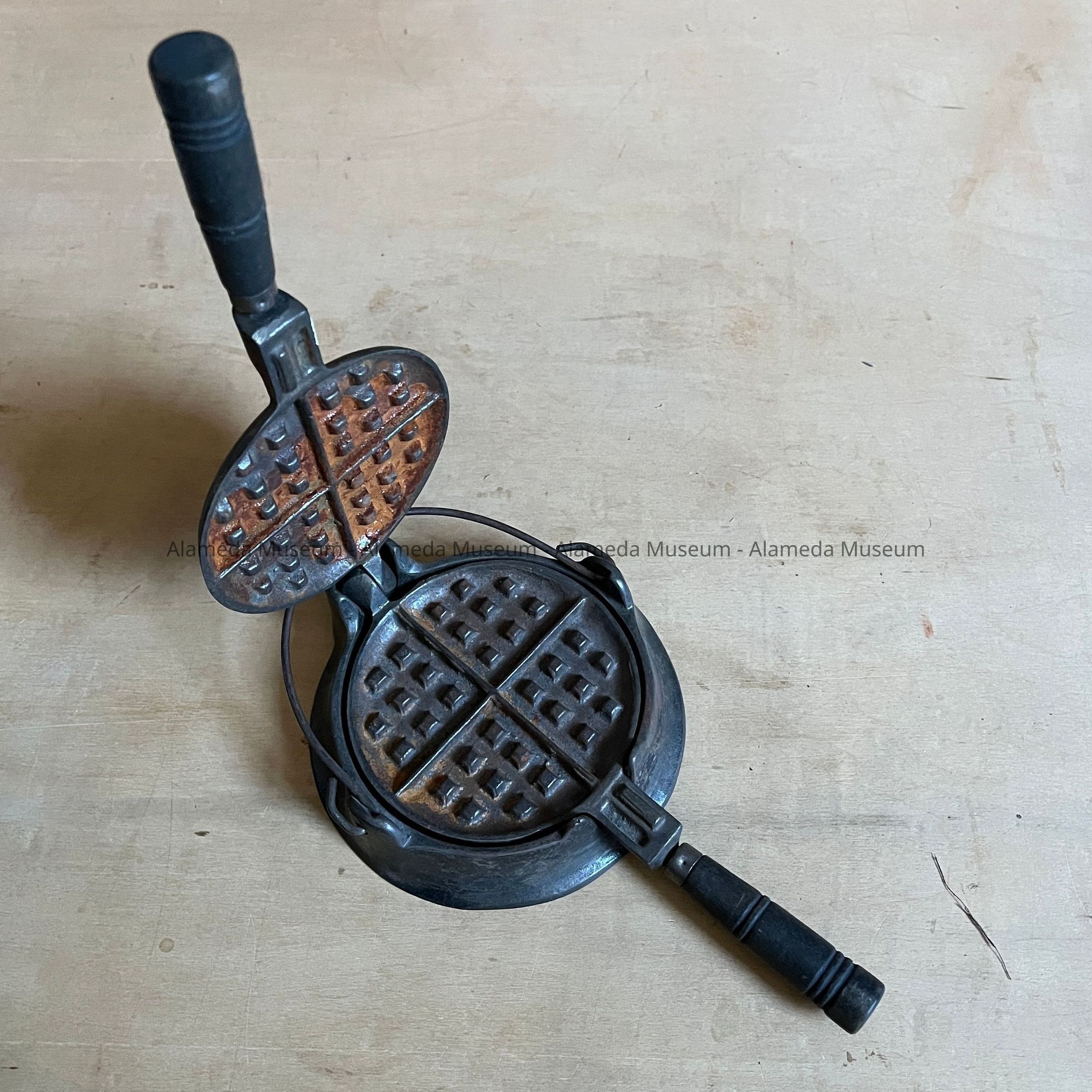 History of Object: A toy or salesman's sample of an early-type cast iron waffle that was heated on a stove. It was owned by Herlinda Silver who later had a business at 920 Central Avenue, next door to Hoffman's Bakery. The donor states that the waffle iron was a salesman's sample.