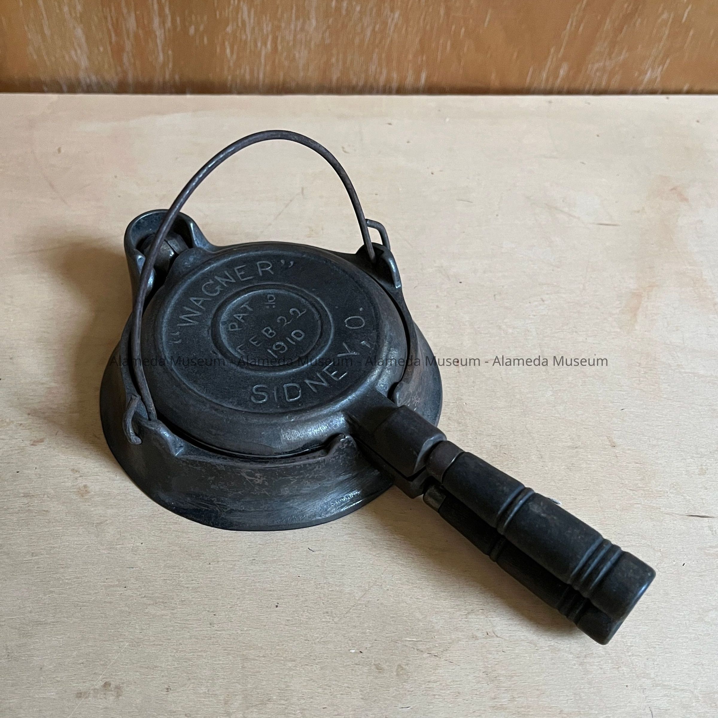 Description: A cast-iron circular shaped base with a bail handle that supports a removable waffle iron. The iron has wooden handles that are used to open the waffle iron. Both sides of the iron have the incised caption, "Wagner Sidney Ohio Patent, Feb. 22, 1910".