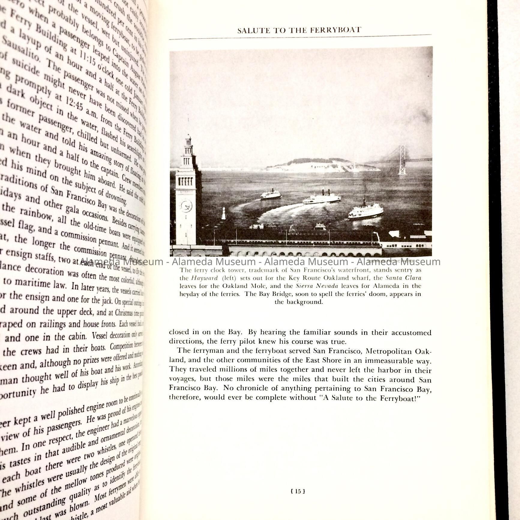 HISTORY OF OBJECT: A BOOK PRESENTING THE HISTORY OF FERRY BOATS THAT PLIED THE WATERS OF SAN FRANCISCO BAY AND ITS TRIBUTARIES. THE BOOK WAS RECEIVED FROM THE ESTATE OF ED FOWLER WHO LIVED HIS ENTIRE LIFE IN ALAMEDA, WITH THE EXCEPTION OF MILITARY SERVICE, IN THE FAMILY HOME AT 1210 PEARL STREET. MR. FOWLER JOINED THE U.S. NAVY SHORTLY FOLLOWING GRADUATION FROM ALAMEDA HIGH SCHOOL AND WAS STATIONED AT PEARL HARBOR, HAWAII WHEN IT WAS BOMBED IN DECEMBER 1941.