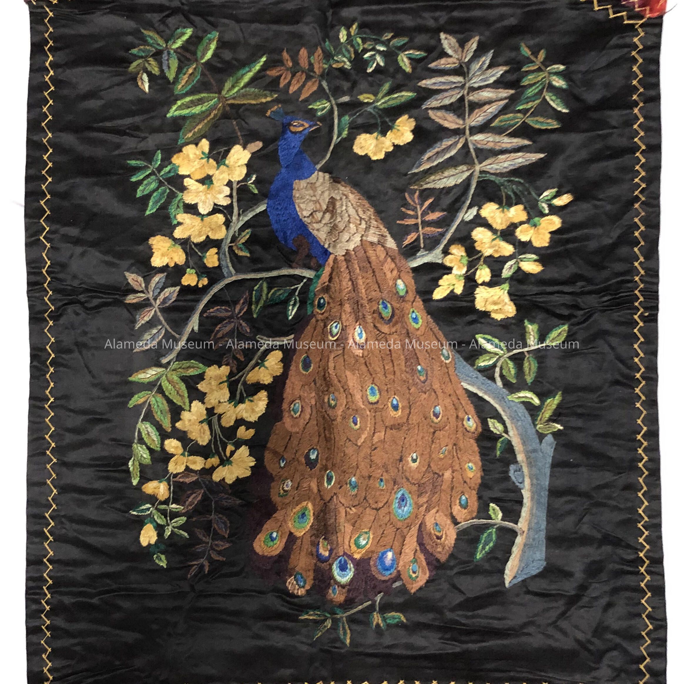 DESCRIPTION: A WALL BANNER CONSISTING OF A BLACK FABRIC FRAMED IN A STRIPED PLUSH MULTI-COLORED CENTRAL MOTIF. A BIRD IS PERCHED ON A BRANCH WITH YELLOW-COLORED BLOSSOMS AND GREEN-COLORED LEAVES. THE CENTRAL PANEL IS BORDERED IN A CROSS-STITCHED PATTERN IN GOLD SILK.