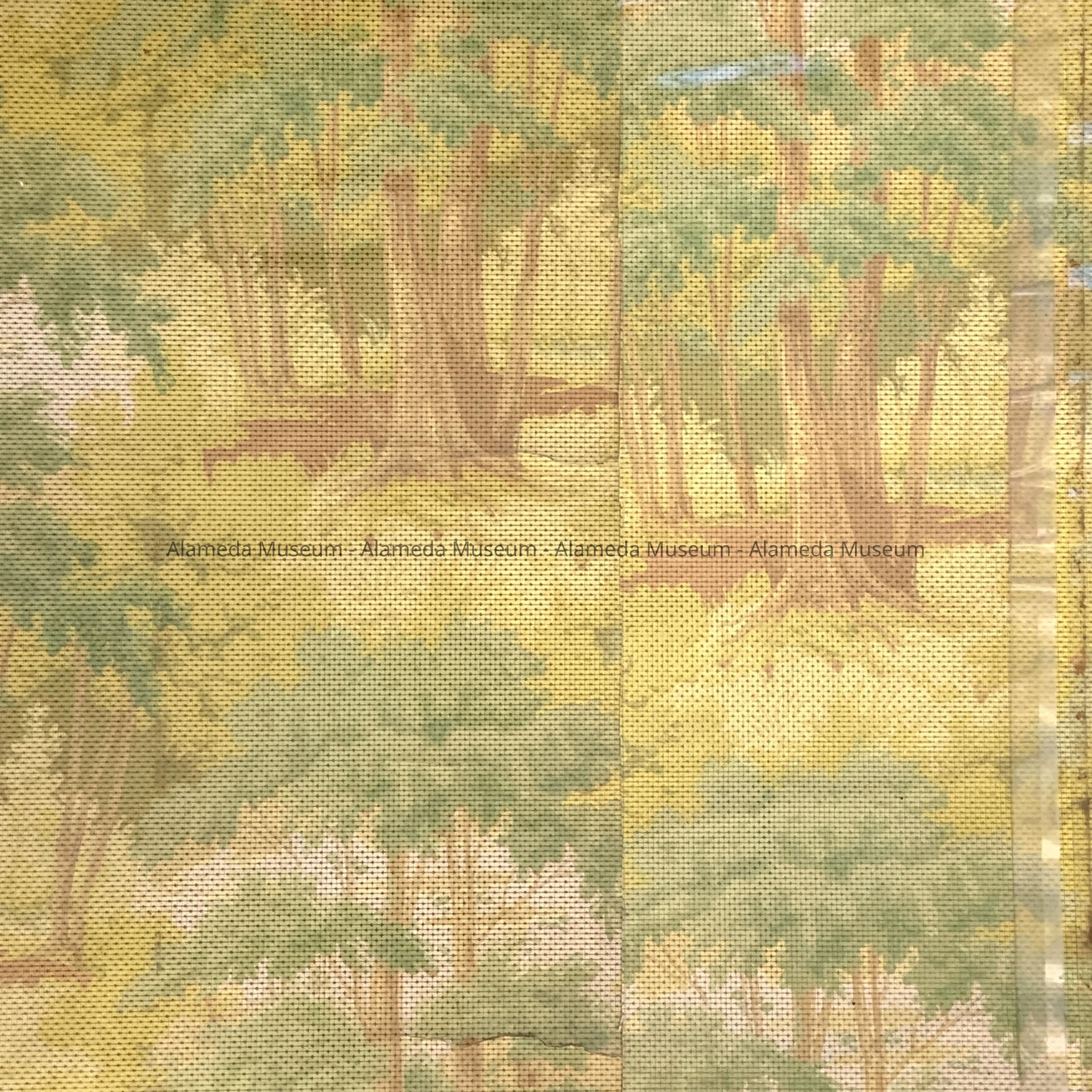 HISTORY OF OBJECT: THIS WALLPAPER WAS FOUND IN THE ATTIC OF 1523 MOZART STREET, ALAMEDA. A VICTORIAN EASTLAKE STYLE COTTAGE. BUILT IN 1885. FOR OTTO BREMER, A SAN FRANCISCO GUNSMITH, BY DENIS STRAUB, BUILDER, ALAMEDA. DESIGN ATTRIBUTED TO THE NEWS OM BROTHERS, ARCHITECTS, SAN FRANCISCO. IN 1913 THE PROPERTY WAS SOLD TO OSCAR BUSSE & FAMILY AND OCCUPIED BY THEM UNTIL 1975