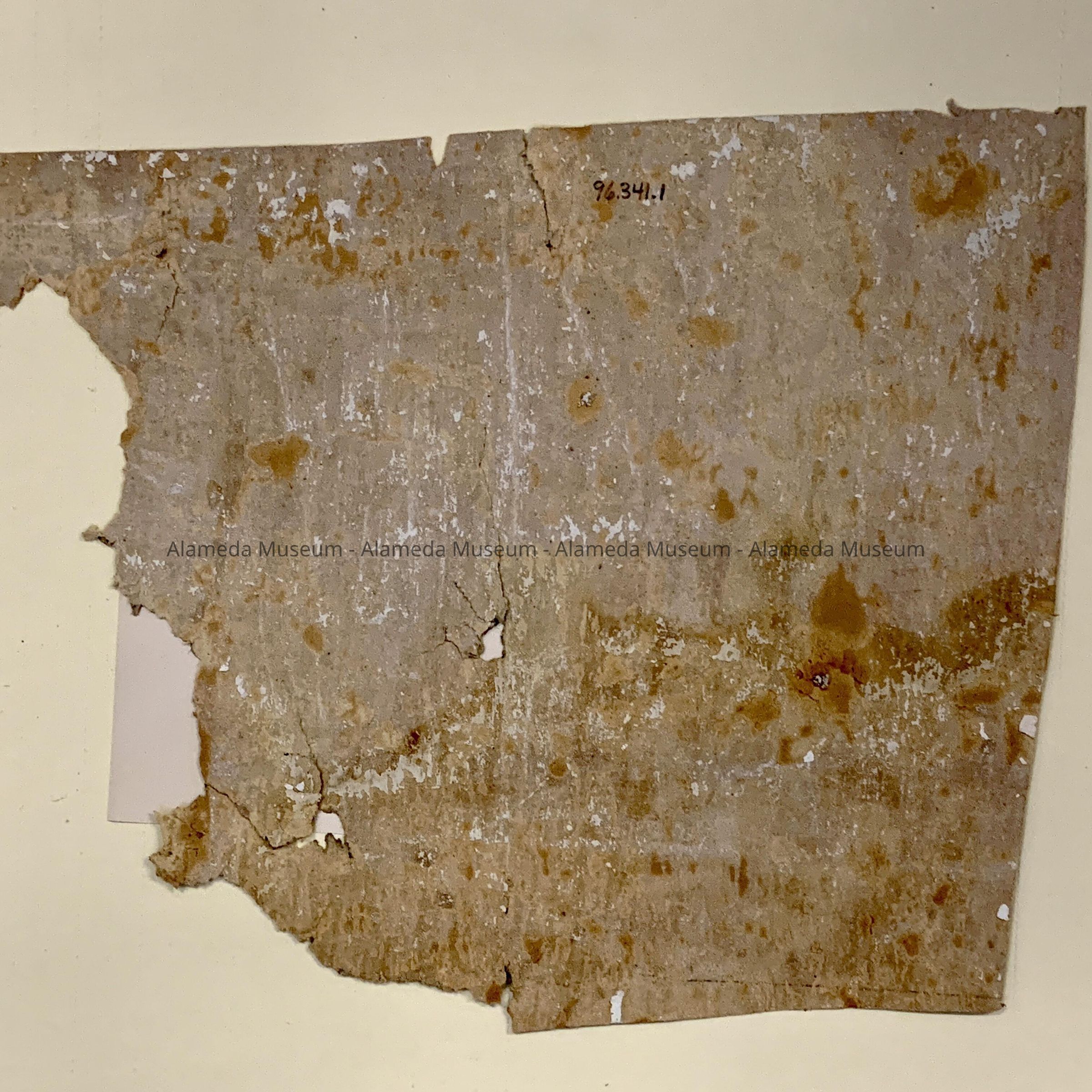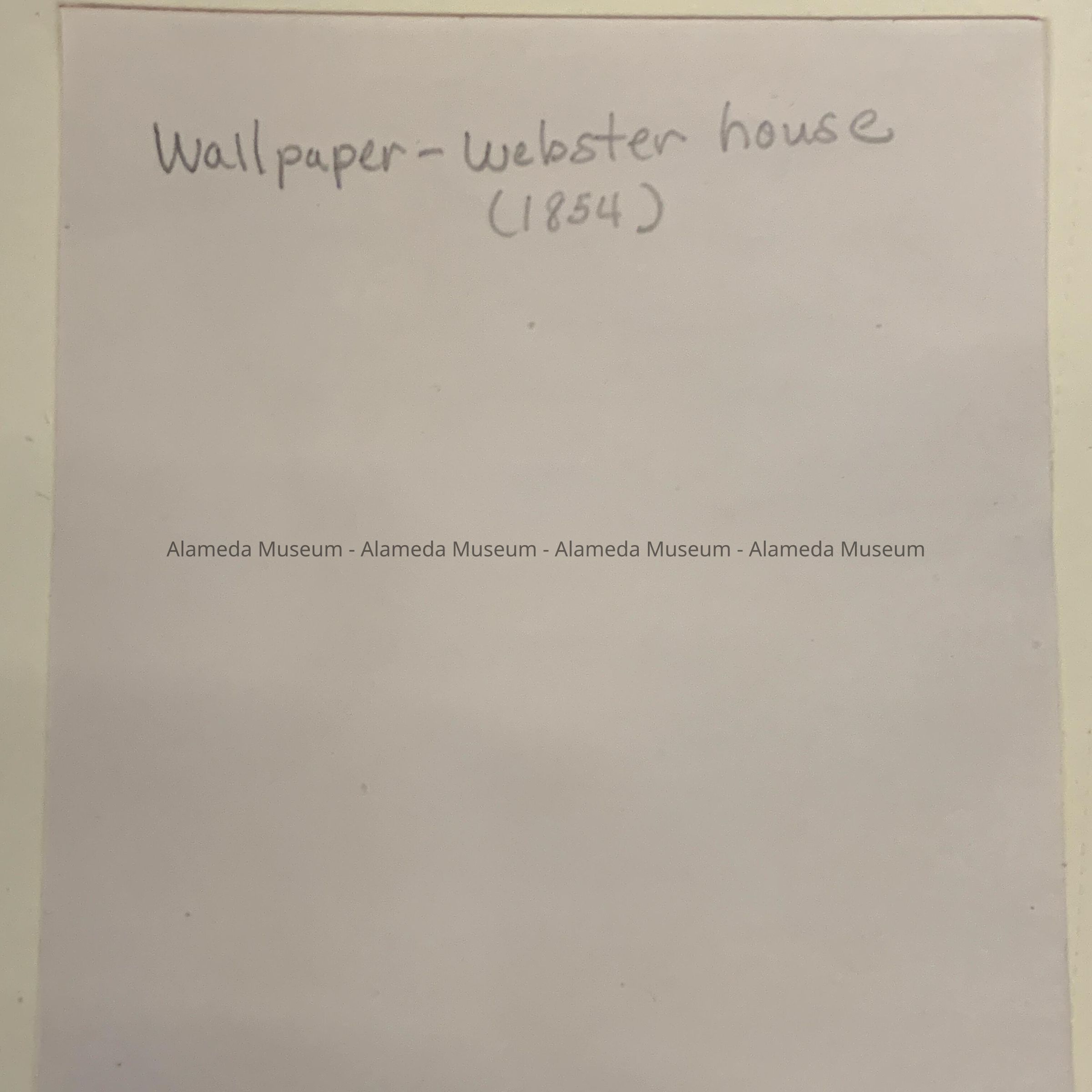 HISTORY OF OBJECT: PARTIALLY CHARRED WALLPAPER SAMPLE FROM AN ATTIC ROOM OF THE "WEBSTER HOUSE," LOCATED @ 1238 VERSAILLES AVENUE, ALAMEDA (ERECTED IN 1854). THE WALLPAPER IS PARTIALLY CHARRED DUE TO AN ATTIC FIRE WHICH OCCURRED IN 1927.