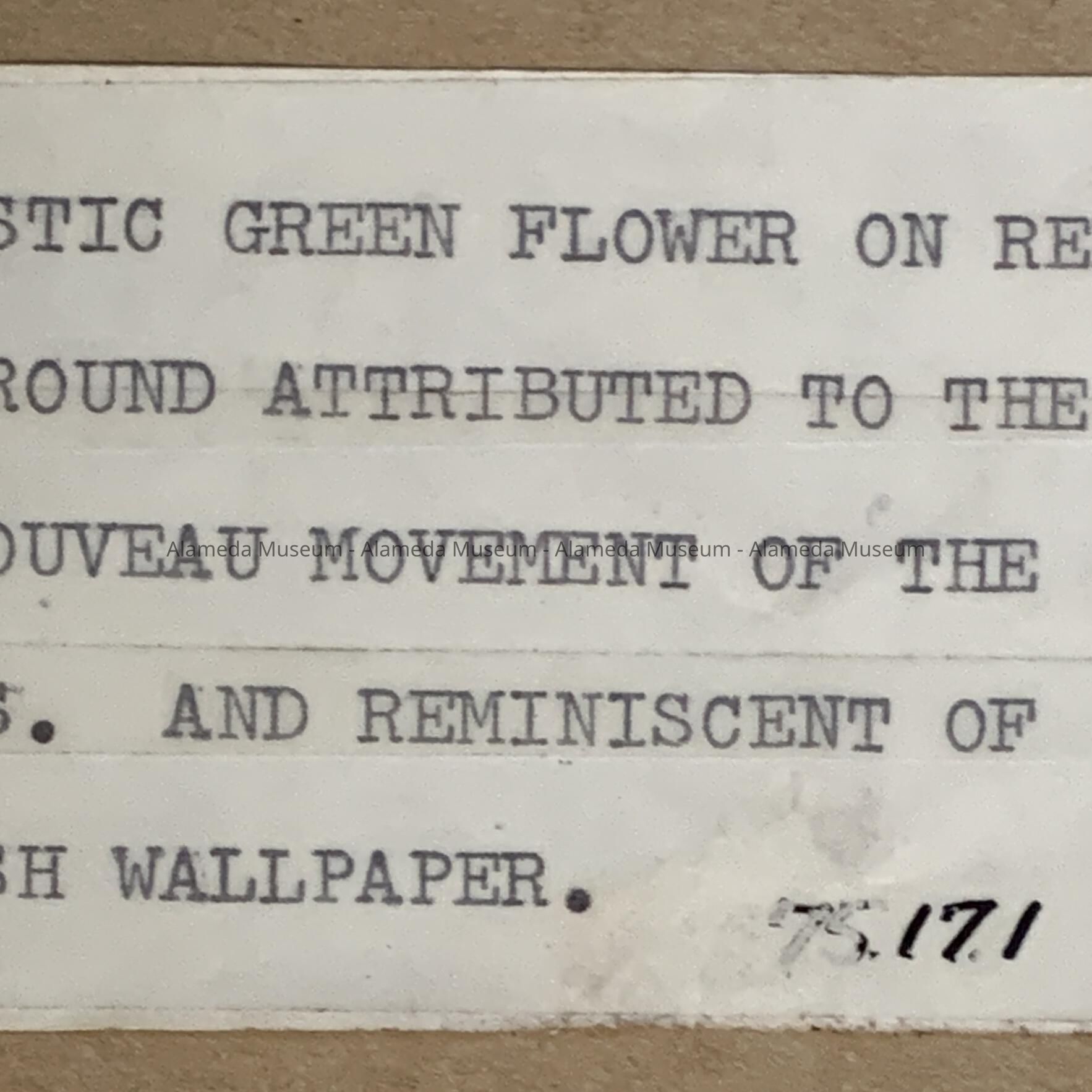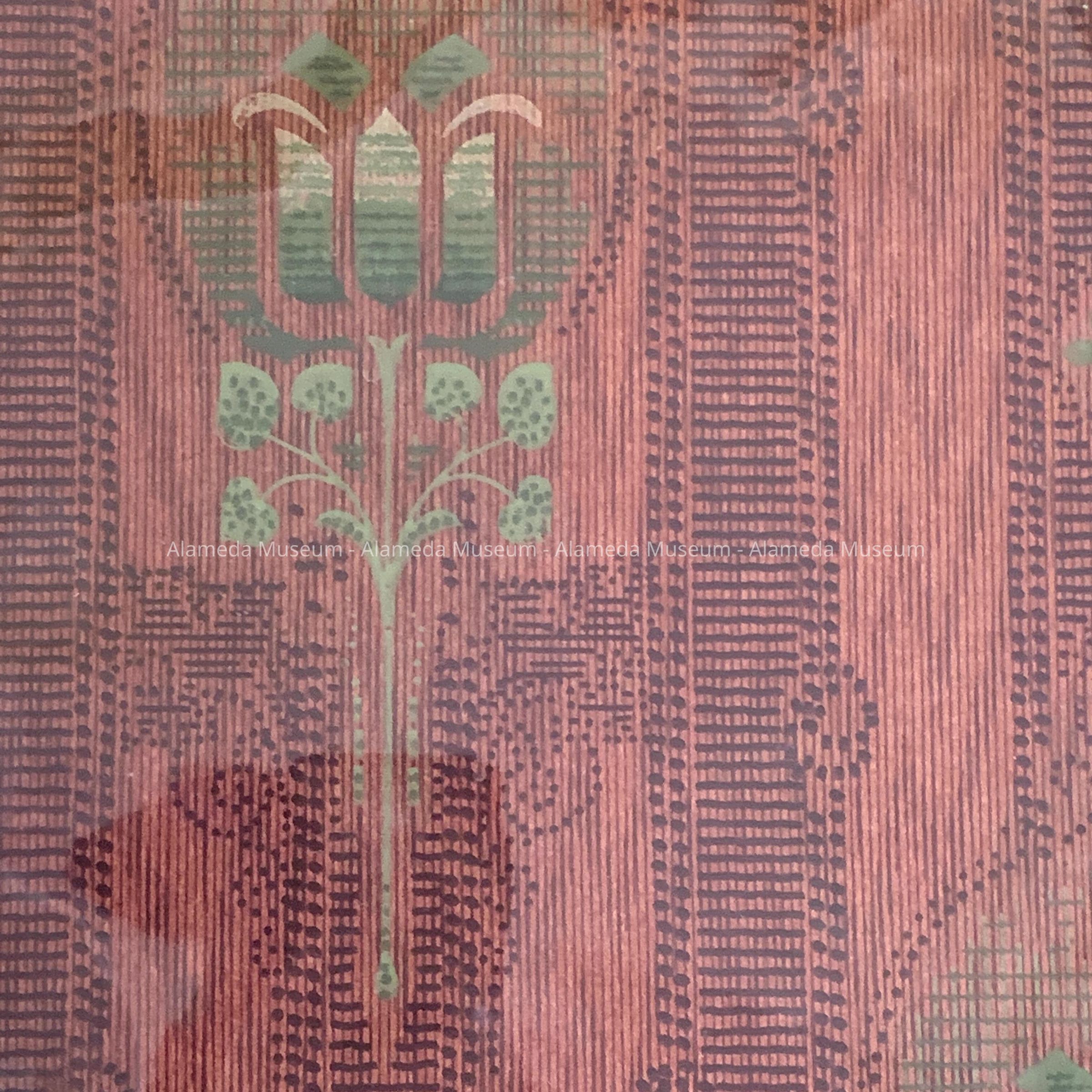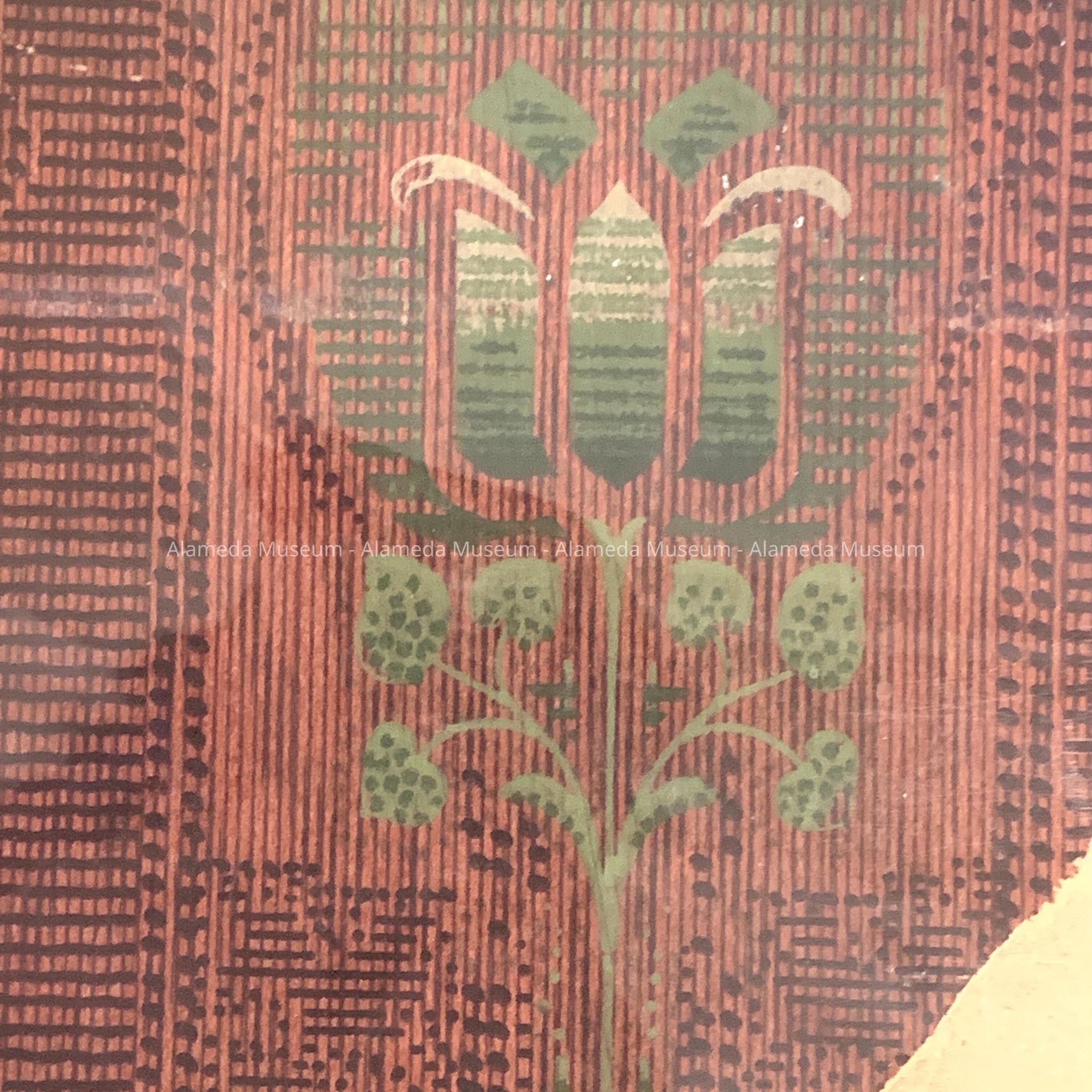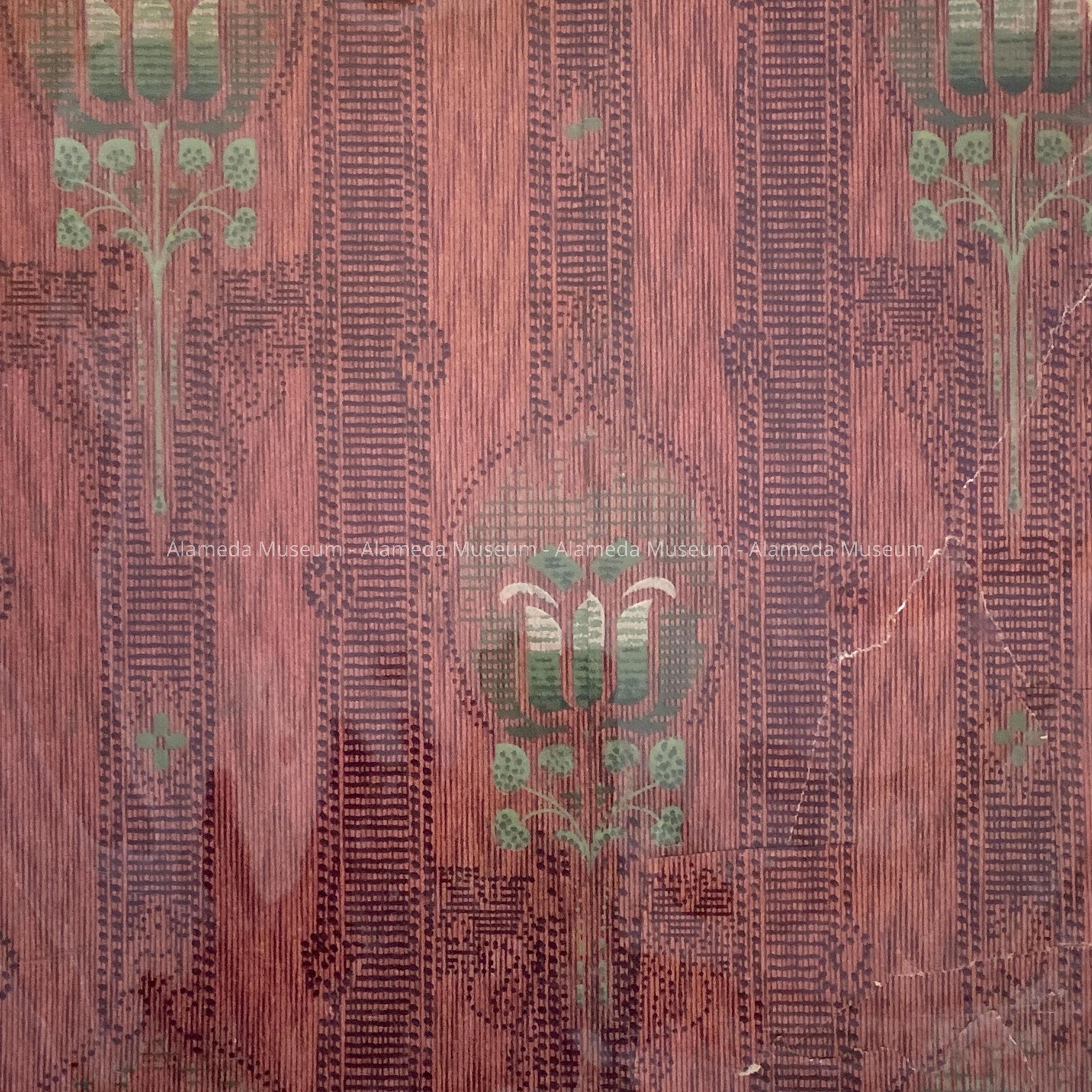HISTORY OF OBJECT: THIS IS THE ORIGINAL PAPER (RECEPTION HALL) OF AN ITALIANATE COTTAGE, 1217 OAK STREET, CIRCA 1882-86. THE COTTAGE, ONE OF TWO DEMOLISHED TO MAKE WAY FOR THE NEW ALAMEDA HIGH SCHOOL, WAS TO BE SPARED. BUT UNFORTUNATELY THE CAMPAIGN TO SAVE THEM CAME TO LATE. THIS VIVID SAMPLE OF PAPER WAS EXPOSED AFTER THE OWNER REMOVED A (CABINET OR MIRROR?) THAT HAD BEEN AFFIXED TO THE WALL OF THE HALL FOR MANY YEARS. AFTER FURTHER INVESTIGATION IT WAS DETERMINED THAT THE HALL PLASTER HAD BEEN ORIGINALLY PAINTED GREY, AND THEN AT A LATER DATE THE FIRST WALLPAPER APPLIED. OF WHICH THIS IS AN EXAMPLE. THE HOME (ONE OF THREE) IS ATTRIBUTED TO W. P. CLARK, CONTRACTOR & BUILDER (LISTED IN THE CITY DIRECTORY FOR ALAMEDA, 1880-81, AS LIVING ON SANTA CLARA AVENUE, BETWEEN CHESTNUT & LAFAYETTE,