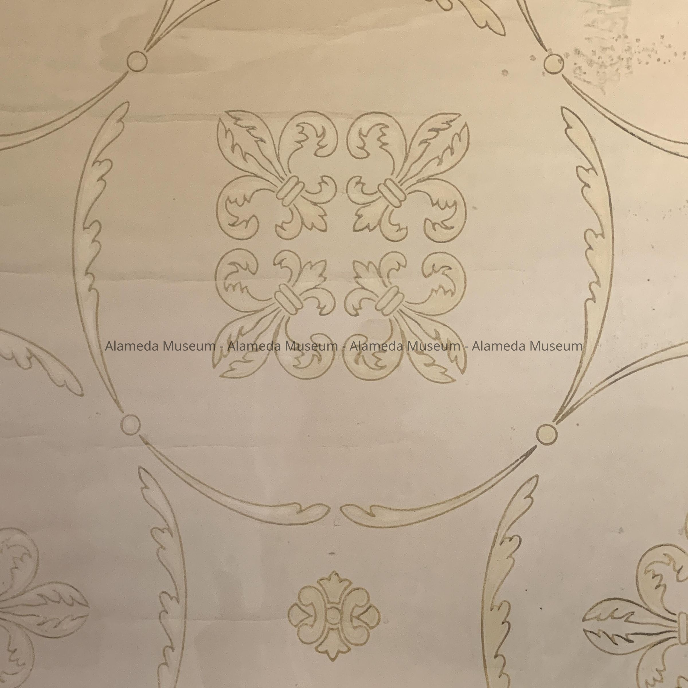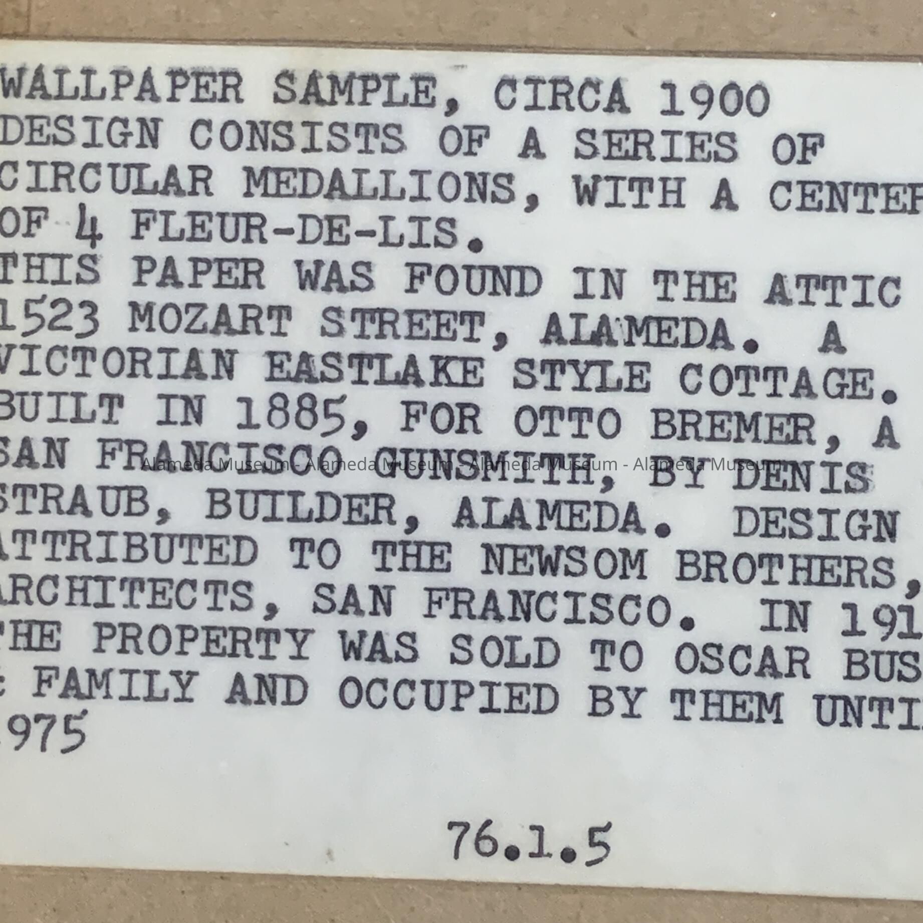 HISTORY OF OBJECT: THIS WALLPAPER WAS FOUND IN THE ATTIC OF 1523 MOZART STREET, ALAMEDA. A VICTORIAN EASTLAKE STYLE COTTAGE. BUILT IN 1885, FOR OTTO BREMER, A SAN FRANCISCO GUNSMITH, BY DENIS STRAUB, BUILDER, ALAMEDA. DESIGN ATTRIBUTED TO THE NEWSOM BROTHERS, ARCHITECTS, SAN FRANCISCO. IN 1913 THE PROPERTY WAS SOLD TO OSCAR BUSSÉ & FAMILY AND OCCUPIED BY THEM UNTIL 1975.