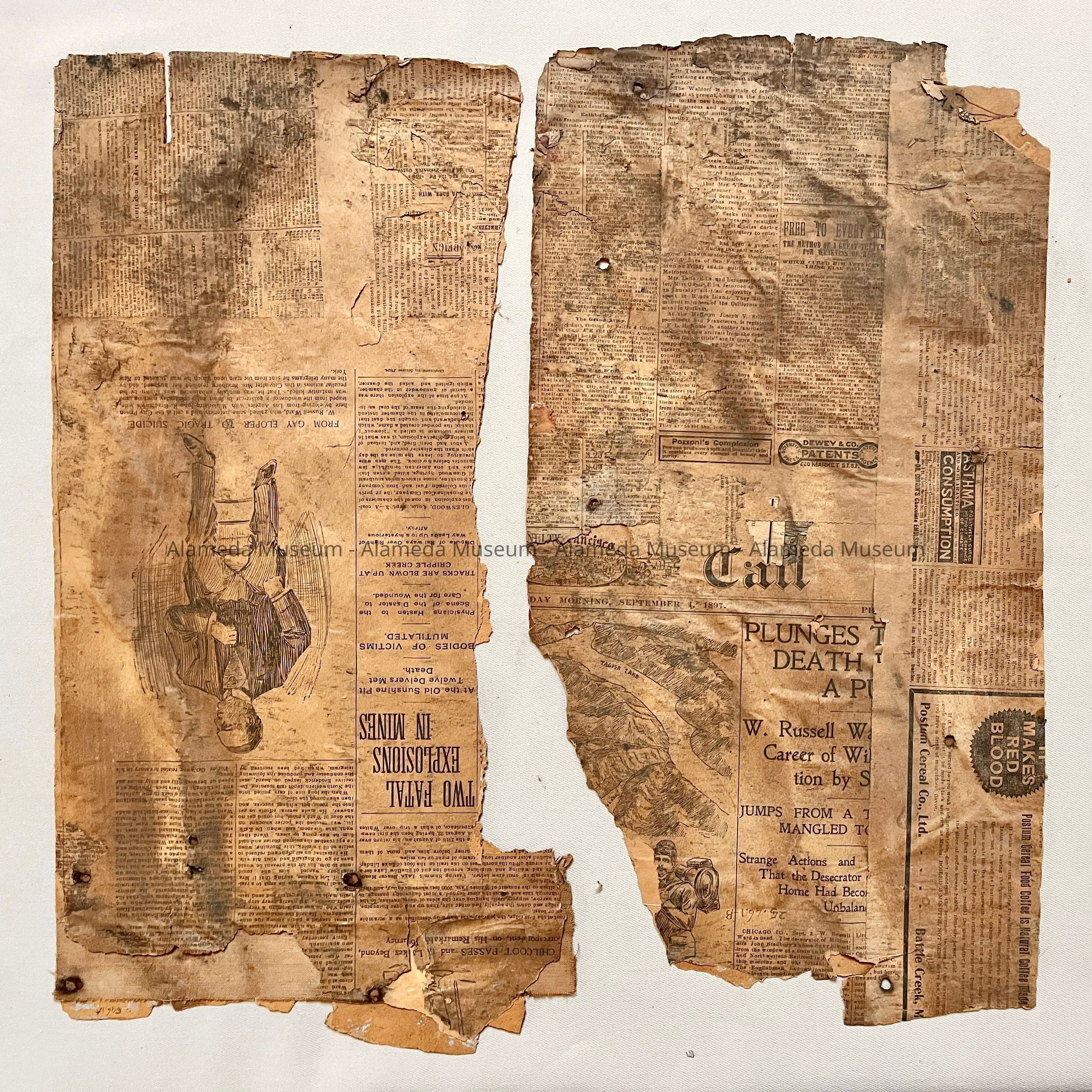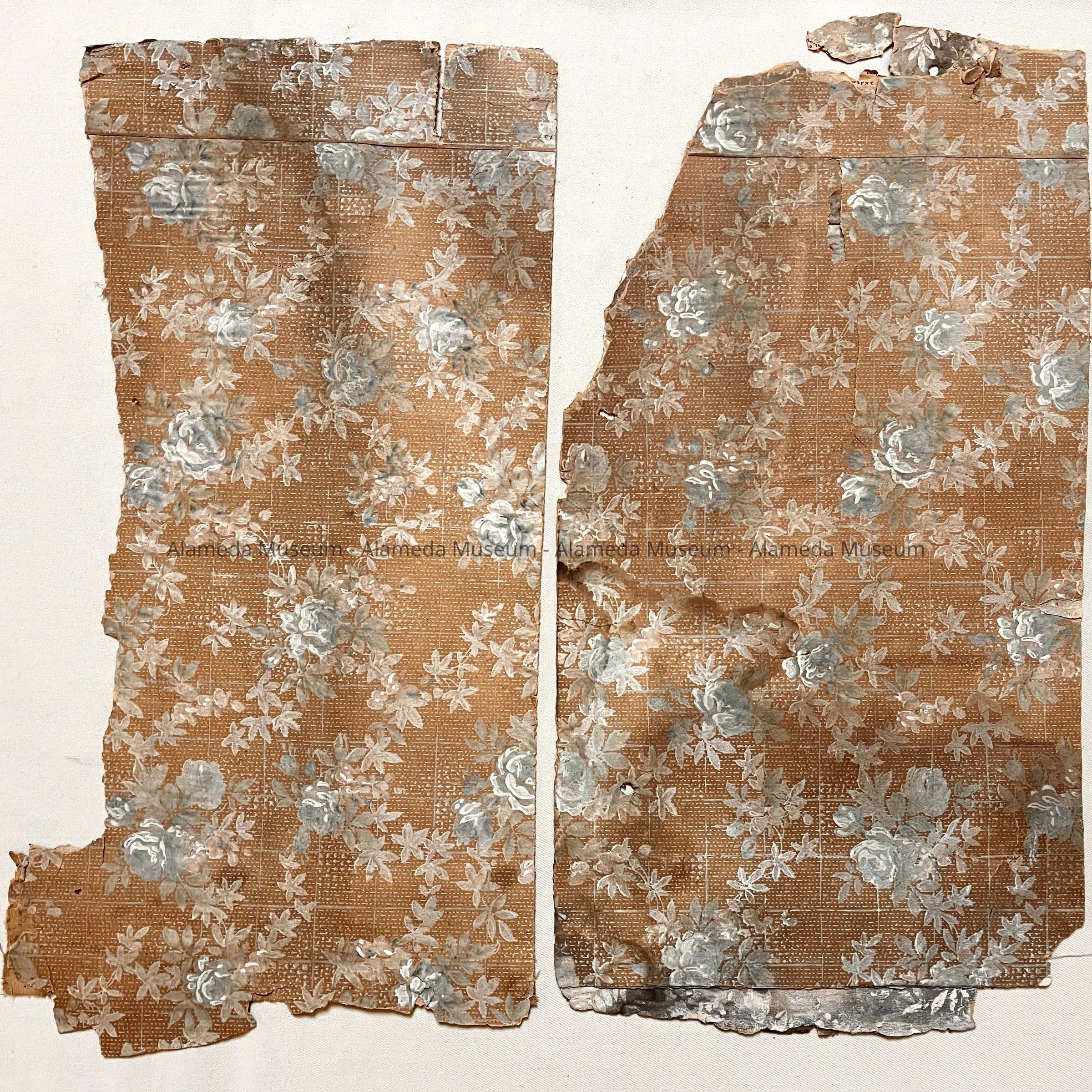 Description: Two sections of a wallpaper, with design of silver-and-grey roses on a white-stippled brown reddish background. Back has old newspapers, which presumably prevented old glue from sticking to other things but may have darkened the sample.