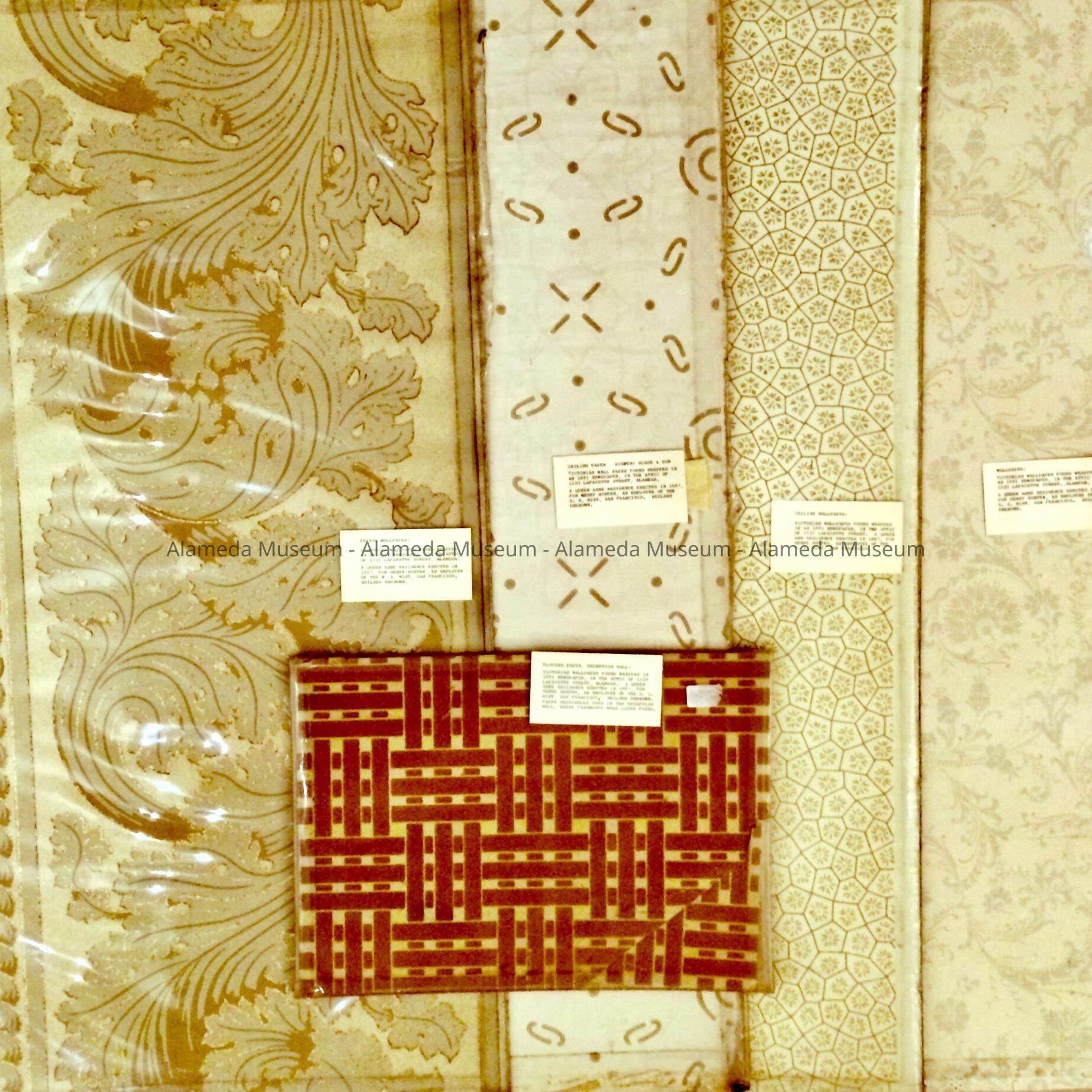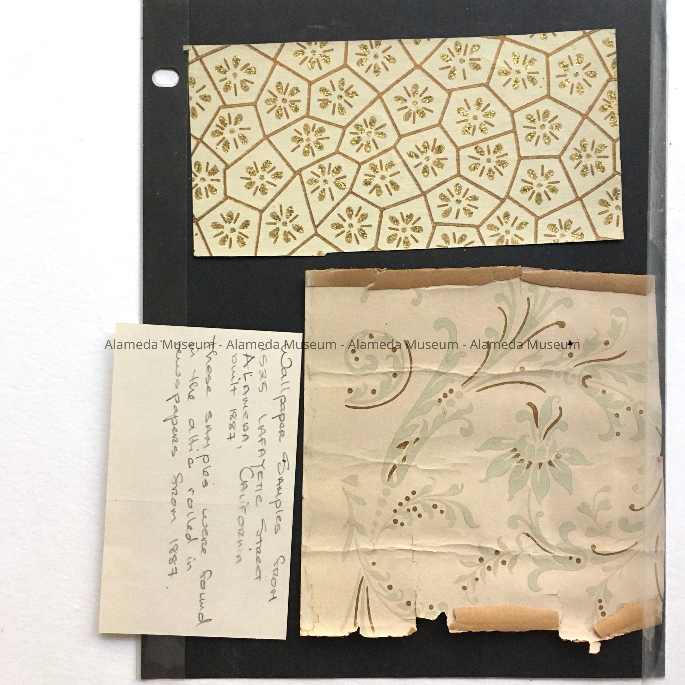 History: Wallpaper samples from 1525 Lafayette Street, a Queen Anne residence erected 1887, for Henry Hunter, an employee of the San Francisco U.S. Mint. The samples were found in the attic rolled in a newspaper dated 1891.