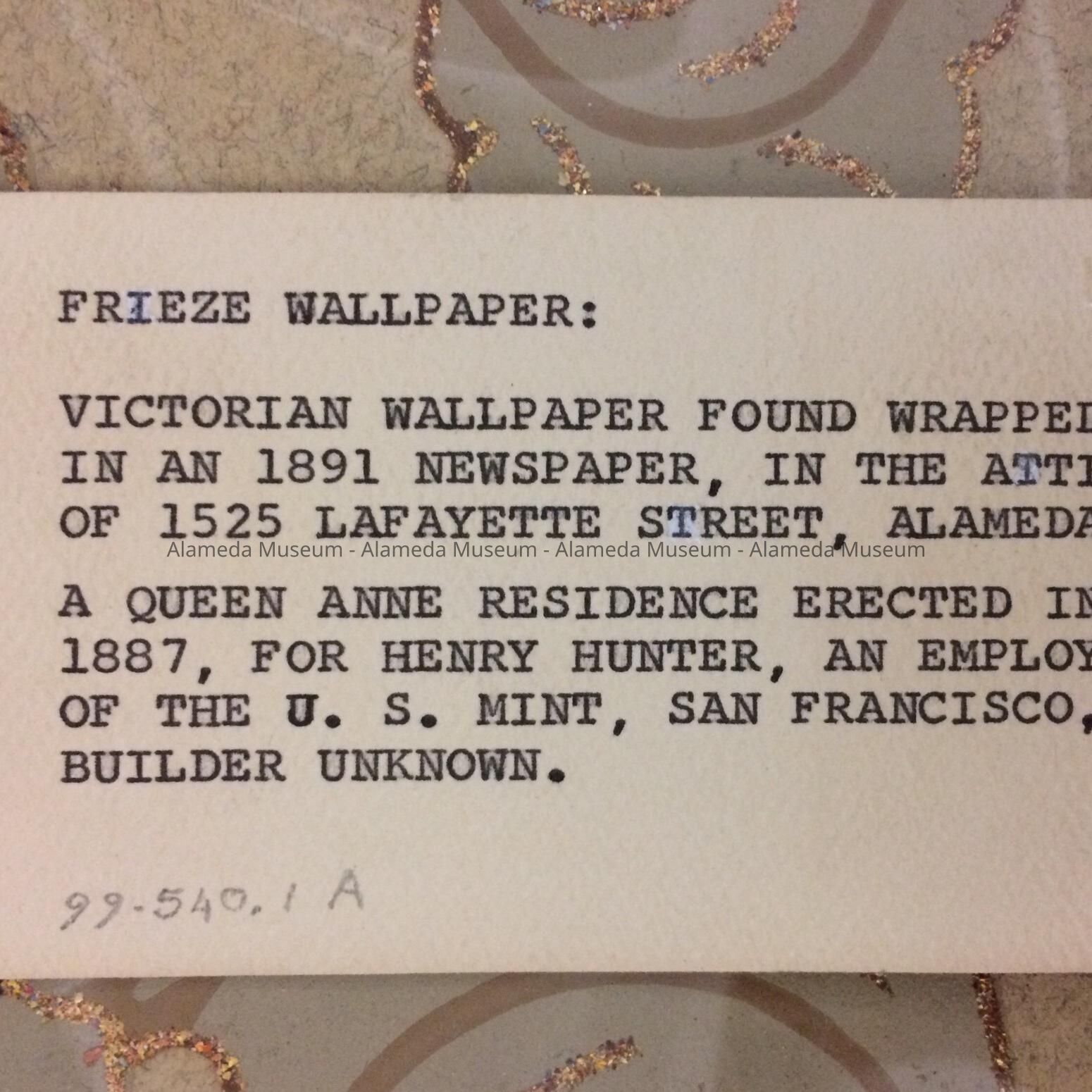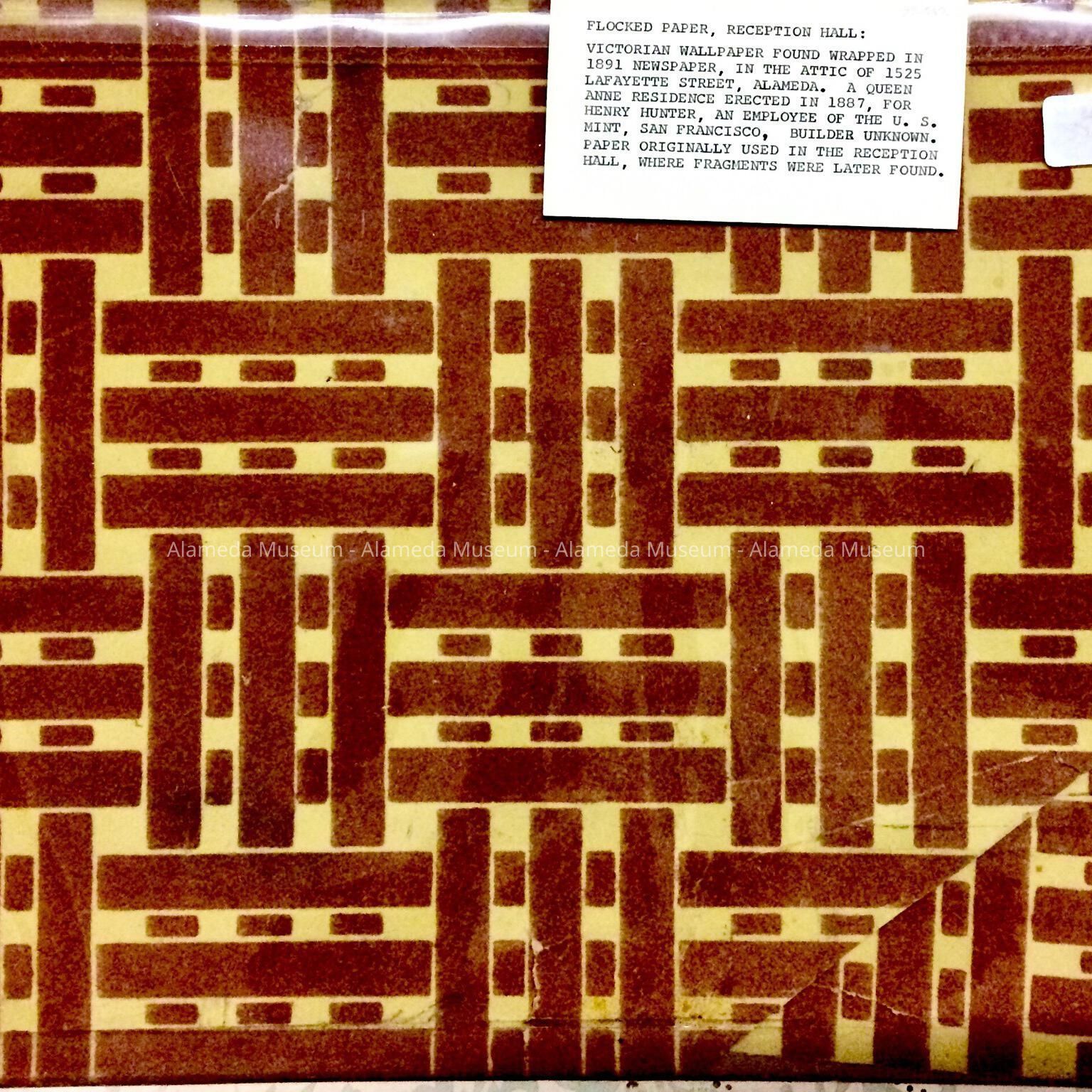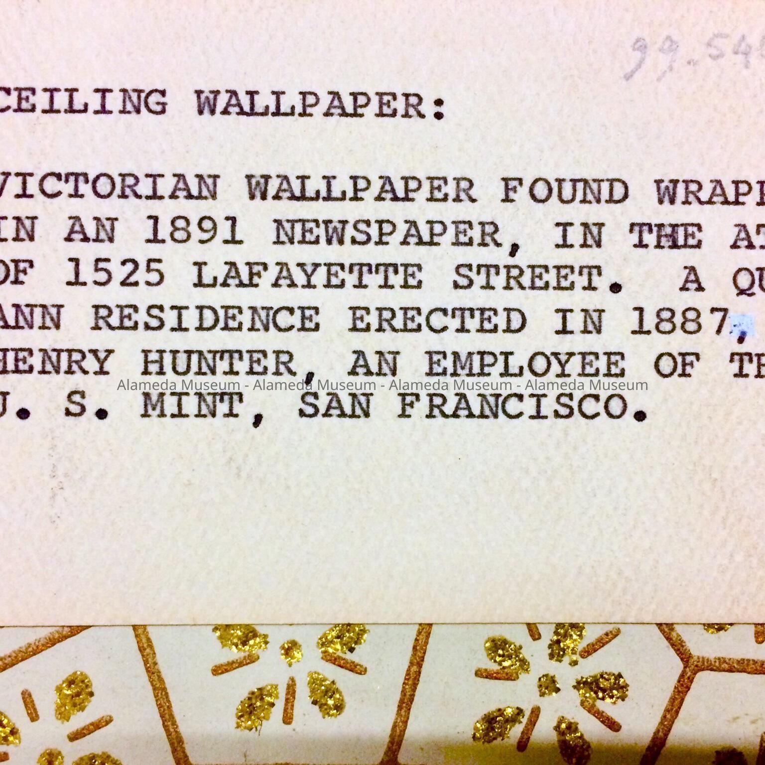 Victorian wallpaper found wrapped in an 1891 newspaper, in the attic of 1525 Lafayette Street. A Queen Ann residence erected in 1887, for Henry Hunter, an employee of the U.S. Mint, San Francisco."