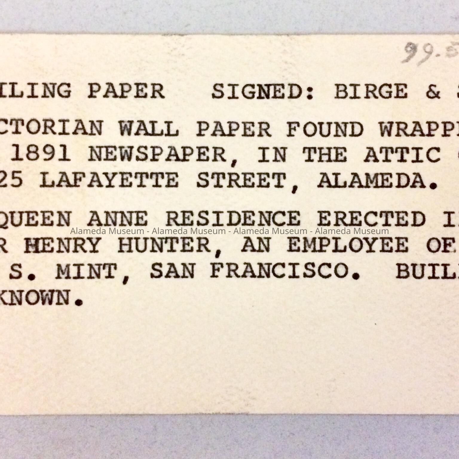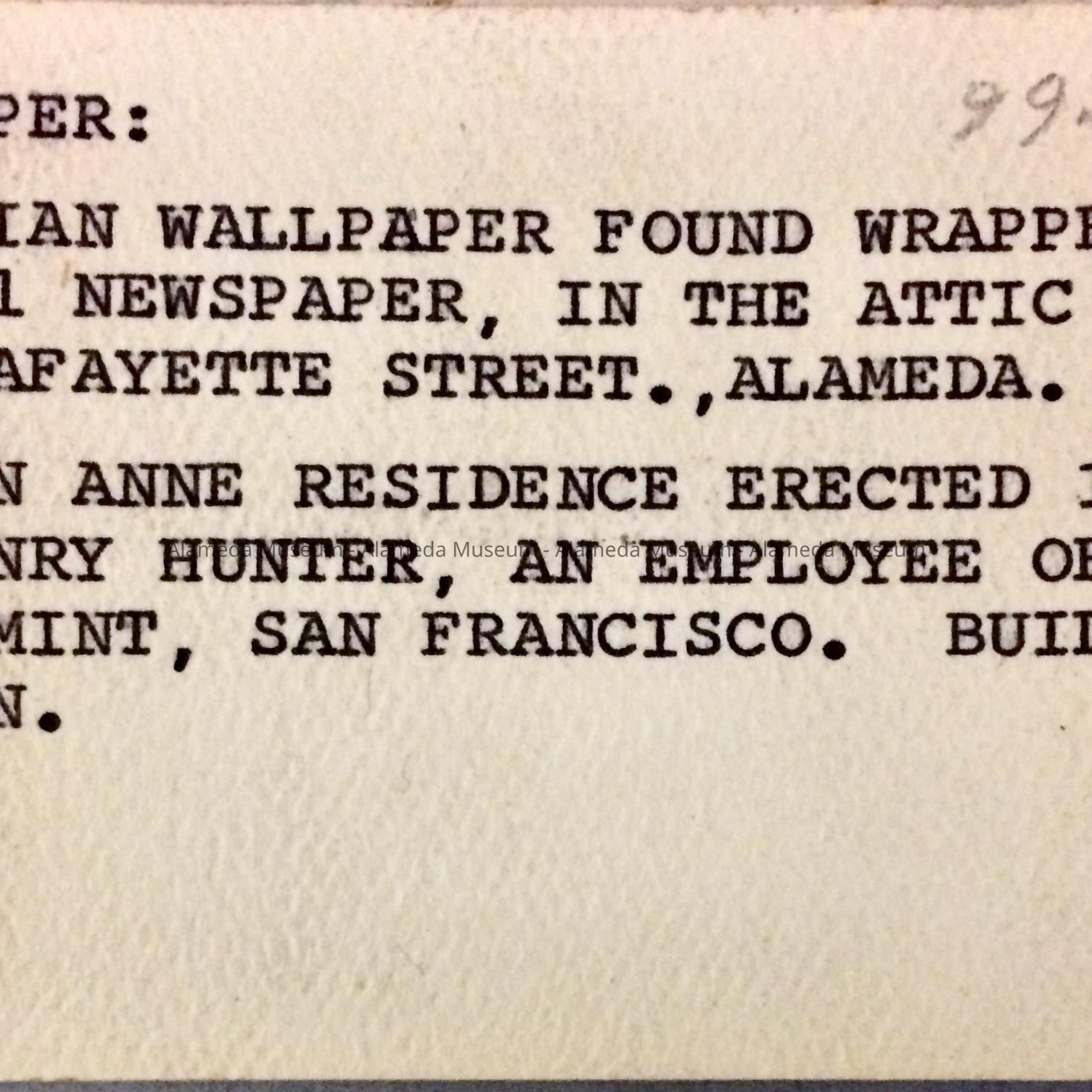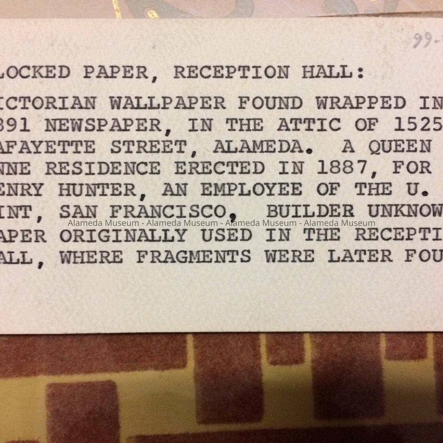 Victorian wallpaper found wrapped in an 1891 newspaper, in the attic of 1525 Lafayette Street. A Queen Ann residence erected in 1887, for Henry Hunter, an employee of the U.S. Mint, San Francisco."