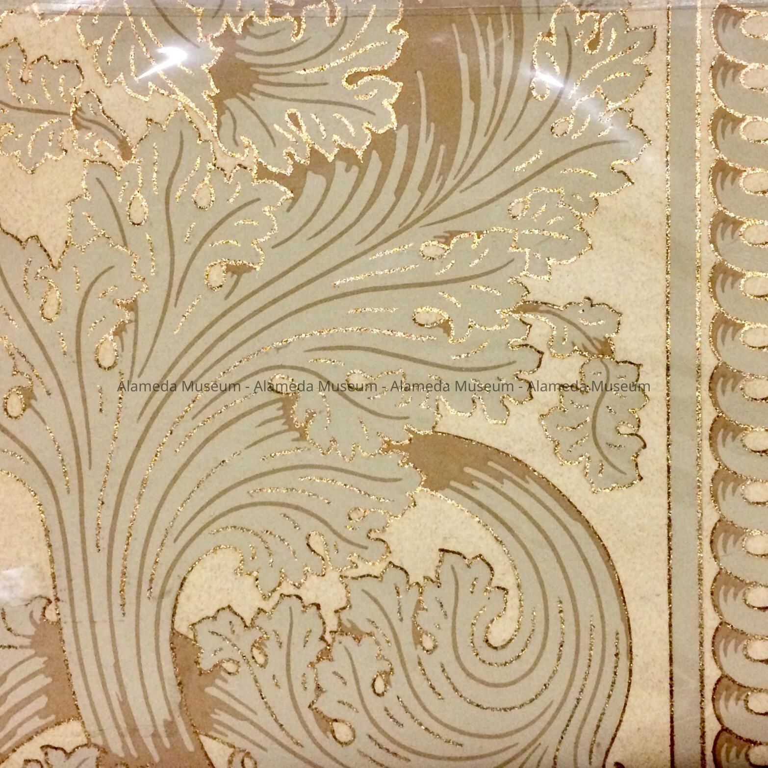 B: "Ceiling wallpaper", Stylized floral and leaf pattern in pale green accentuated with gold.;