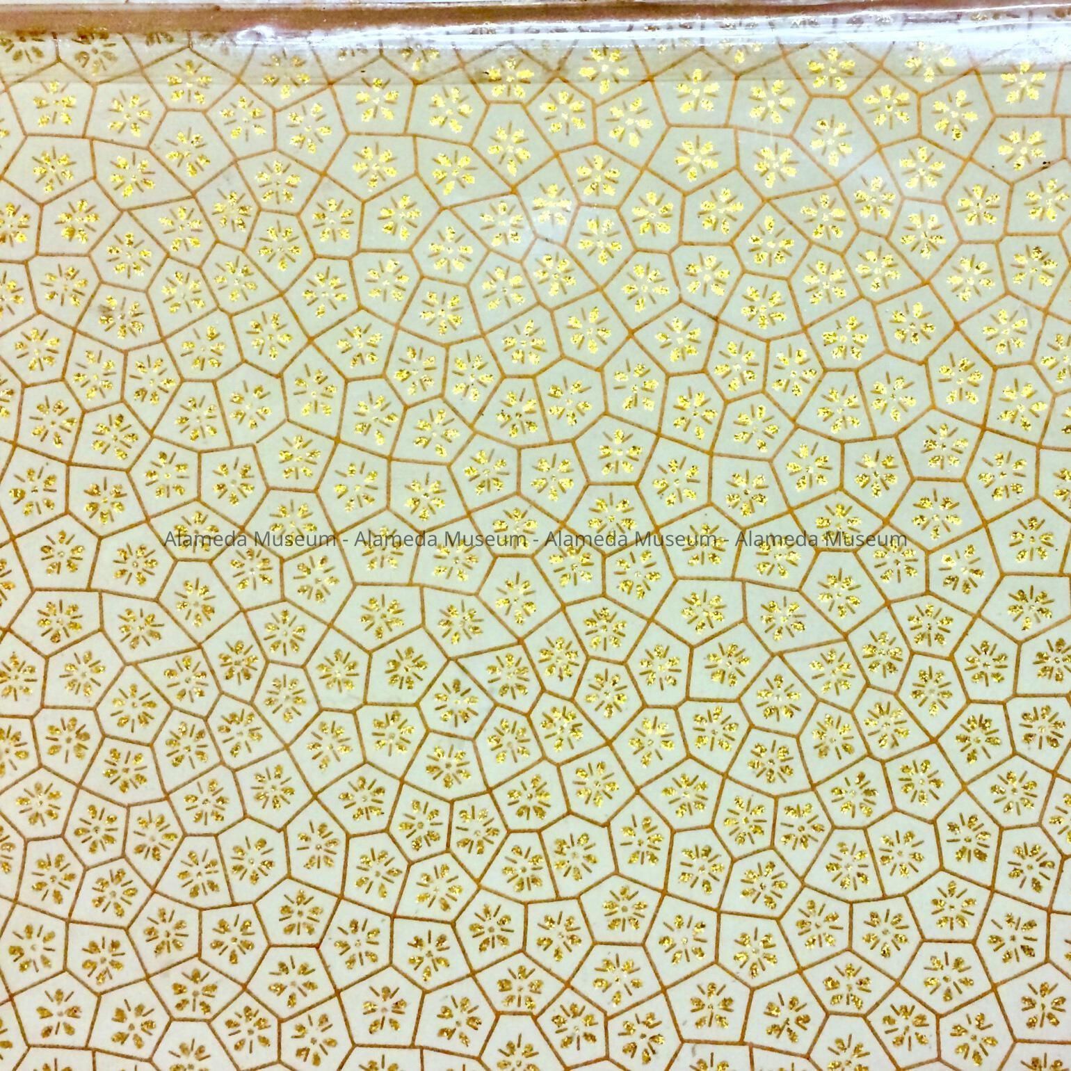 C: "Ceiling paper, Signed: Bridge & Sons", mandala style wall paper of gold and silver on a pale beige background;