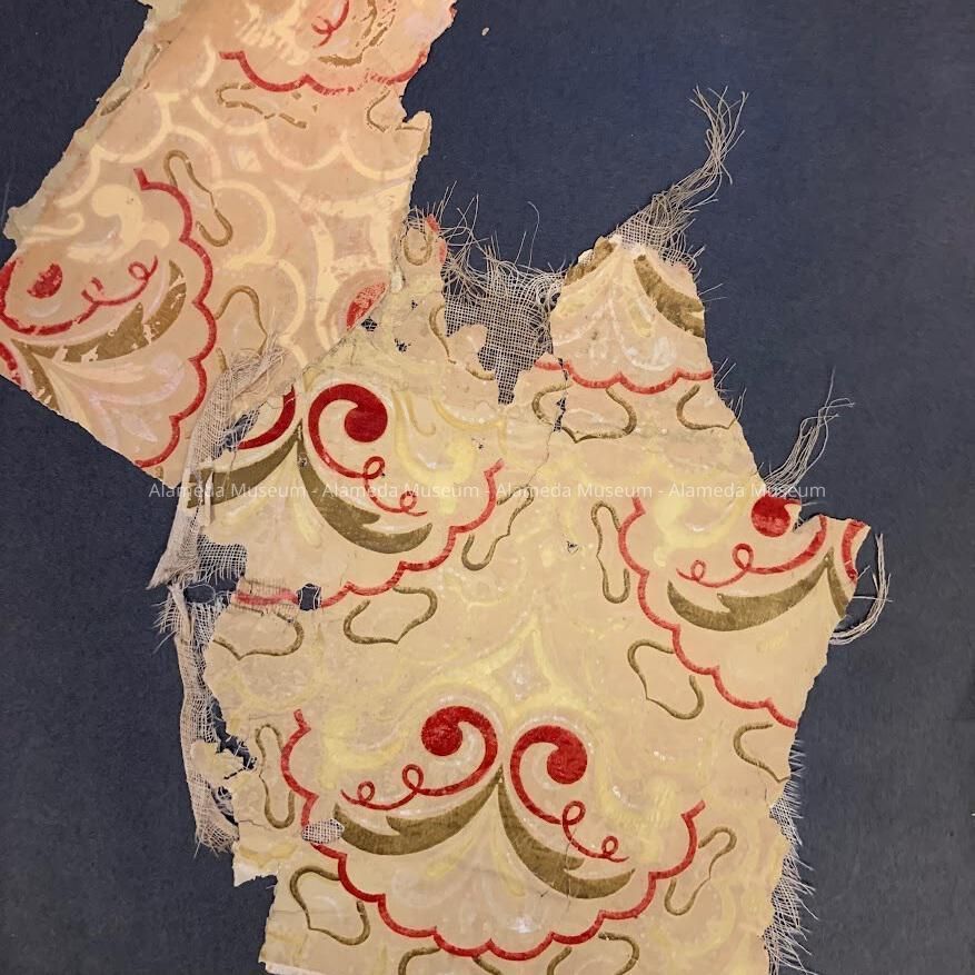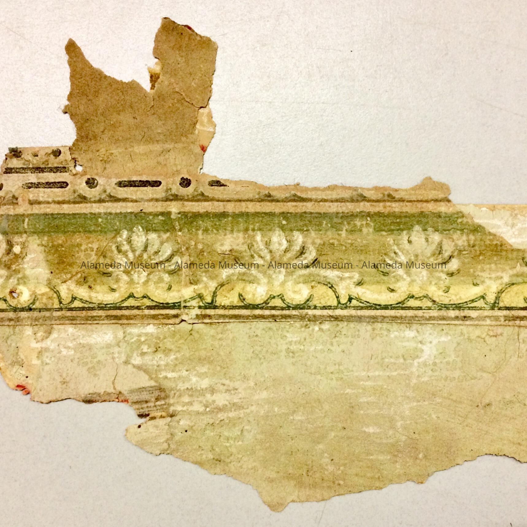History of object: Wallpaper sample from 1548 Pacific Avenue, a transitional colonial revival cottage, erected 1896-1897, by Marcuse and Remmel, original owners, Wallace and Mary C. Dinsmore.
