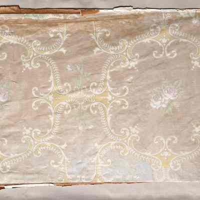 Description: An irregularly torn-off section of wallpaper, folded double, with remnants of plaster on the back. The wall paper features a large design of pale pink and lavender roses and a design of white leaves accented with pale yellow green, on a tan striped background. Paper appears slightly shiny.