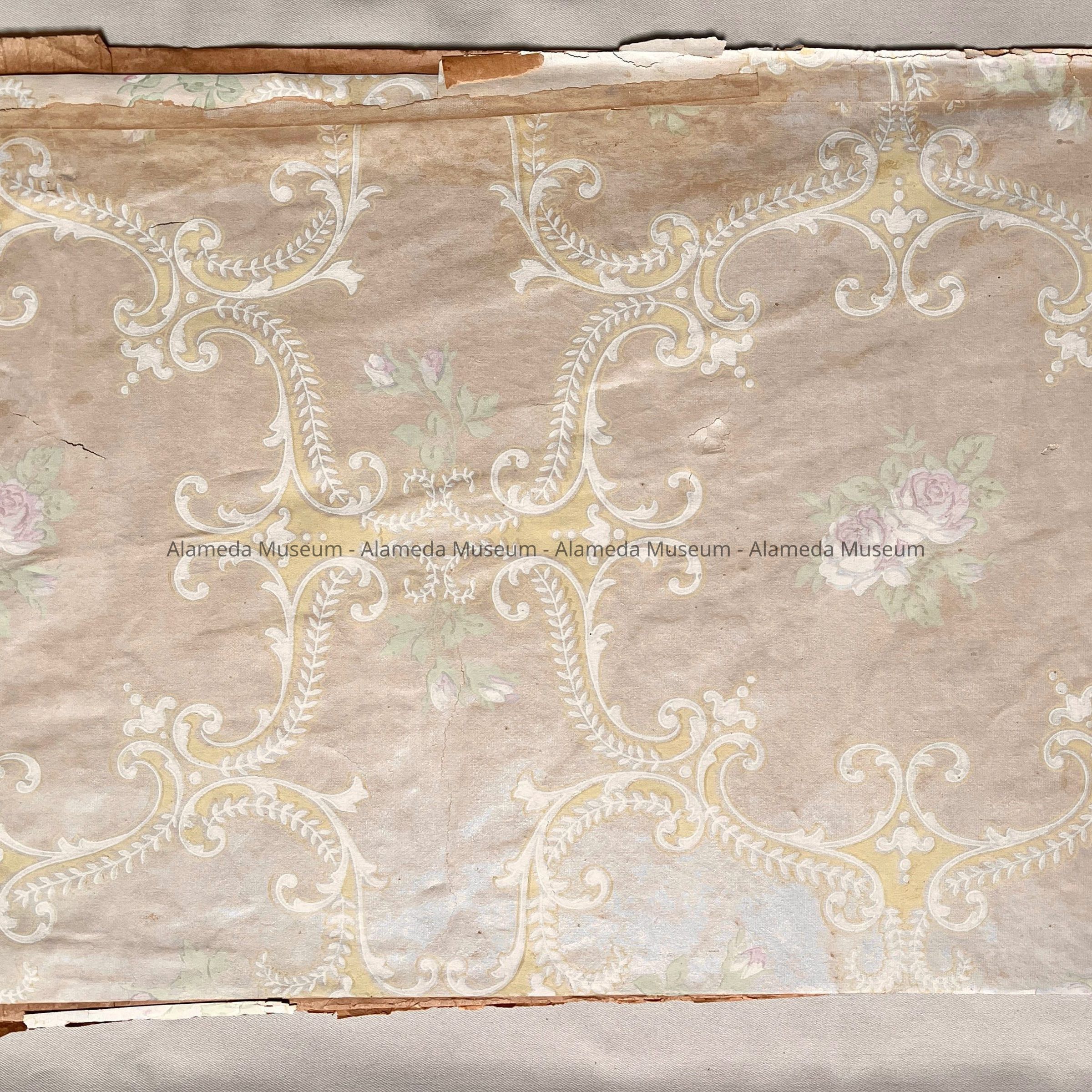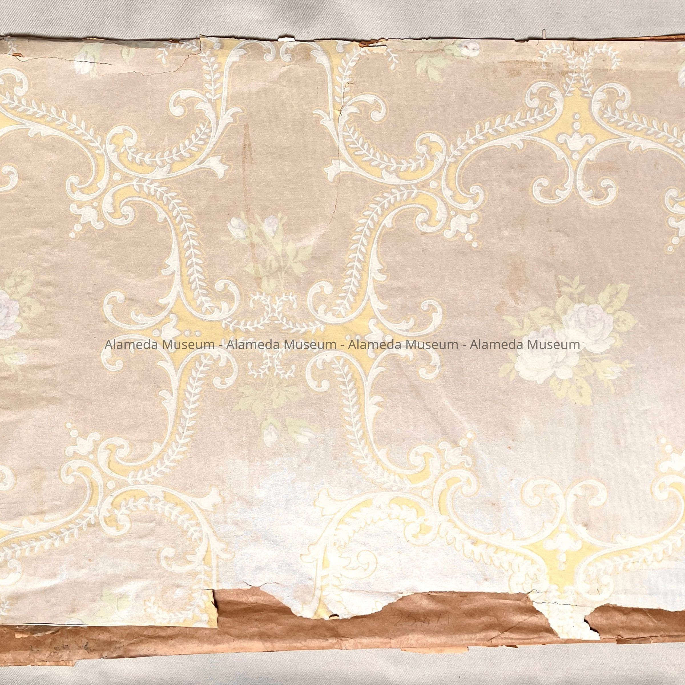 A section of wallpaper from 1309 Regent St., Alameda. The house was erected in 1890 by J. H. Young, contractor and builder, and sold to A. J. McNamara and family, and remaining in the family until 1986. Found, awaiting processing, without donor information, in the museum wallpaper storage, but likely acquired at the same time as the carpet sample cataloged as 95.116.1.