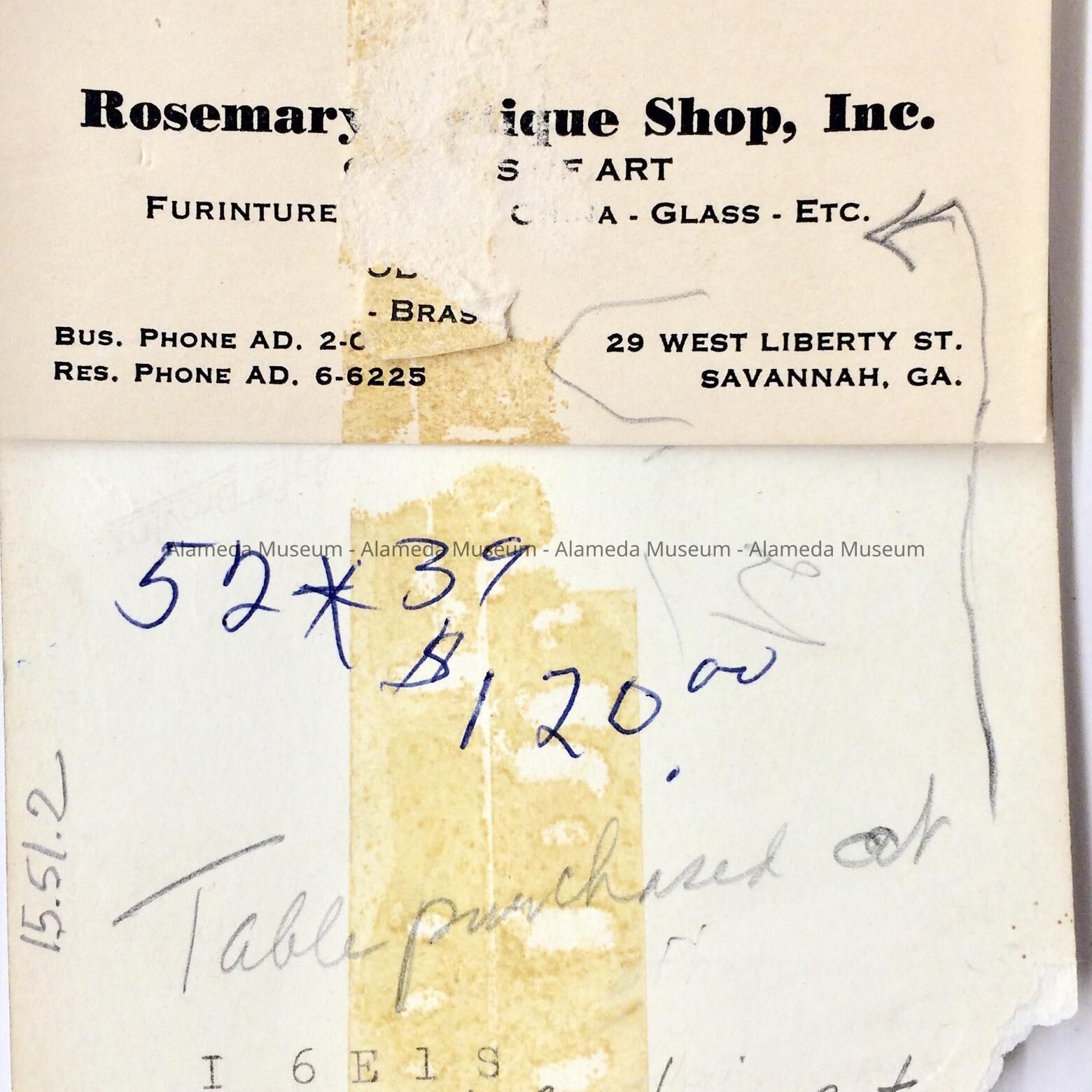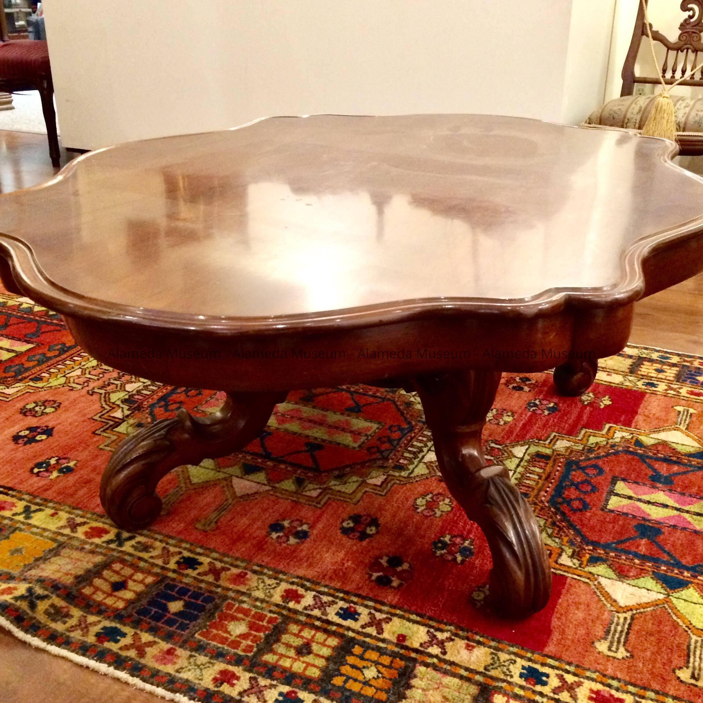 History of Object: This table was purchased by the Meyers Sisters at an antique store in Savannah, GA. possibly in the 1950's at a cost of $120.00. As was the practice of the time, this table was cut down to function as a coffee table. The donor is a descendent of H.H. Meyers' brother.