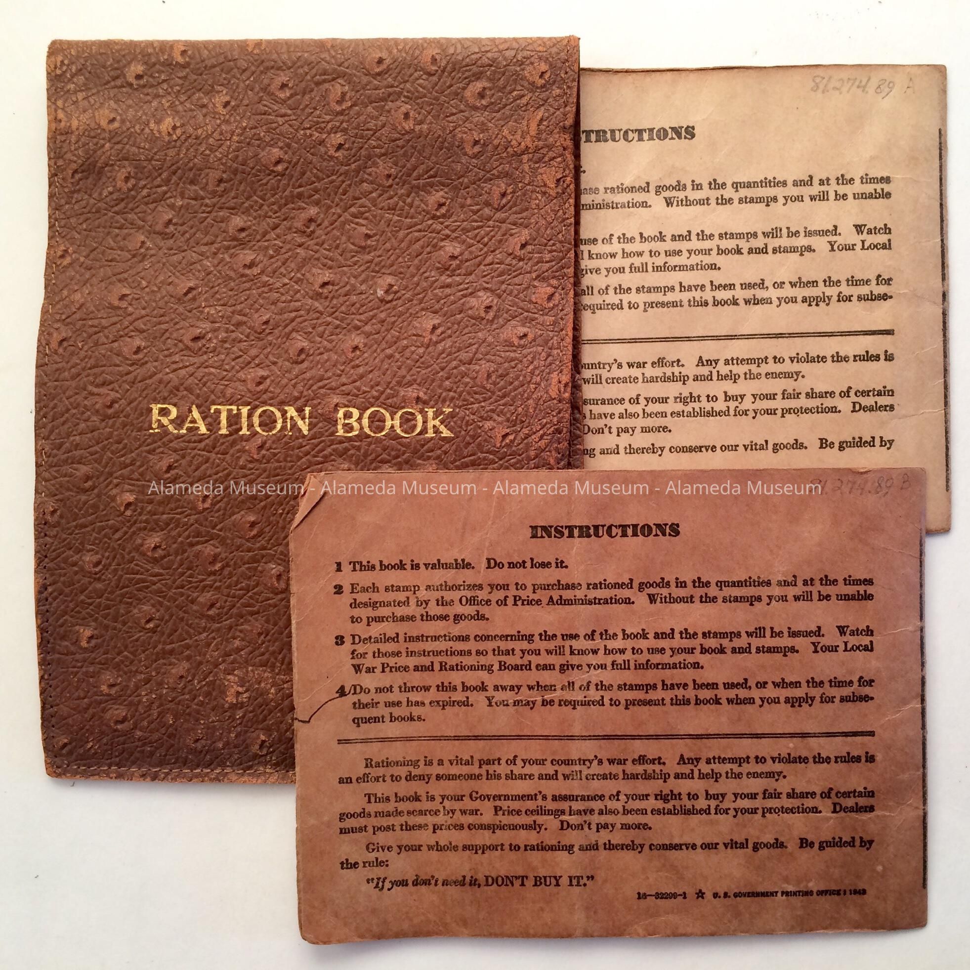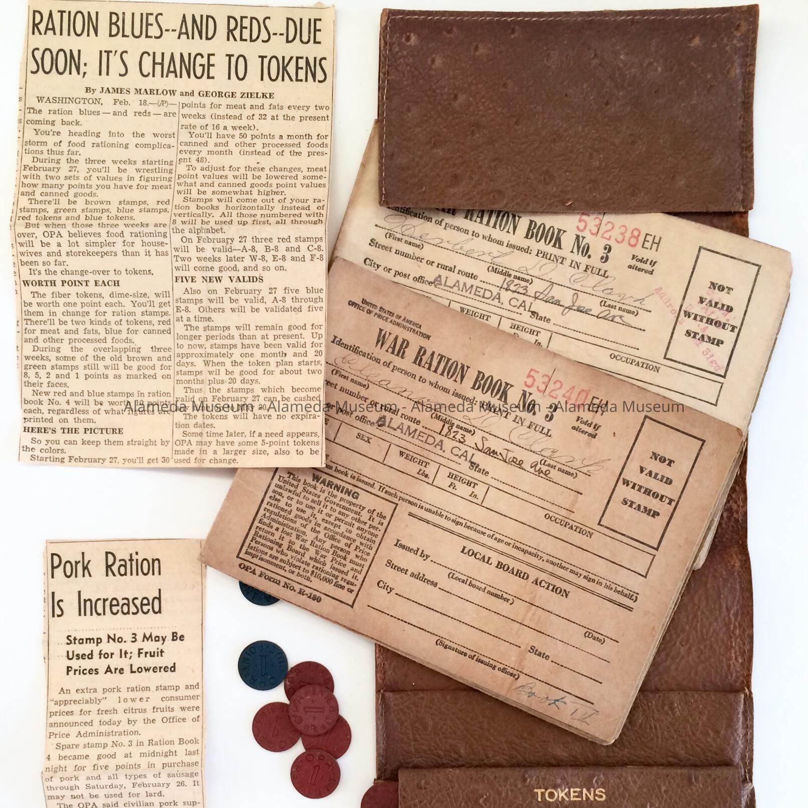History of Object: Ration books issued to Eleanor D. Clark and Herbert D Clark, 1823 San Jose Avenue, Alameda, in coverlet holding tokens and newspaper clippings.