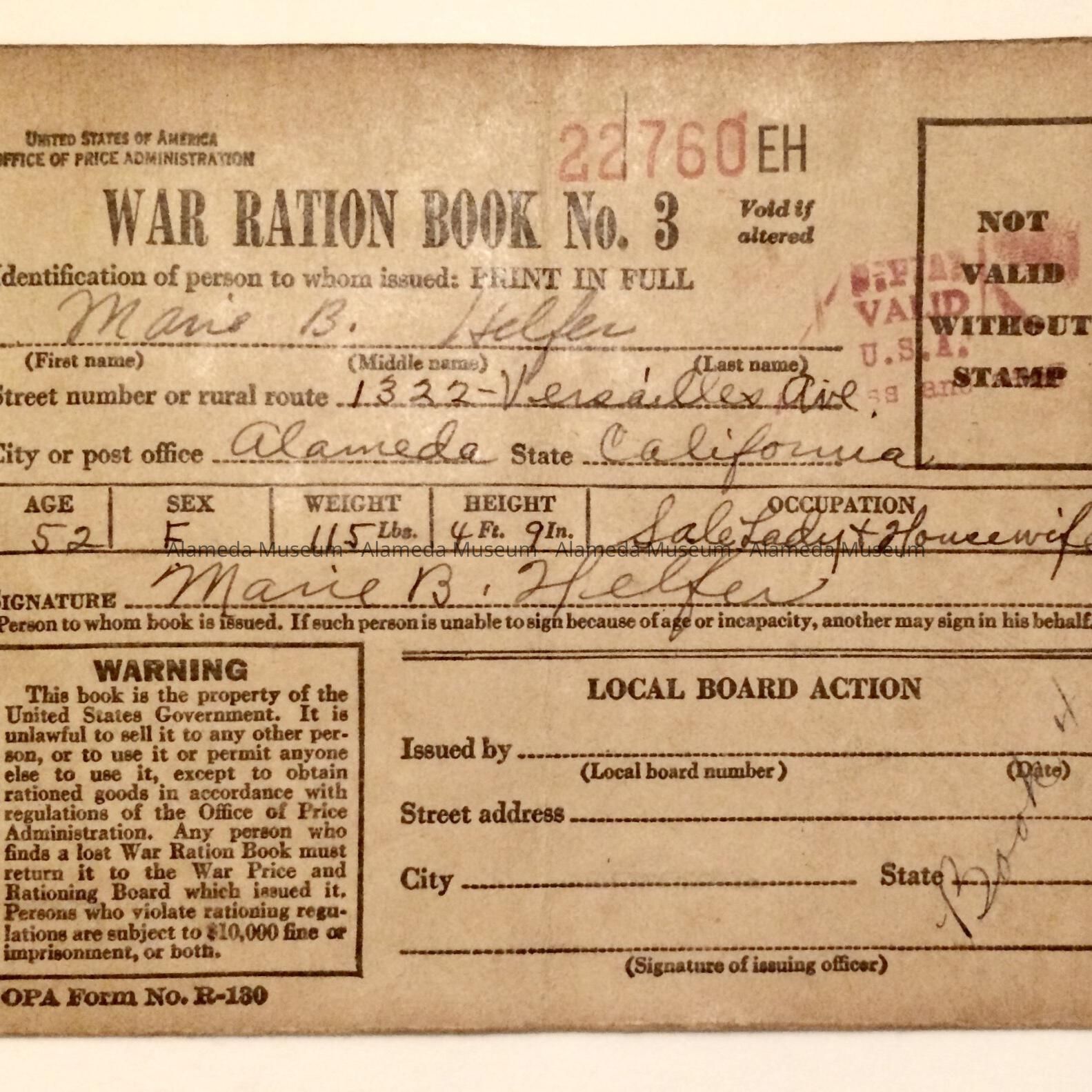 History of Object: It is the War Ration Book No. 3 #22760 issued to Marie B. Helfer, 1322 Versailles Avenue, Alameda, Calif.