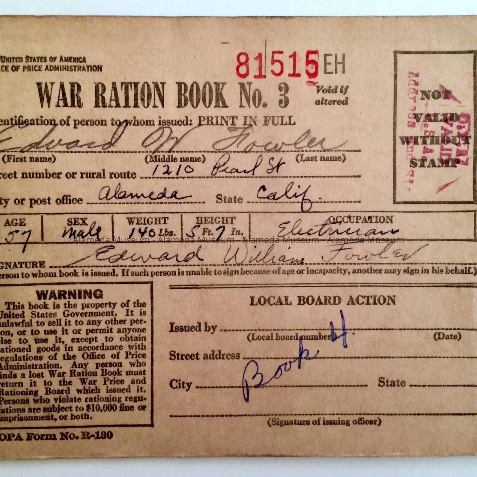 History of Object: War ration book issued to Edward W. Fowler, 1210 Pearl St., Alameda. He was a longtime resident of the city and father of the late Ed. Wm. Fowler.