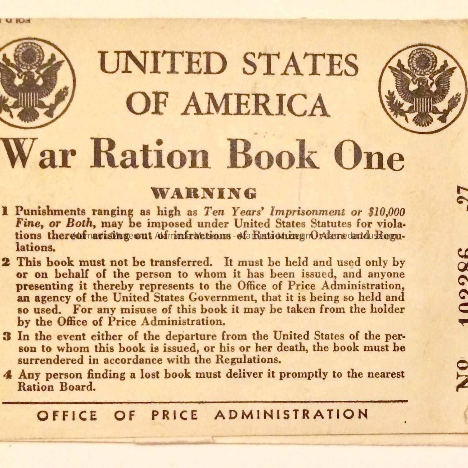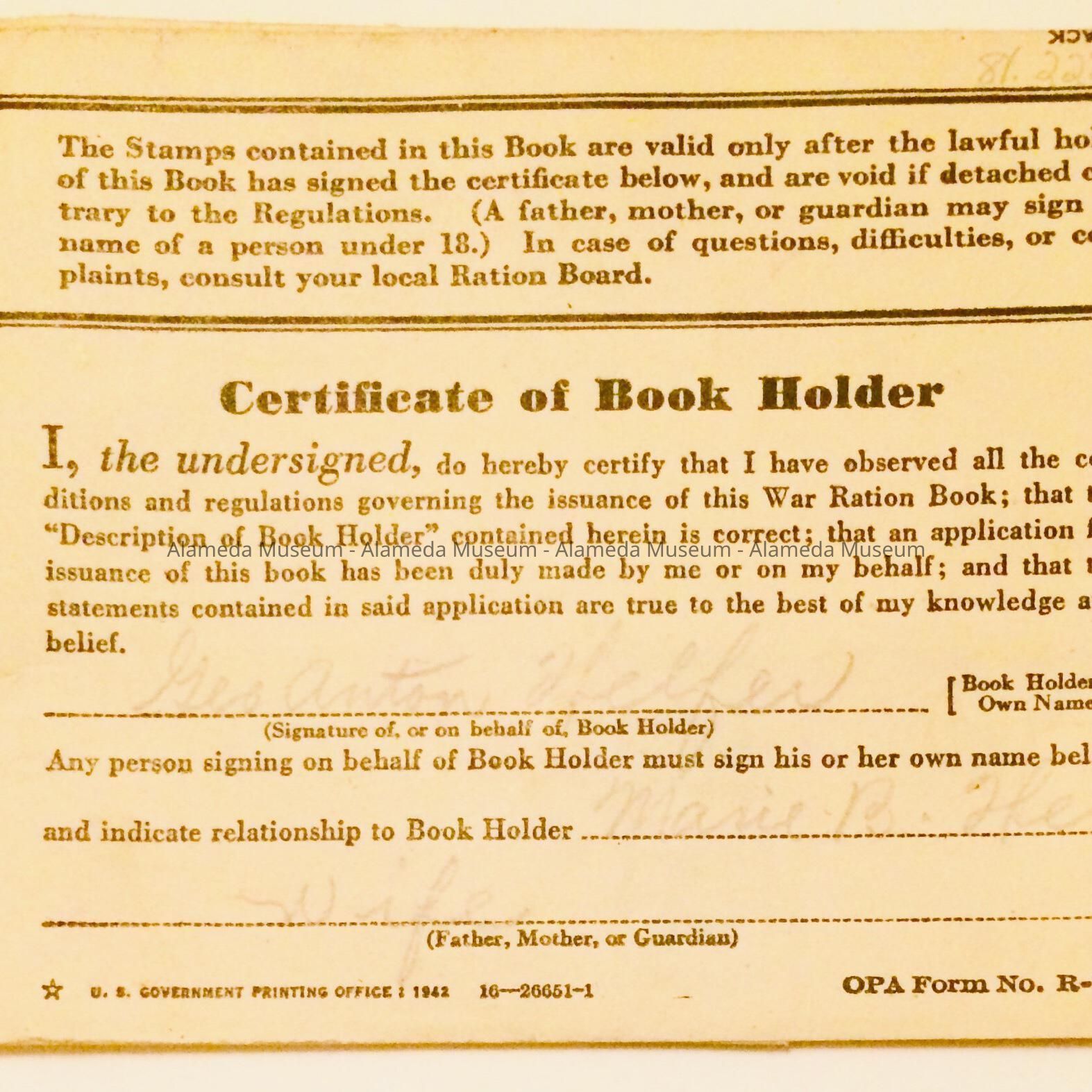 Description: The front of the Ration Book One contains the warning of misuse. Inside it says "Certificate of Registrar" The front cover also has the emblem of the United States. These were issued in the City Hall, Alameda. The registrar signs the book, and stamps the local board, county, and state.