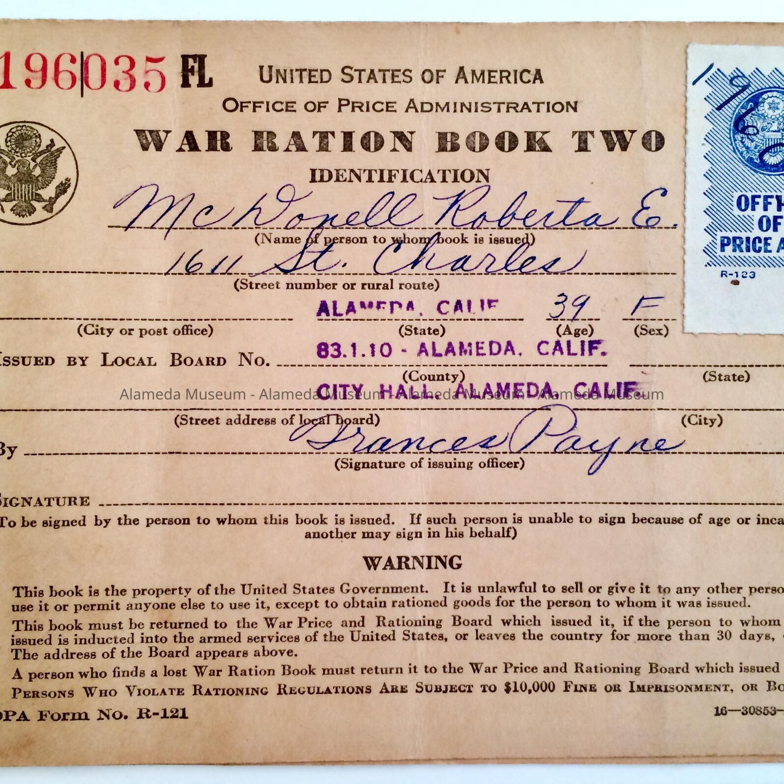 COVERLET TO A WAR RATION BOOK, ISSUED TO ROBERTA FRANCES MCDONELL (COVERLET ERRONEOUSLY ANNOTATED HER MIDDLE INITIAL AS "E"), 1611 ST CHARLES ST, ALAMEDA.