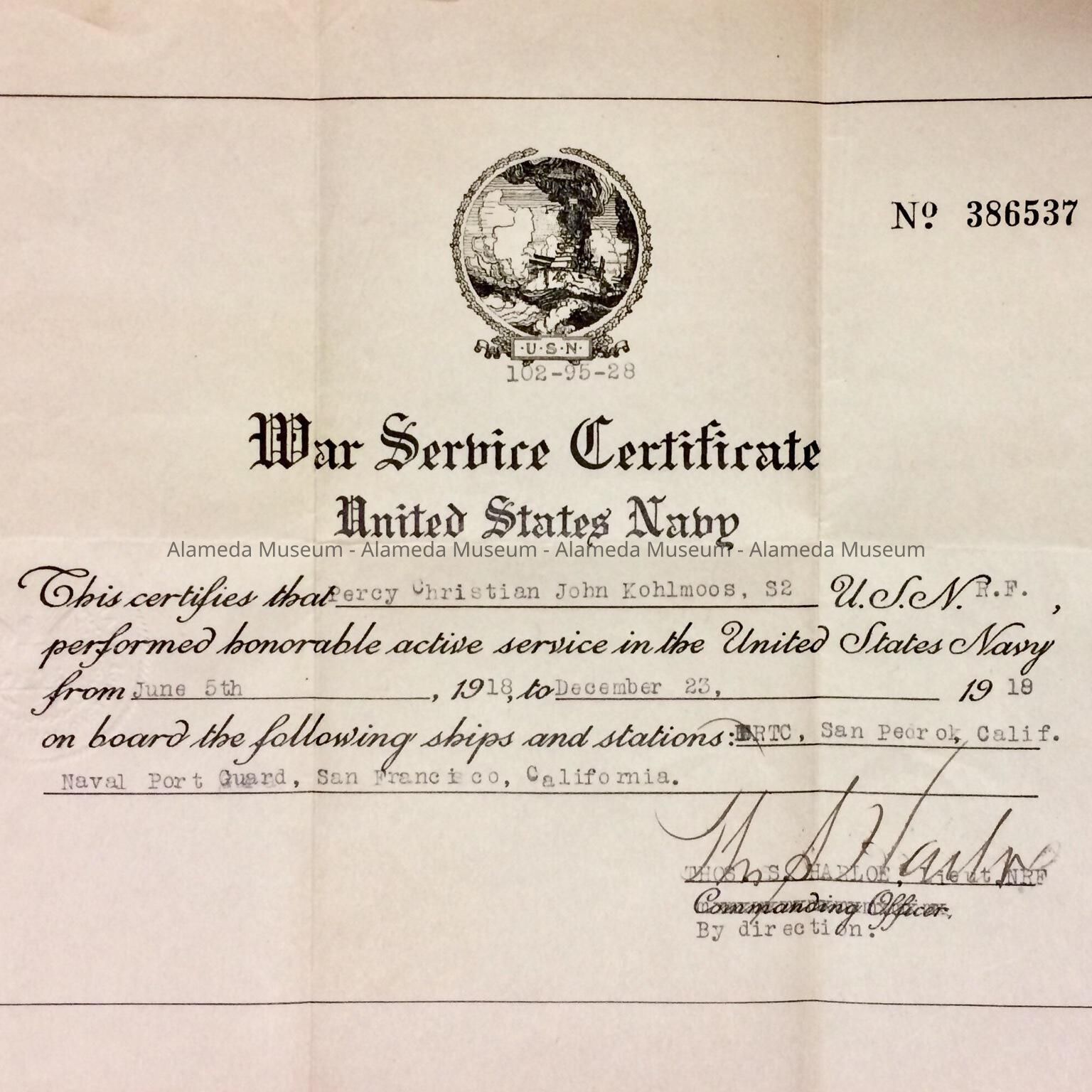 History of Object: A War Service Certificate, U.S. Navy, documenting the period of June 5, 1918 to Dec. 23, 1918, that was issued to Percy ("Pete") Kohlmoos, the father of the donor, John Kohlmoos.