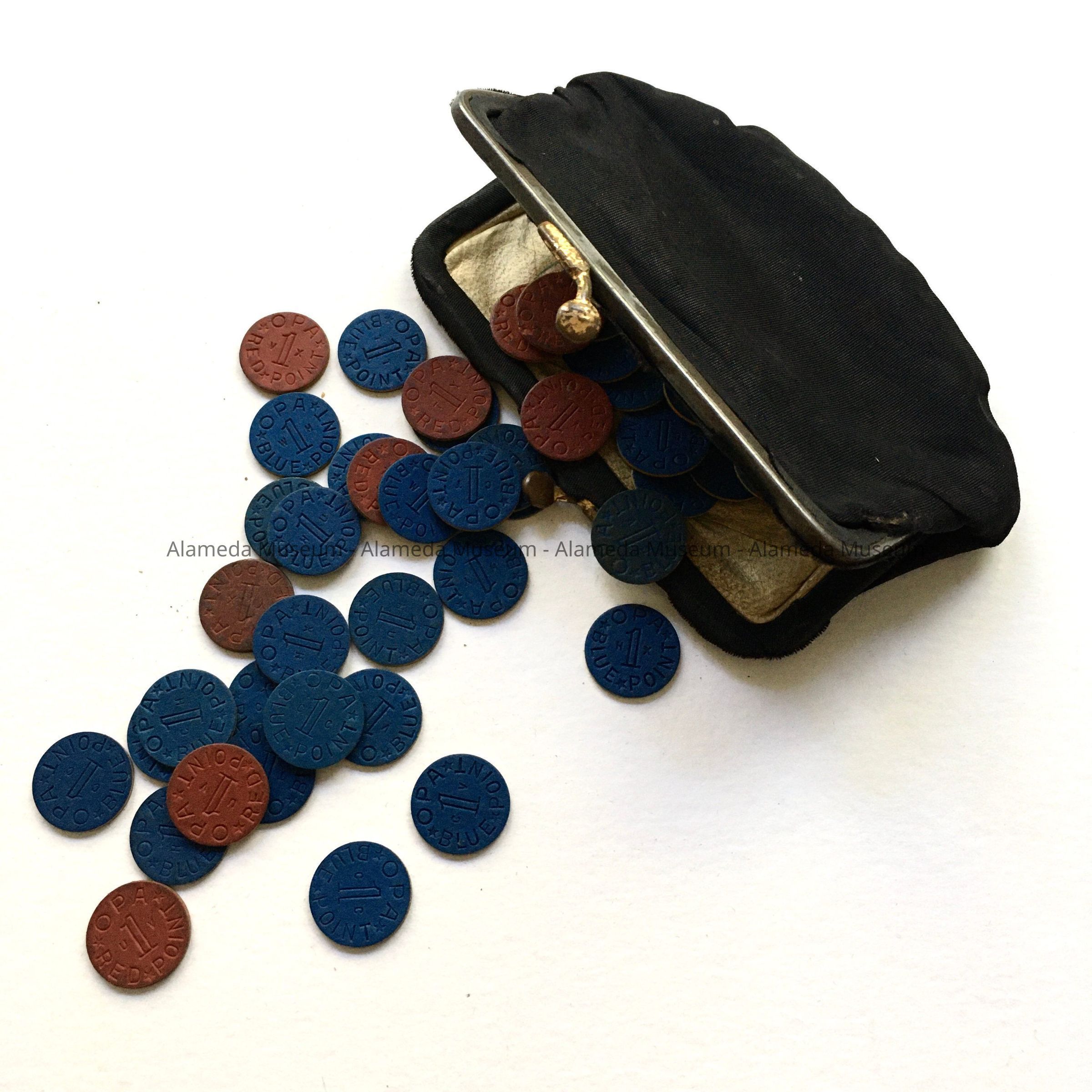 Description: Embossed wood tokens ½ inch across. The red one says OPA red point 1, and the blue one says OPA blue point 1. All contained within an old coin purse.