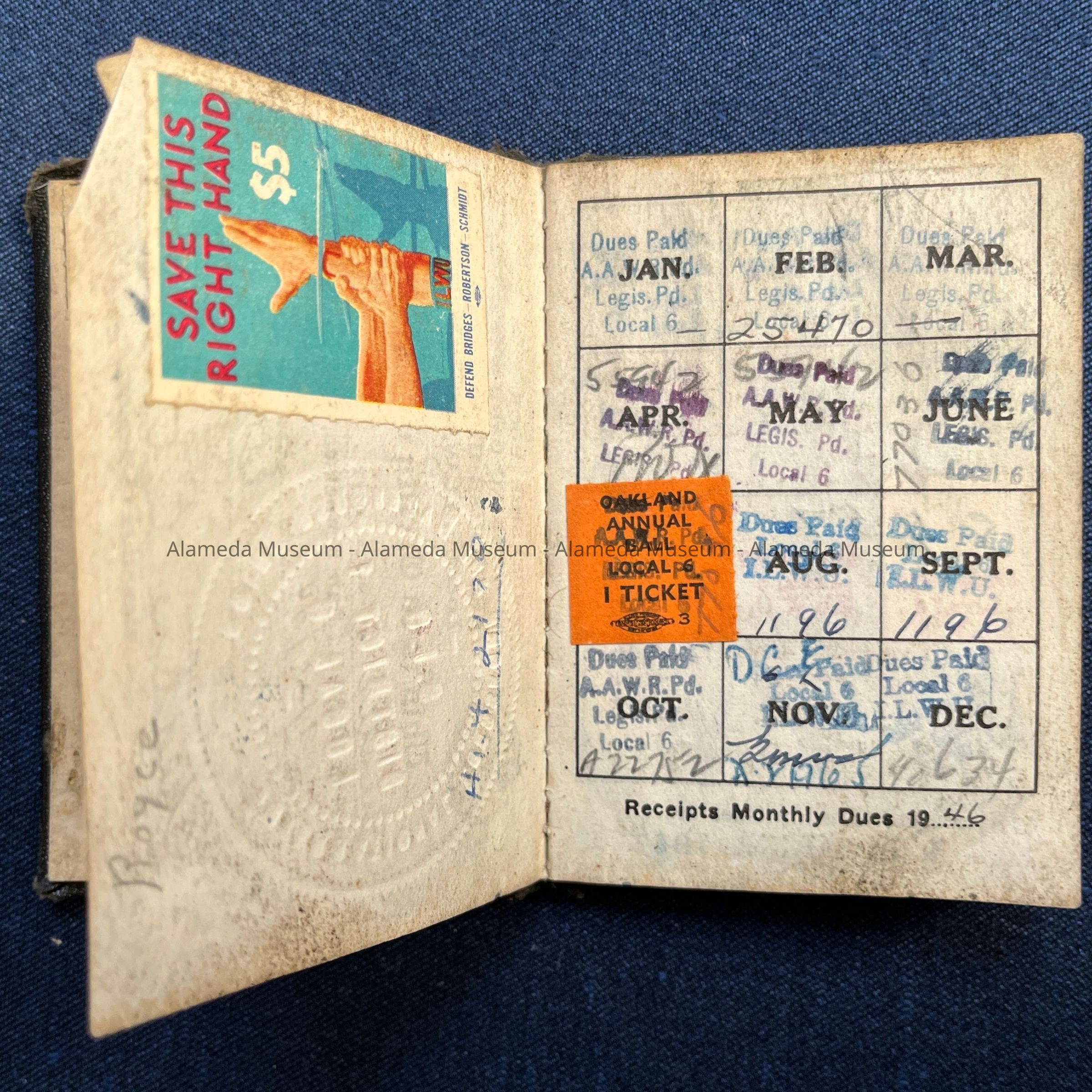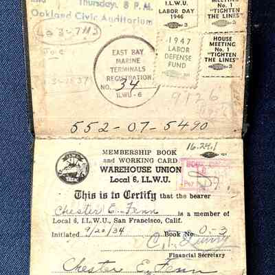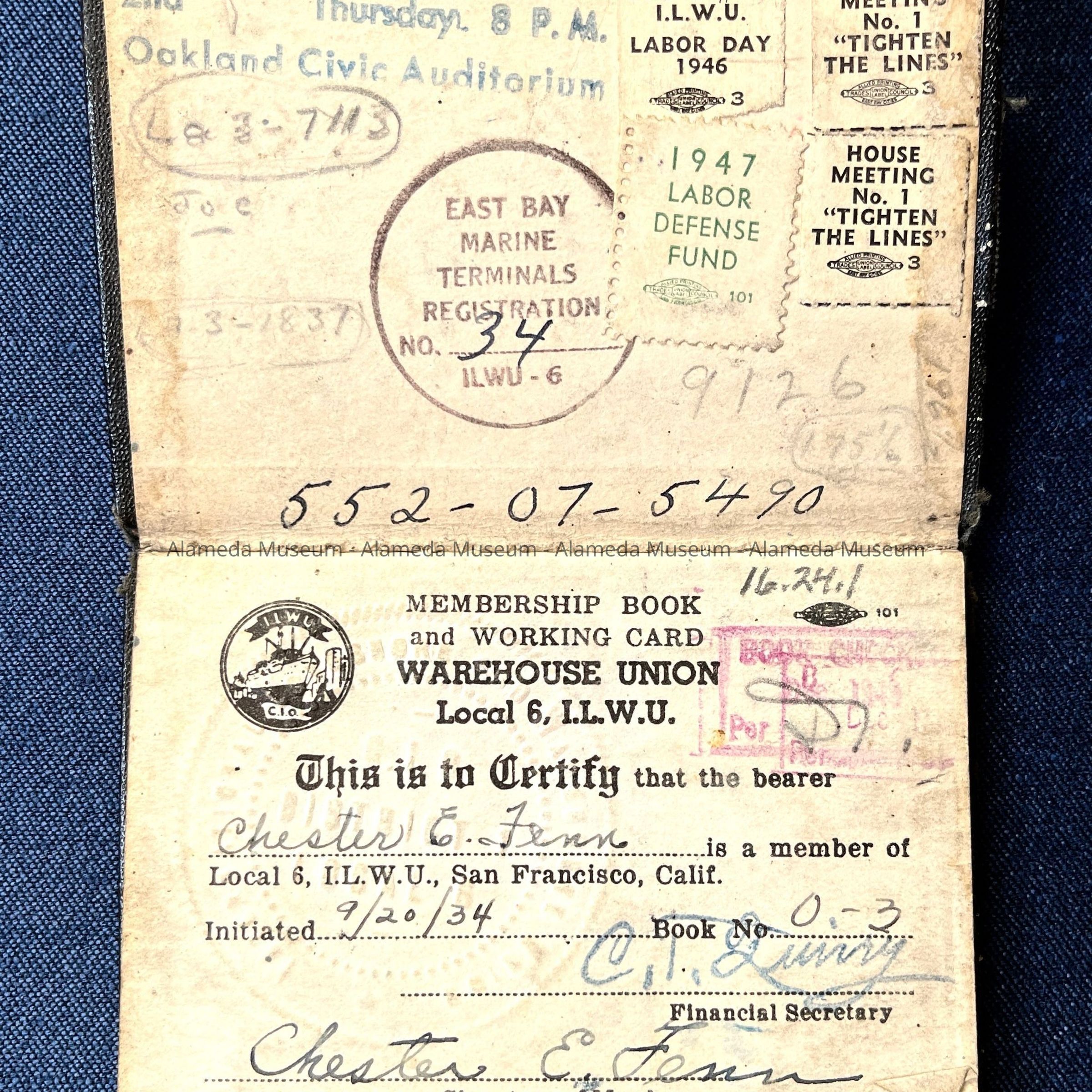 HISTORY OF OBJECT: A MEMBERSHIP BOOK AND WORKING CARD, WAREHOUSE UNION LOCAL NO. 6, ILWU, INITIATED SEPTEMBER 20. 1934 AND ISSUED TO CHESTER E. FENN, LONGTIME RESIDENT OF ALAMEDA. THE FENN FAMILY RESIDED AT 2038 ALAMEDA AVENUE.