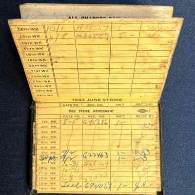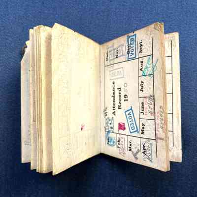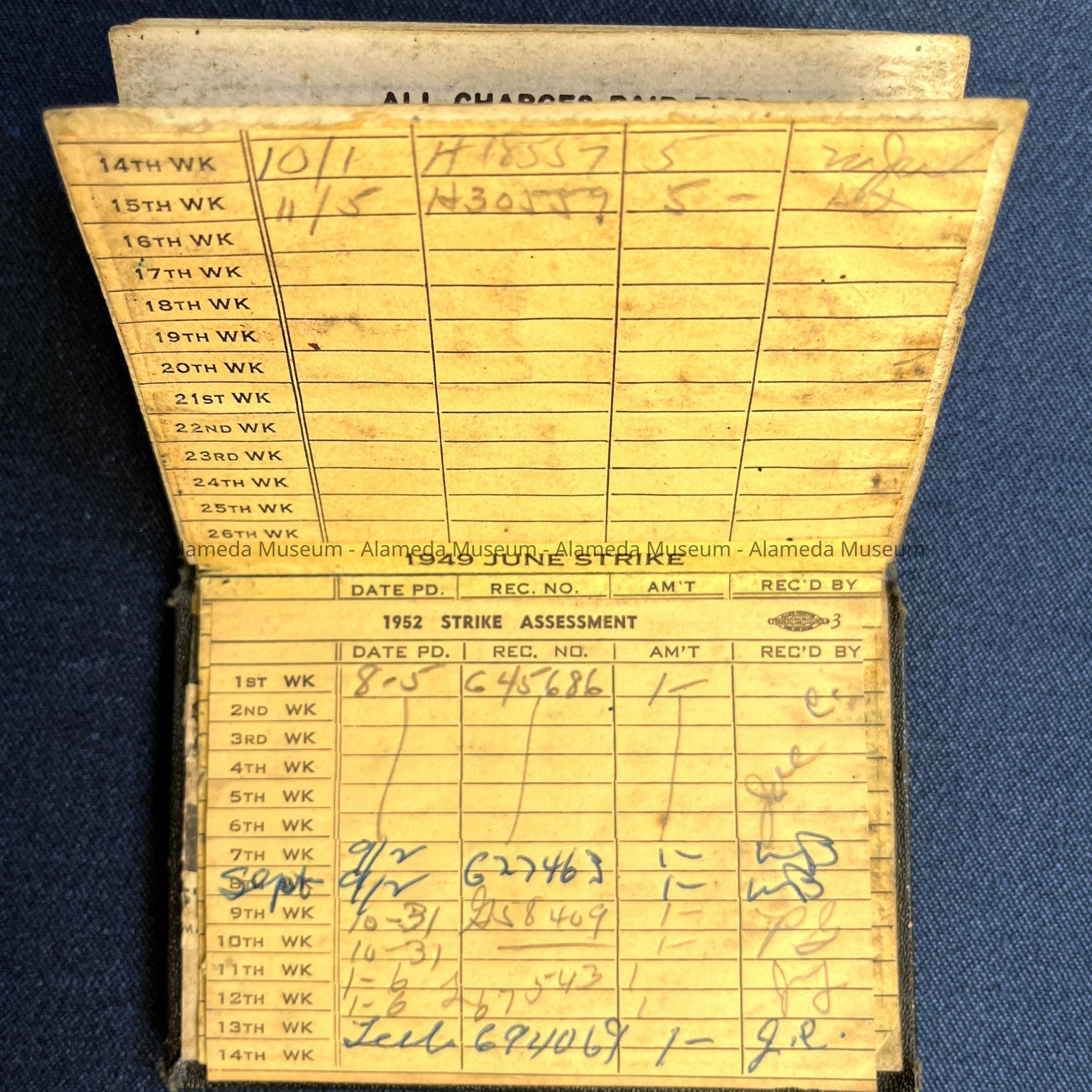 DESCRIPTION: A SOFT-BOUND BOOKLET CONTAINING STAMPED RECORDS OF DUES. COVER APPEARS TO BE DARK BROWN BUCKRAM.