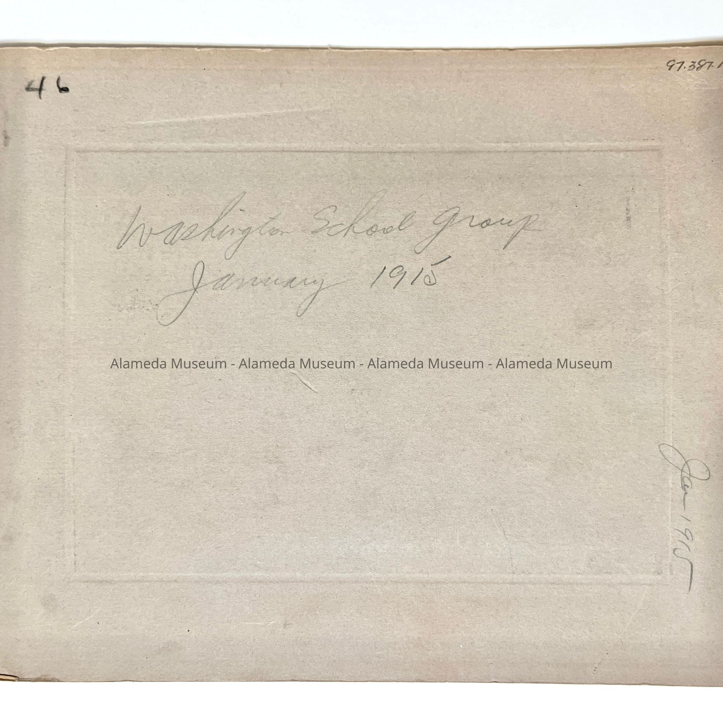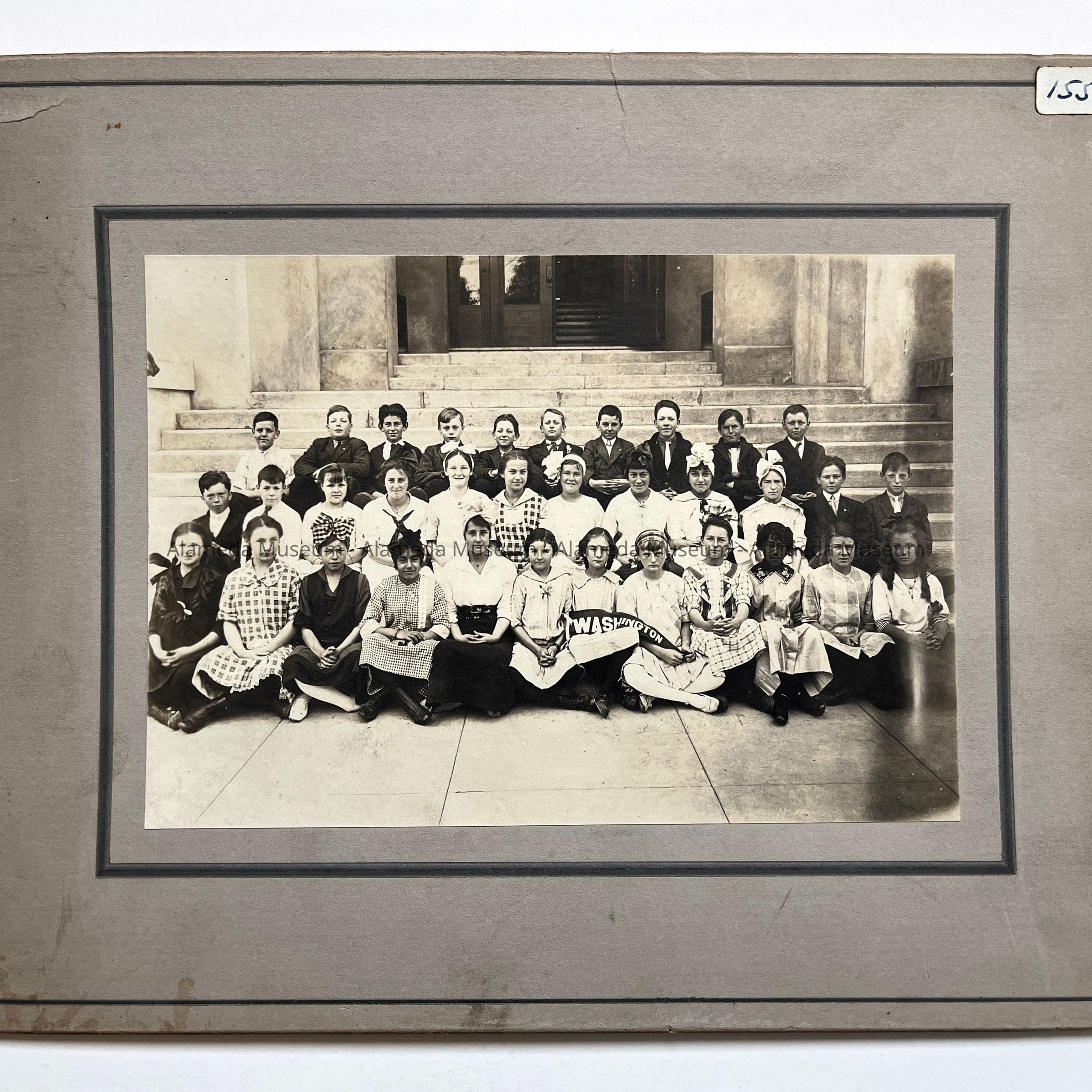 Description: Black/white photo mounted on grey paperboard having two dk. blue imprinted borders. Photographer unknown. The mounting has an old white cataloging label glued to its upper right corner.
