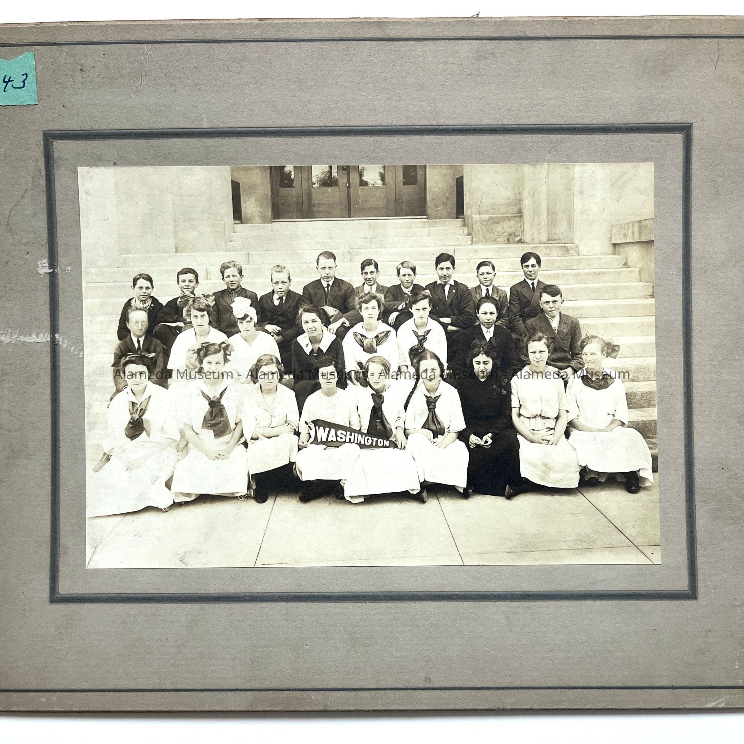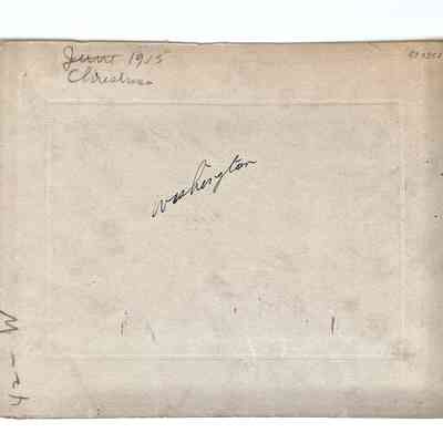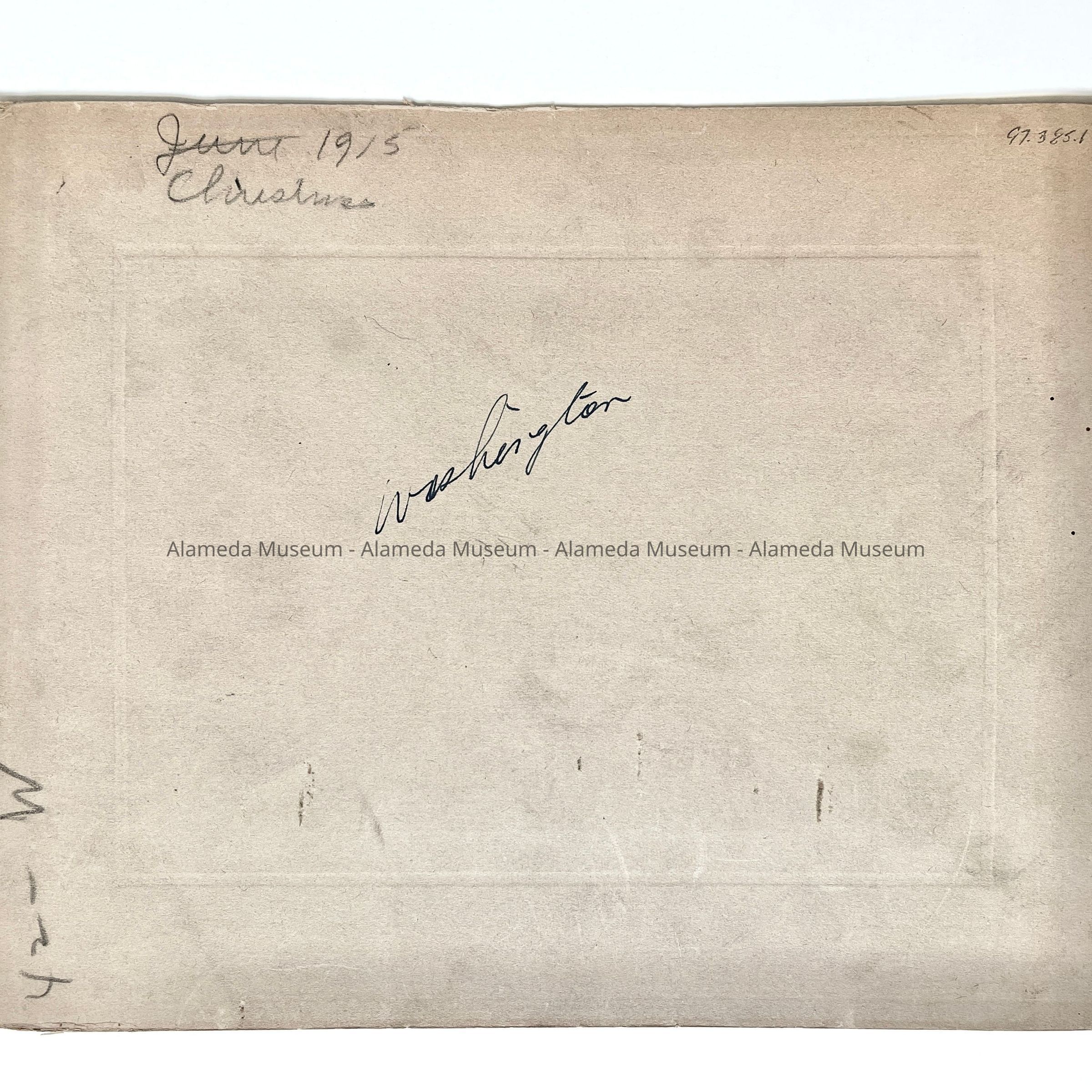 Description: Yellowish-toned black/white photo mounted on lt. grey paperboard having two dk. blue imprinted borders. Photographer unknown. The image is somewhat faded. The mounting has an old green cataloging label affixed to the upper left corner as well as some scuffing and spotting.