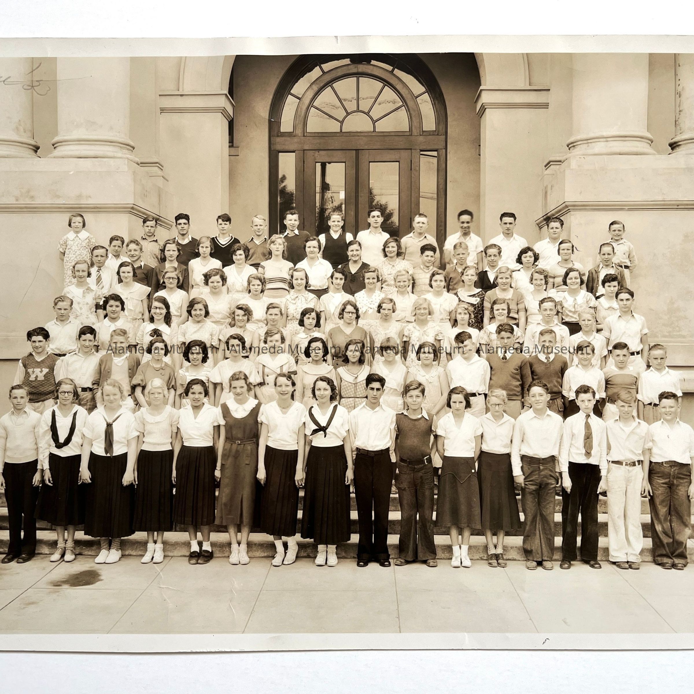 Verso has handwritten a number of inscriptions written in different handwriting in pencil, and is stamped: Piatt Photo Company, phone Alameda 3560. Students are not identified.