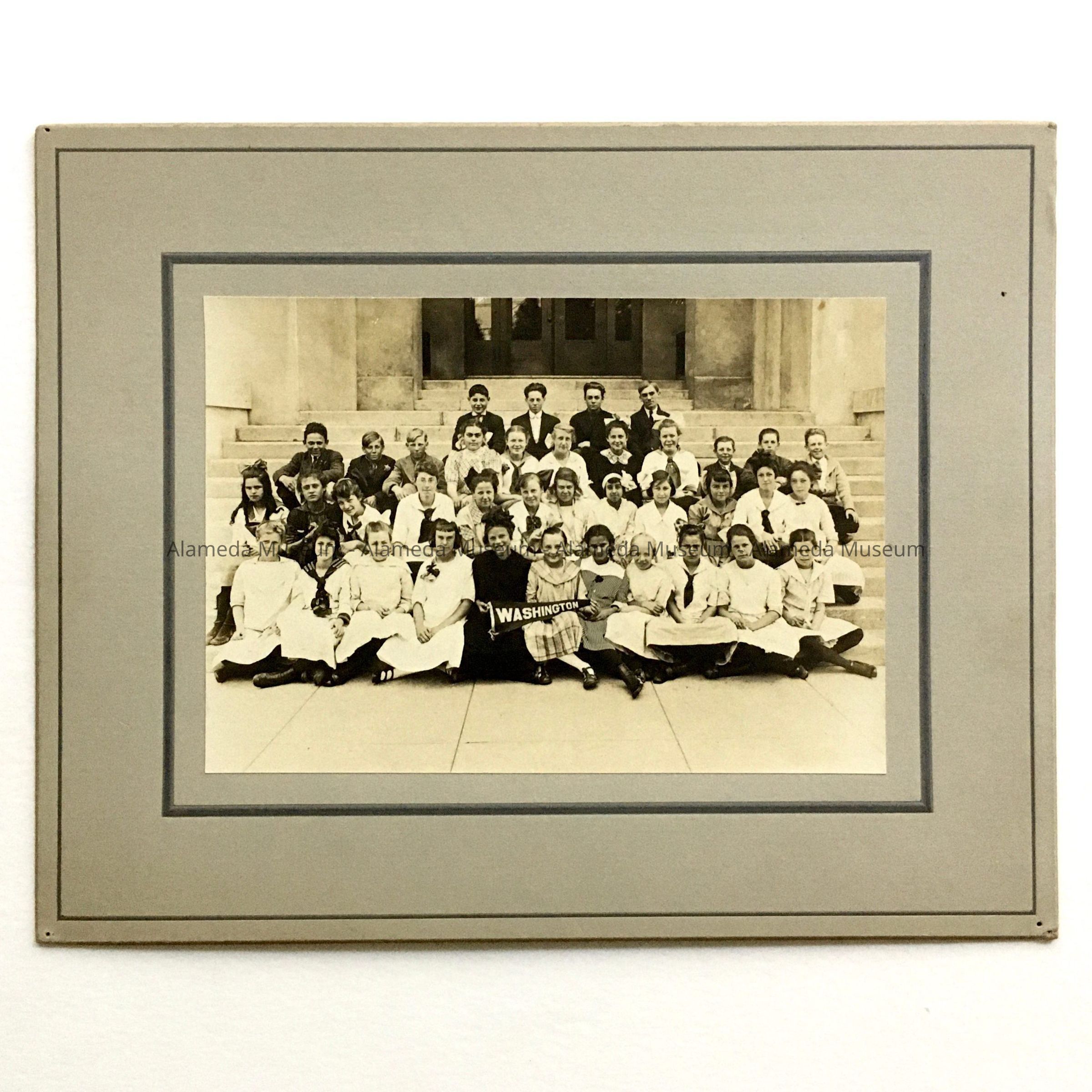 Description: Sepia-tinted non-glossy photo of a group of children and one woman, posing on steps of a building. Two of the children hold up a pennant stating 'Washington'. Some of the girls are wearing sailor dresses and have big bows in their hair. Photo is mounted (glued) to a backing of grey cardboard with darker grey borders. On reverse is written: 45-W.