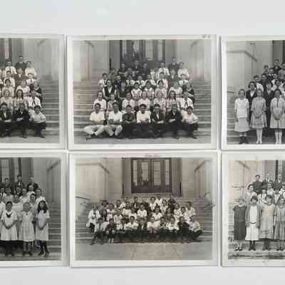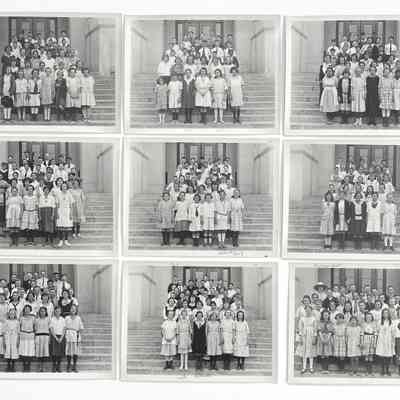 History of Object: Series of Washington School class photos taken during the same time frame showing groups of students posed upon the school's front entrance steps. Images #p and #q are identical. Few of the students are identified.