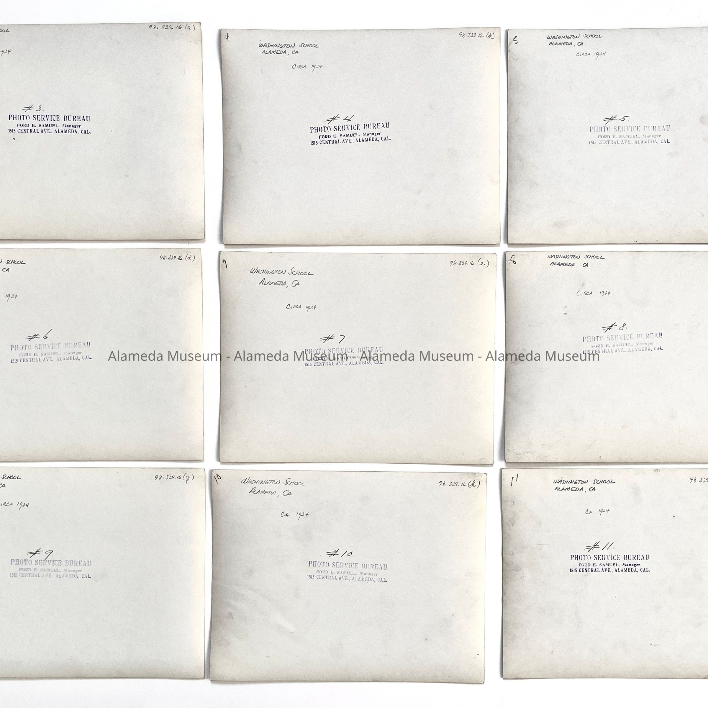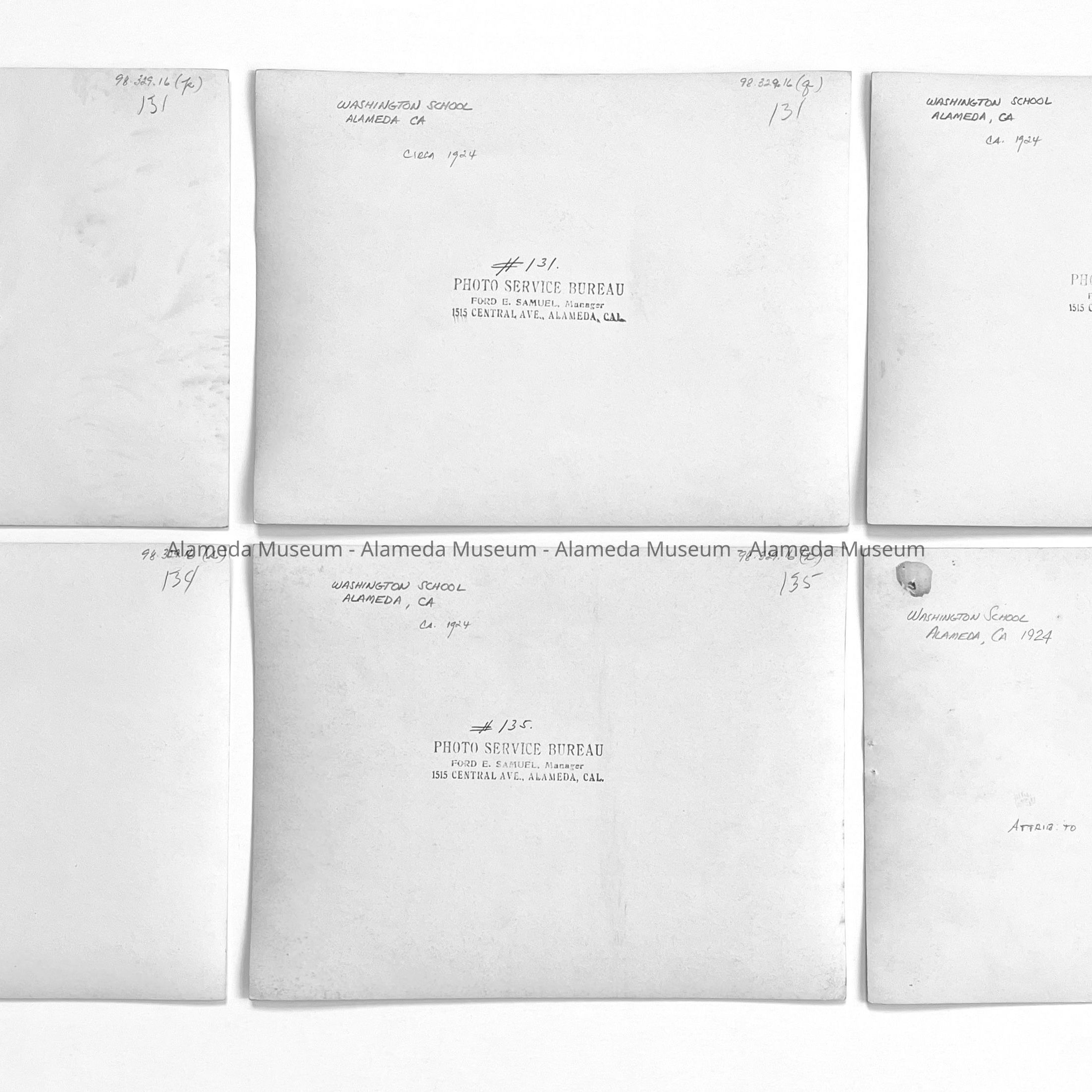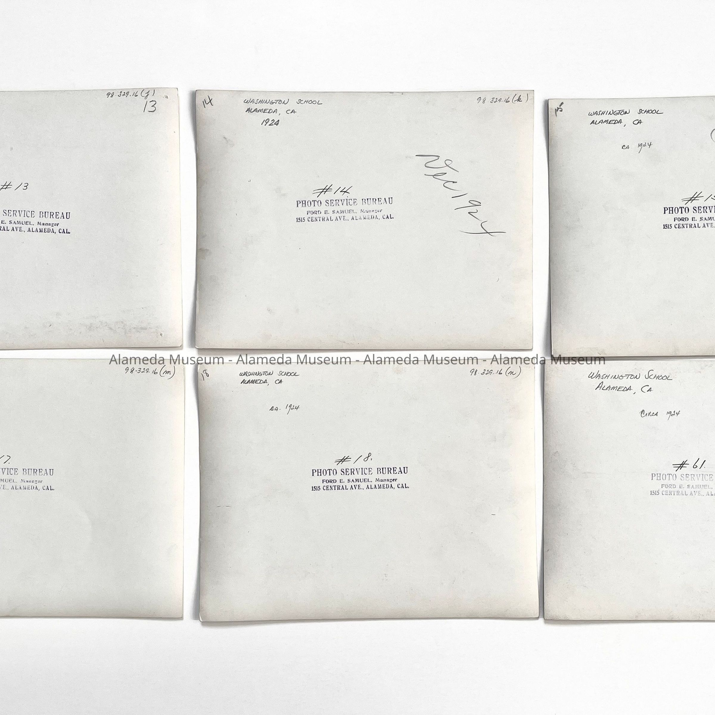 Description: Series of black/white semi-glossy photos, unmounted: Photographer: Ford E. Samuel (Photo Service Bureau), 1515 Clinton Ave., Alameda (per blue ink-stamped name on verso of all but image #u). Images are hand number in black ink on the verso (except none on u), ranging from #3 through #135. Ten of the images have identifying notiations written upon their face in black ink.