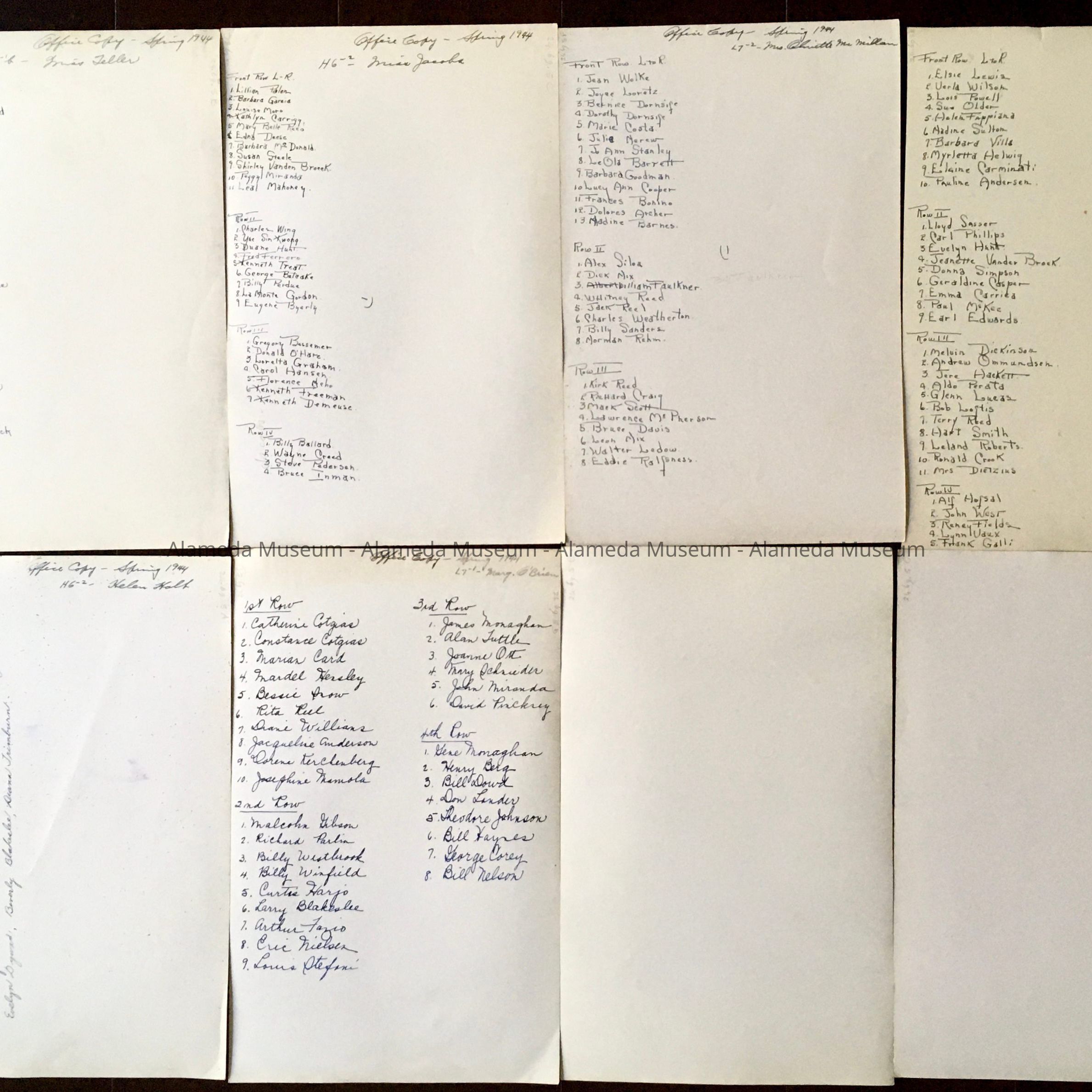 History of Objects: Photos of Washington School classes L6-2 (teacher Helen Holt); H6 (Miss Teller); H6-2 (Miss Jacoba); L7 (Marg. O'Brien); L7-2 (teacher and students not identified); L72B (Mrs. Olibietti / Mr. Millan); L8, H8 (not identified); H8D (Mrs. Dietzius). Some of these have duplicates already in the collection.