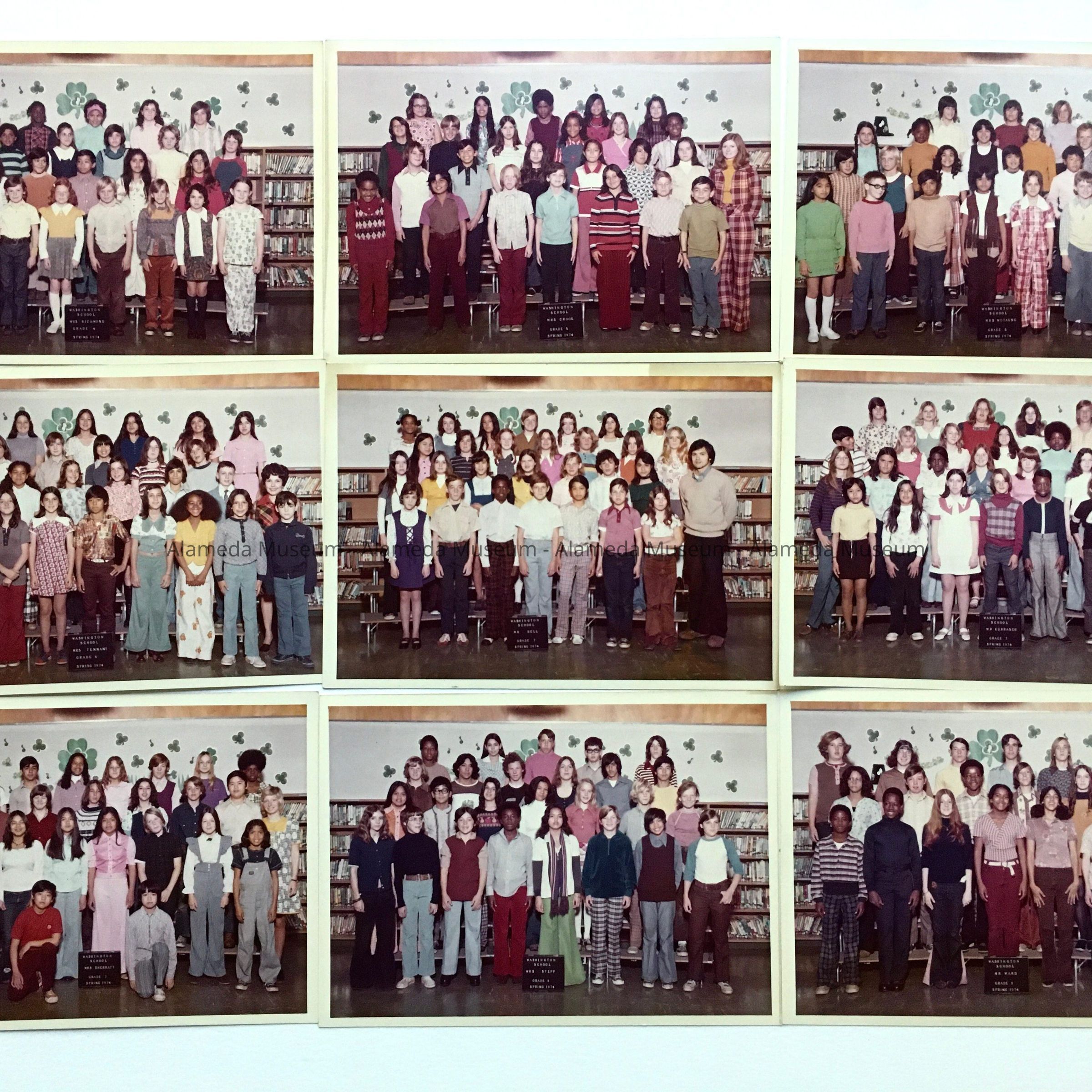 History of Objects: Class photos of Washington School, Spring 1974: A: Grade 4, Mrs. Richmond; B: Grade 5, Mrs. Crook; C: Grade 5, Mrs. Motaung; D: Grade 6, Mrs. Tennant; E: Grade 7, Mr. Bell; F: Grade 7, Mr. Kurrash; G: Grade 7, Mrs. Sherratt; H: Grade 8, Mrs. Stepp; I: Grade 8, Mr. Ward.
