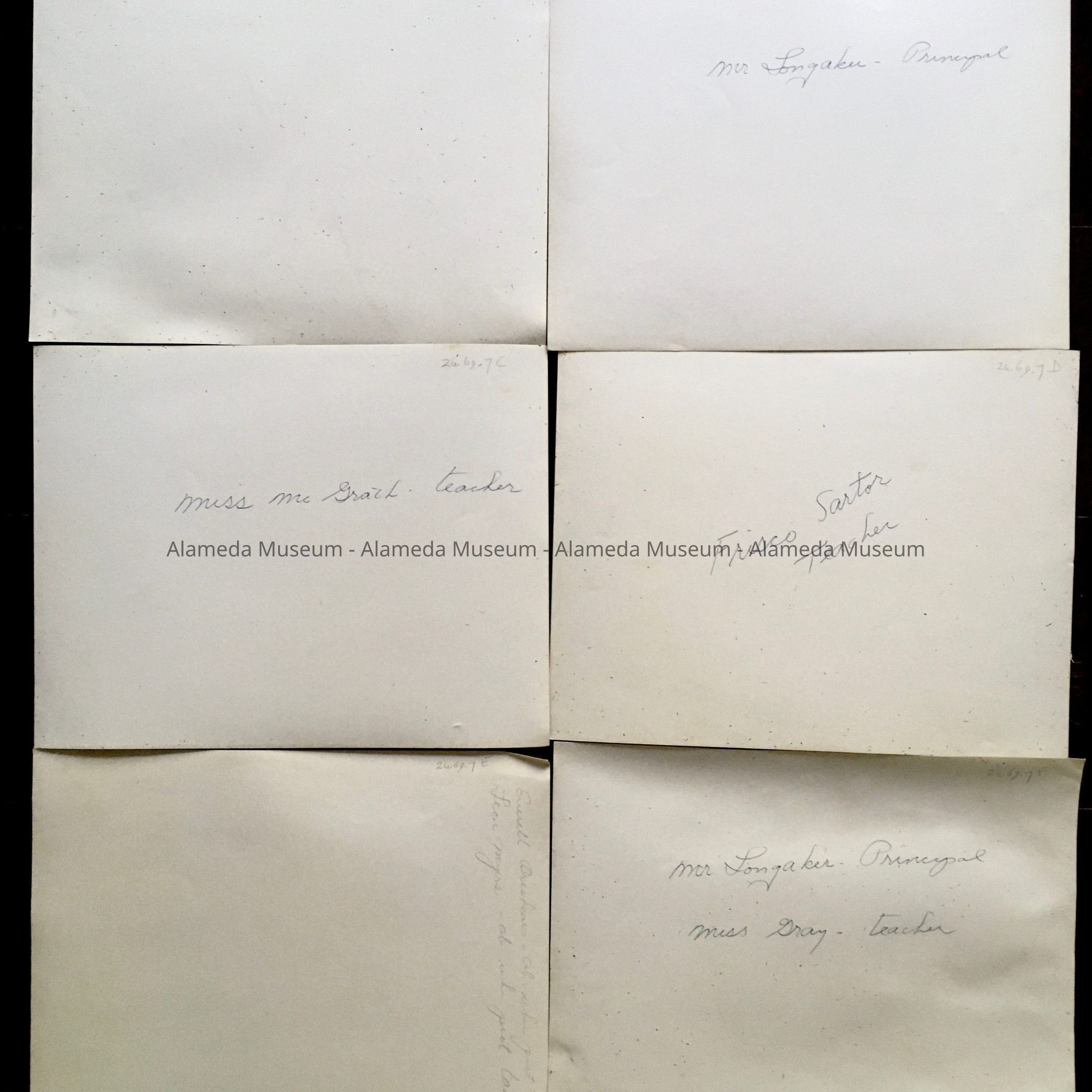 History of Objects: Photos of Washington School classes: Low Fifth (A); 2 different photos of High Fifth (B - Mr. Longaker-Principal; C - Miss Grath- Teacher; possibly one of these was Spring, the other Fall?); Low Seventh (D - Frisco Sartor Teacher); High Seventh-low Eighth (E); High Eighth (F - Mr. Longaker Principal; Miss Dray - Teacher)